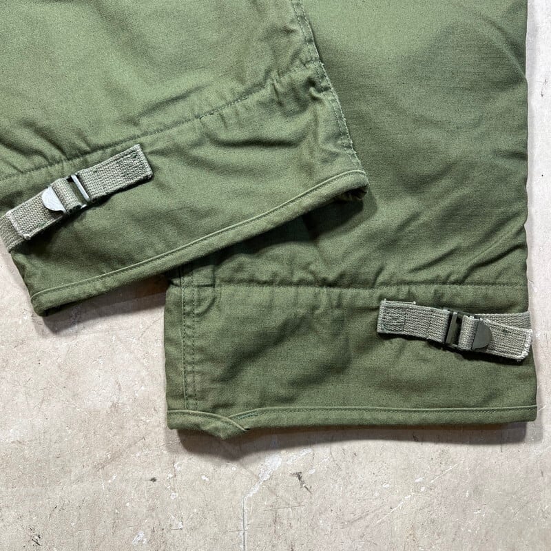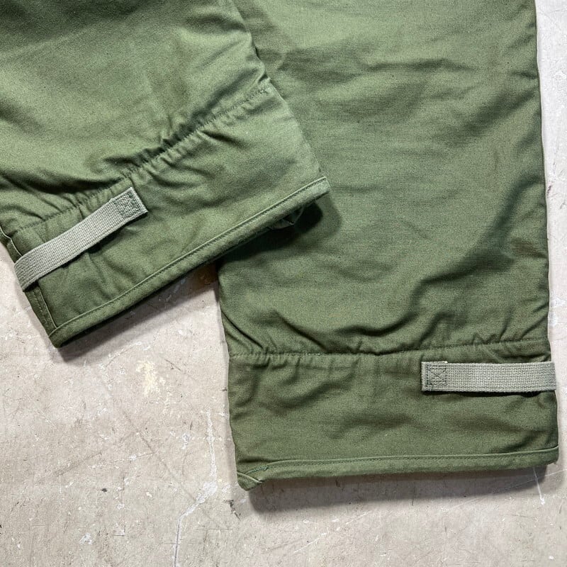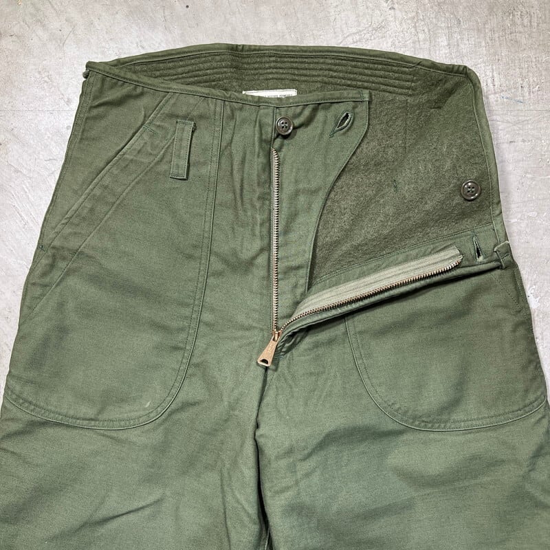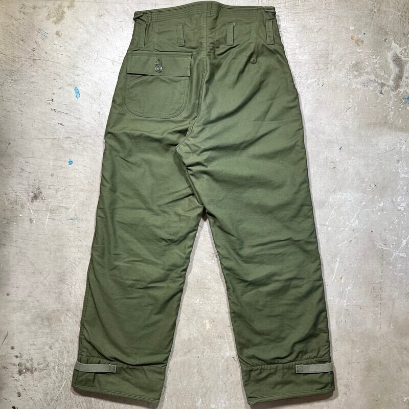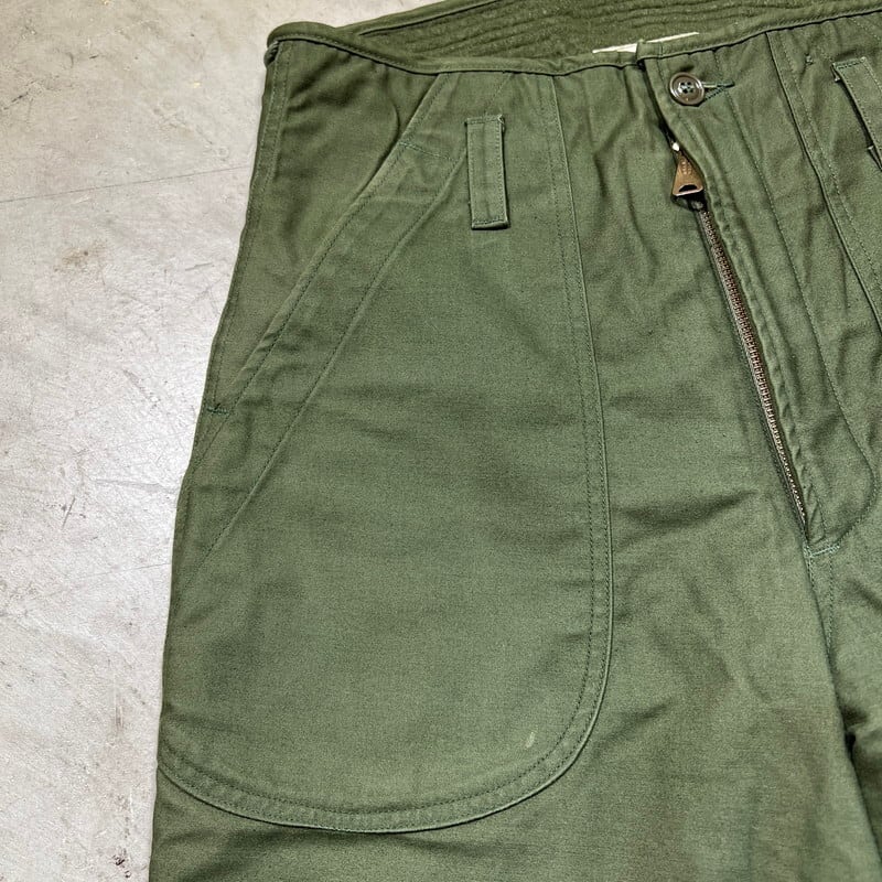 70年代のU.S.NAVY A-2デッキパンツです。DLA100-78-C-1015、 ALAMO MFG CO製。ご紹介するこちらは、N-1デッキジャケットの後継として60年代初頭に導入されたA-2デッキジャケットとペアのアイテムです。ややハイウェストな作りで、一見ベイカーパンツののようなデザインです。生地はM-65等と同じコットンナイロンの混紡です。引手が大き目なGRIPPER ZIPPERが使用されています。A-デッキジャケット同様のライニングが付く防寒仕様です。目立ちにくい汚れや細かな擦れはございますが、コンディションの良い個体です。サイズはSMALLで27~30という表記がございますが実寸はW32インチです。裾にアジャスターが付きますので、ロールアップまたはアジャスターで絞って着用していただけます。防寒用のパンツですが、ごわっとしたシルエットではありませんので、タウンユースとしても使いやすいと思います。ベイカーパンツにも似たデザインで合わせやすいのでお探しだった方は是非いかがでしょうか。