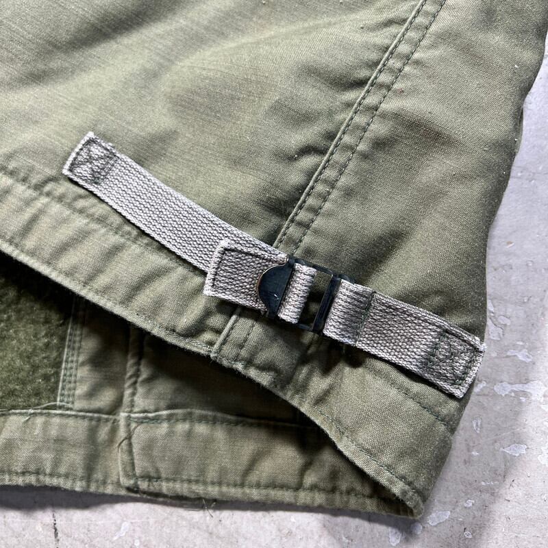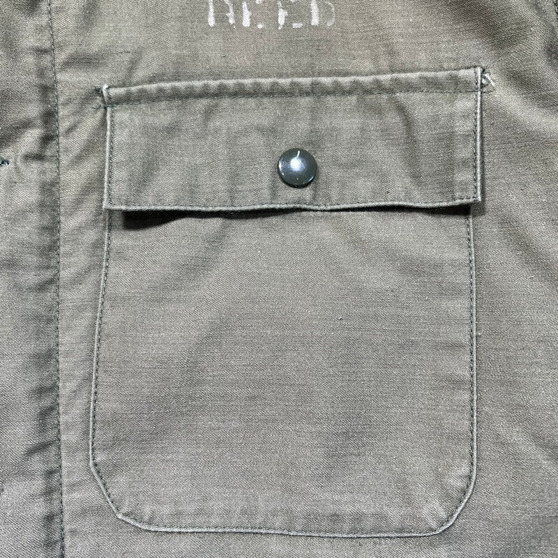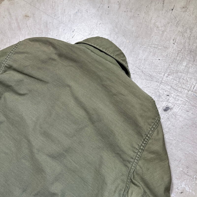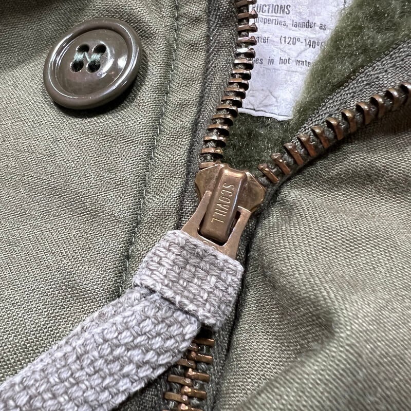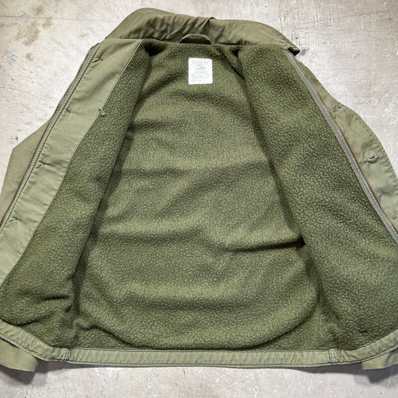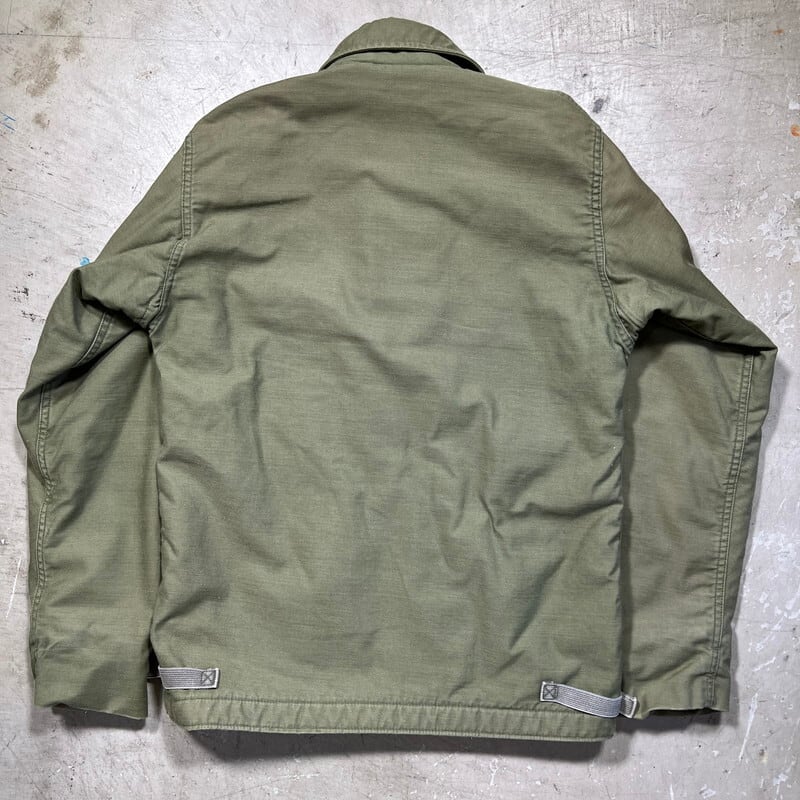 80年代のU.S.NAVY A-2デッキジャケットです。 DLA100-85-C-0607、SO-SEW STYLES INC製。N-1デッキジャケットの後継として60年代初頭に導入されたアイテムで、A-2の初期型は胸のポケットのフラップの形状が三角となります。こちらは85年コントラクトの後期モデルとなります。ジッパーはSCOVILL社のベル型が採用されています。胸元にネームと思われるステンシルが入ります。肩回りにヤケやうっすらとペンキ汚れはございますが、特筆するダメージはございません。ナイロンのライニングに若干毛玉はございますがコンディションは良好です。サイズはSMALLで、一つ前にUPしたデッキパンツとのセットアップ着用も可能です(色味はこちらのジャケットの方が若干薄いです)。後年のモデルですが雰囲気の良いアイテムですので、小さいサイズをお探しだった方は是非この機会にいかがでしょうか。