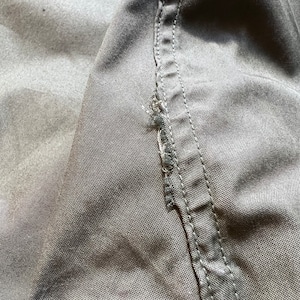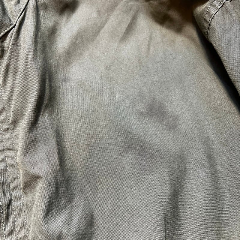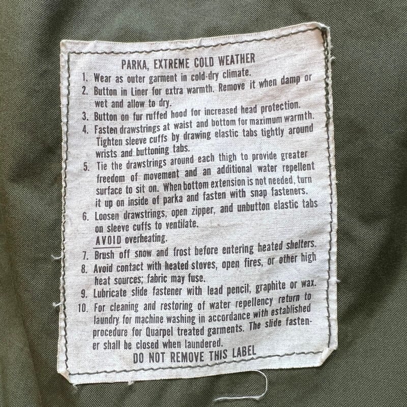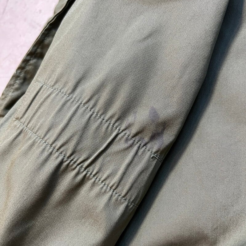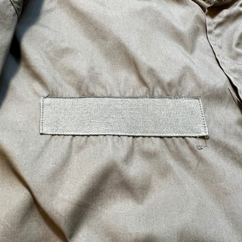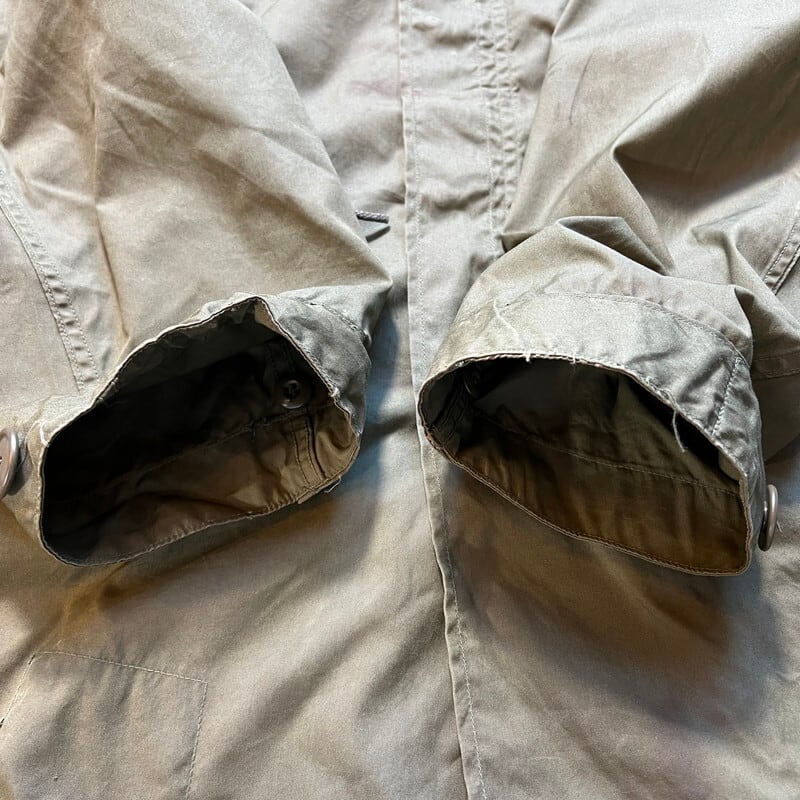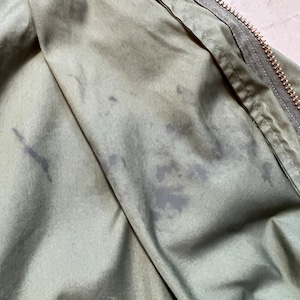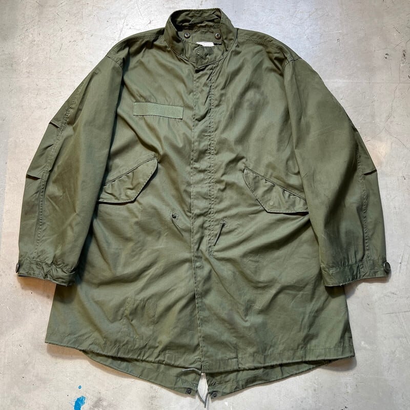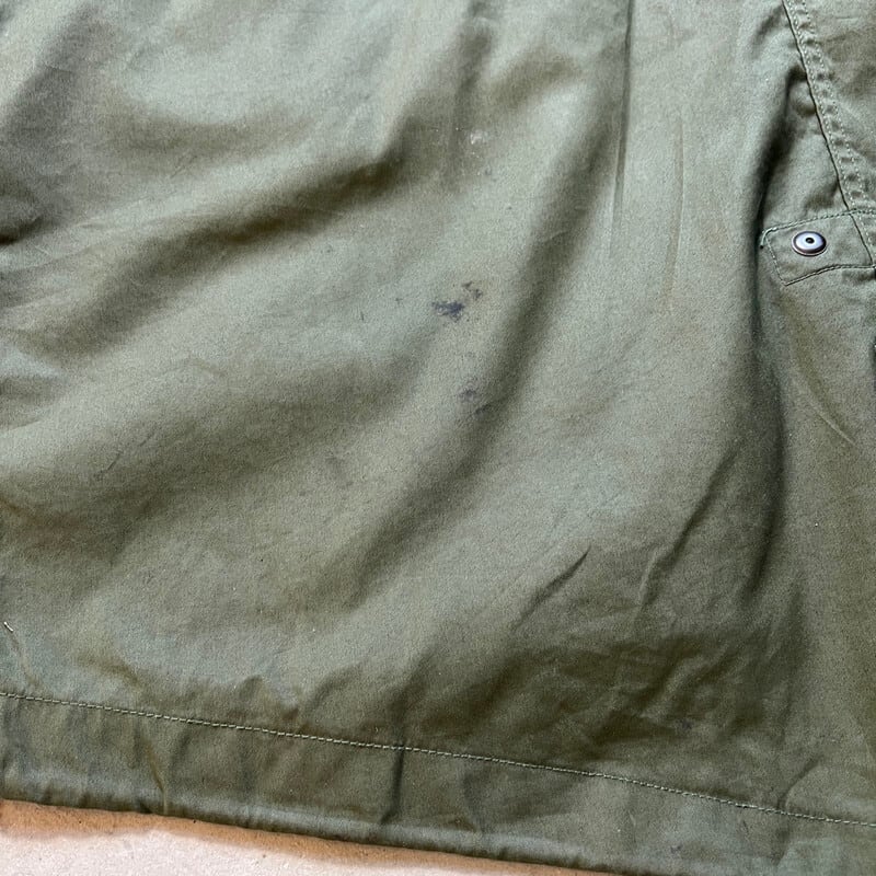 70年代頃のPARKA EXTREME COLD WEATHER フィッシュテールパーカーです。DSA100-74-C-0168、VANDERBILT SHIRT社製。M-1951モッズコートの後継モデルのこちらは、フード、ライナーが付かないシェル本体のみとなっています。フロントは社名刻印の入らないブラスジッパーが採用されており、差し込み部のダメージはございません。袖や背面等に黒っぽい汚れや白っぽい擦れ等ございます(黒っぽい汚れは内側にも染みてます)。右袖に縫製ミスによる生地のはみ出しが見られますが、今のところ着用に支障はございません。その他細かな使用感等ございますが、比較的コンディションの良い個体と思います。MEDIUM表記ですのでニーズも高いのでは無いでしょうか。一年を通して夏以外は使えるアイテムですので、ライニングだけを持っている方は是非この機会にいかがでしょうか。1着あると何かと合わしやすいのでお勧めです。