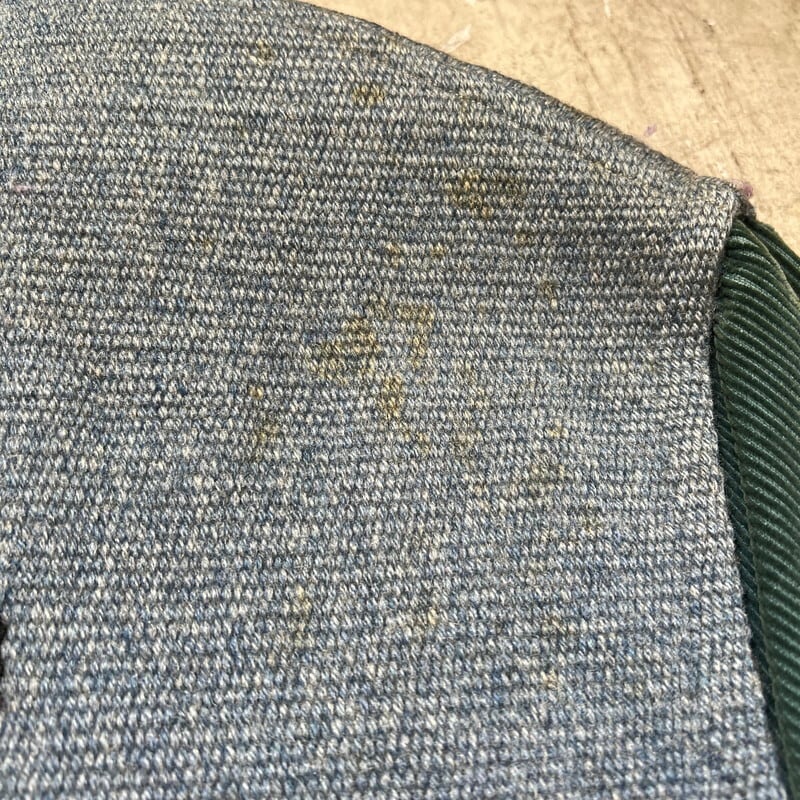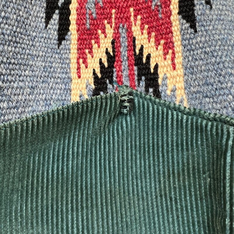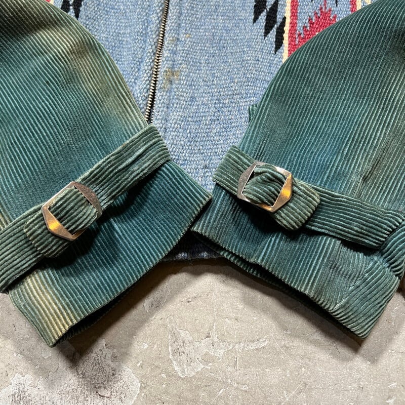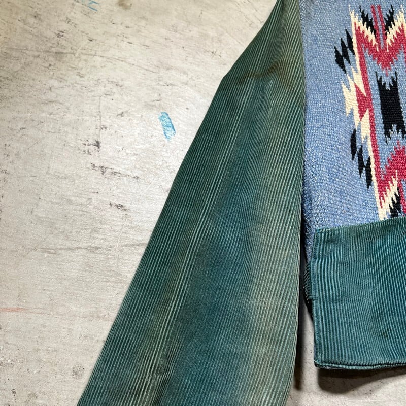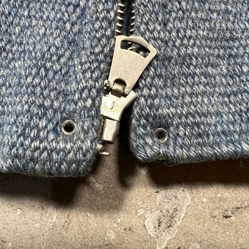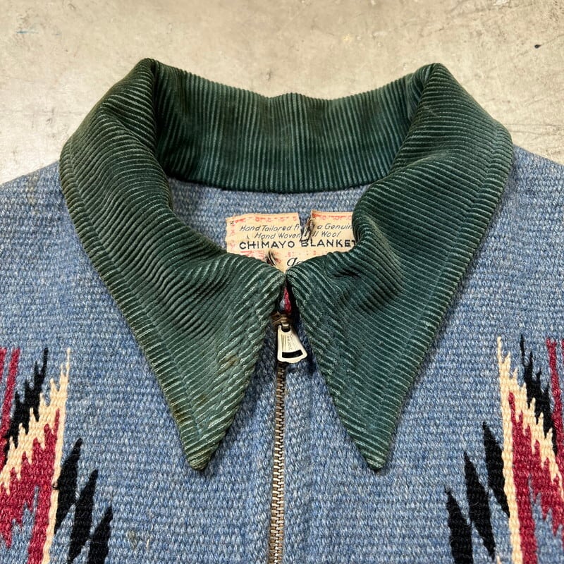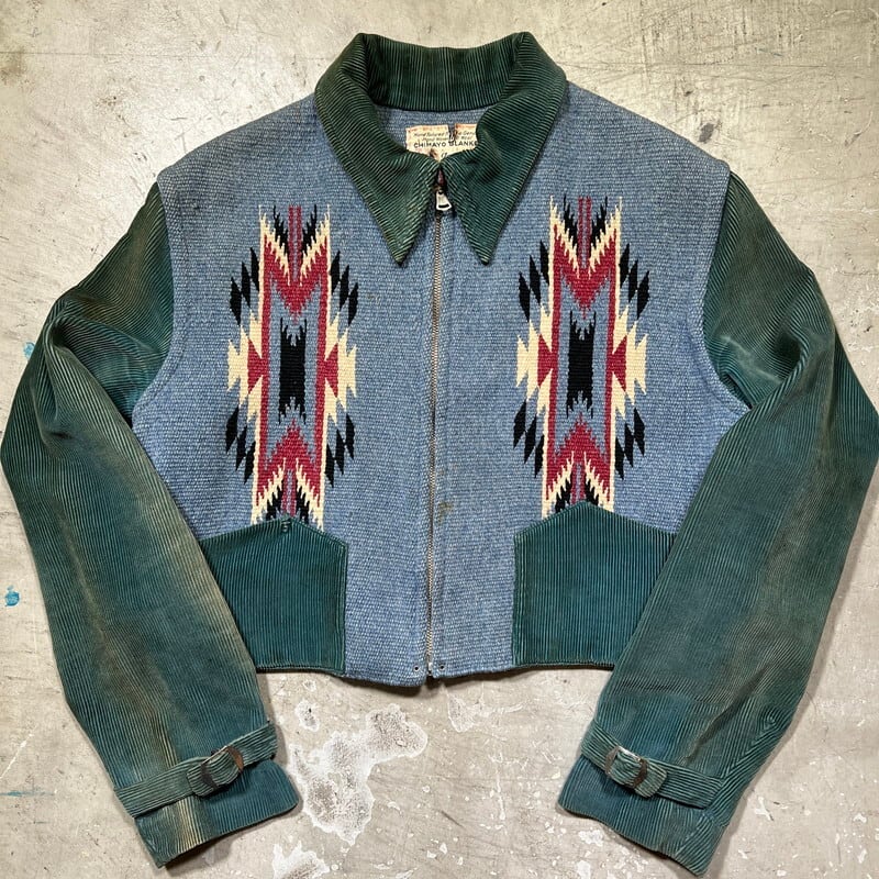 30年代のGanscraftチマヨジャケットです。Ganscraftは1915年ニューメキシコ州サンタフェで設立したJulius Gans’ Southwestern Arts and Crafts社のブランドです。コーデュロイとチマヨブランケットのコンビで、秀逸なデザインからコレクターも多いアイテムです。フロントはコの字エンドでハトメ付きの扇TALONが使用されています。ジッパーはめ込み部分に1935年4月を意味するD5刻印が入ります。ウエストサイドと袖先にはアジャスターが付きます。全体的に汚れやヤケ等があり、右ポケット縁にハンドリペアがございます。首元のタグには裂けがございます。背面に1箇所生地の継ぎ目のような窪みがございます。その他大きなダメージはございません。着丈は短いですが、袖は長めに作られています。細身な男性または女性に丁度良いサイズです。タックインしたハイウェストデニムにジャストで羽織ると非常に雰囲気も出ます。逆に着丈の長いトップスと合わせてレイヤードスタイルを楽しんでも良いかもしれません。90年近く前の希少なアイテムですので、コレクションとしても魅力的なアイテムです。