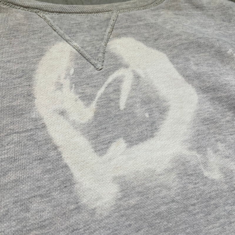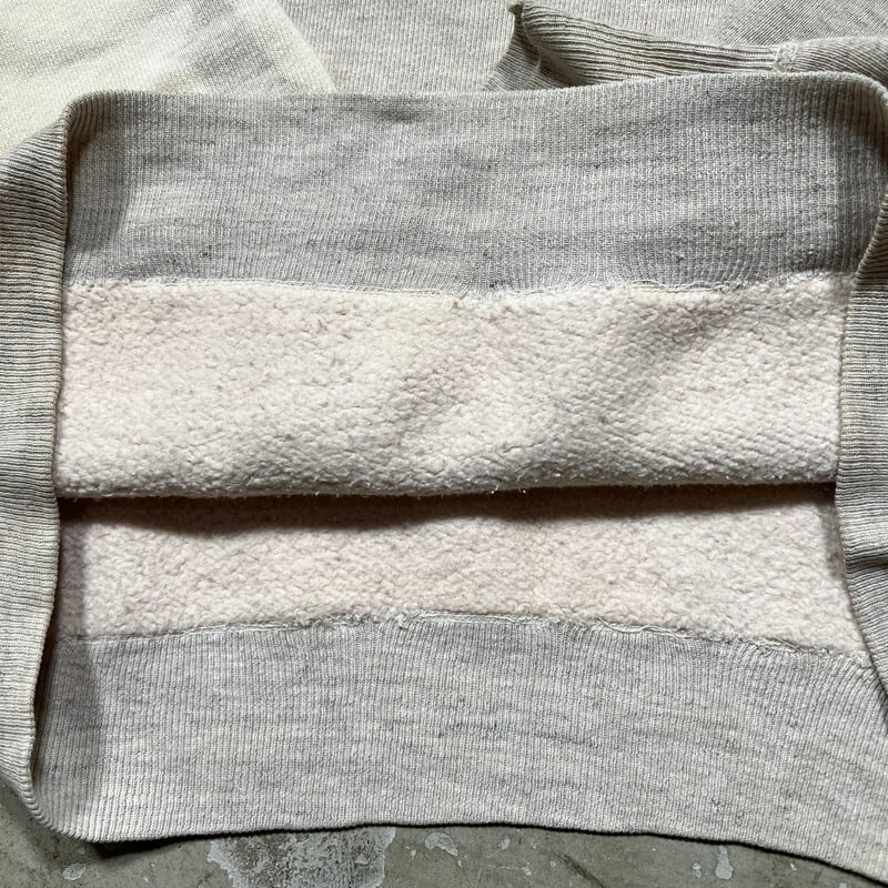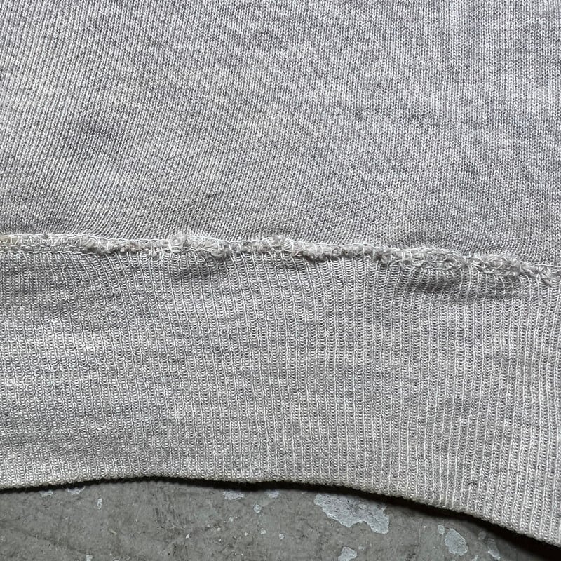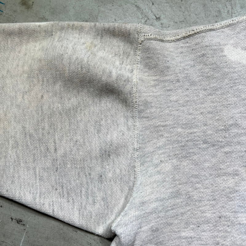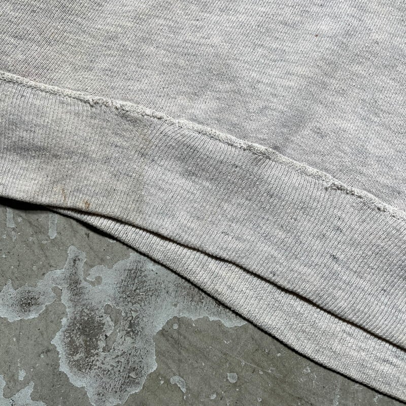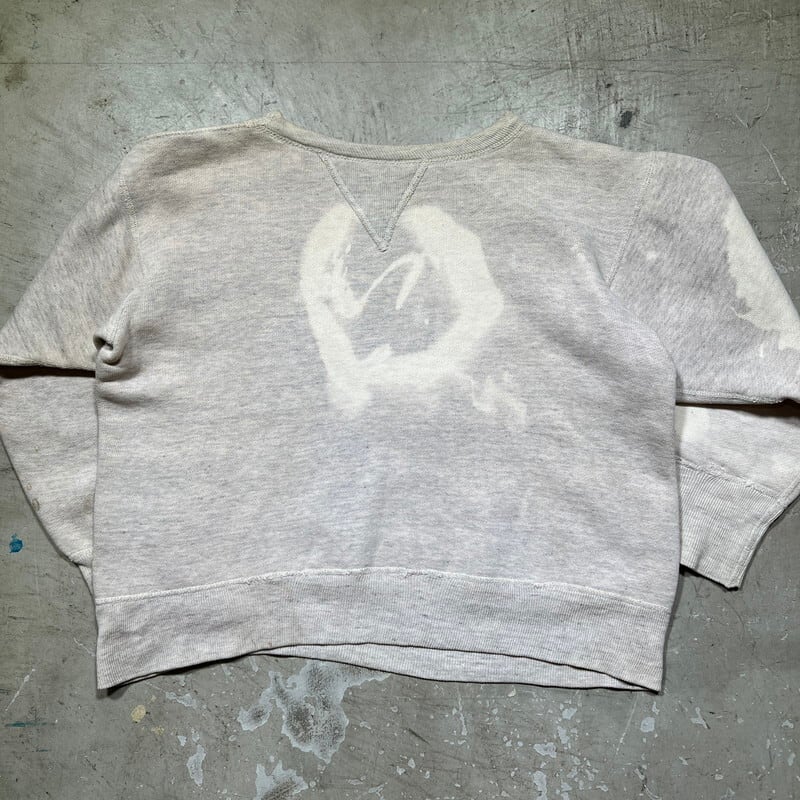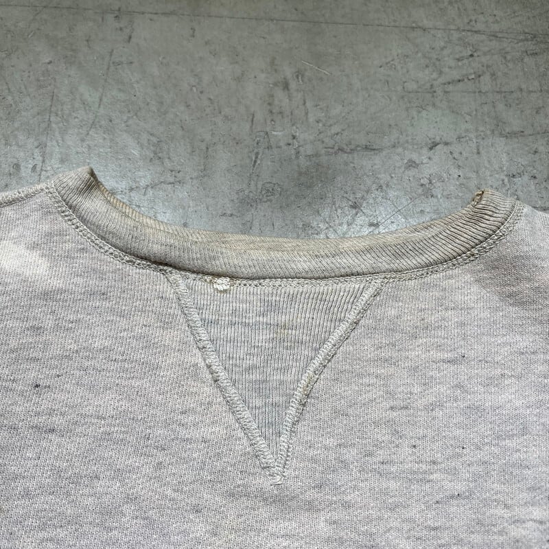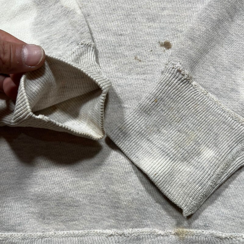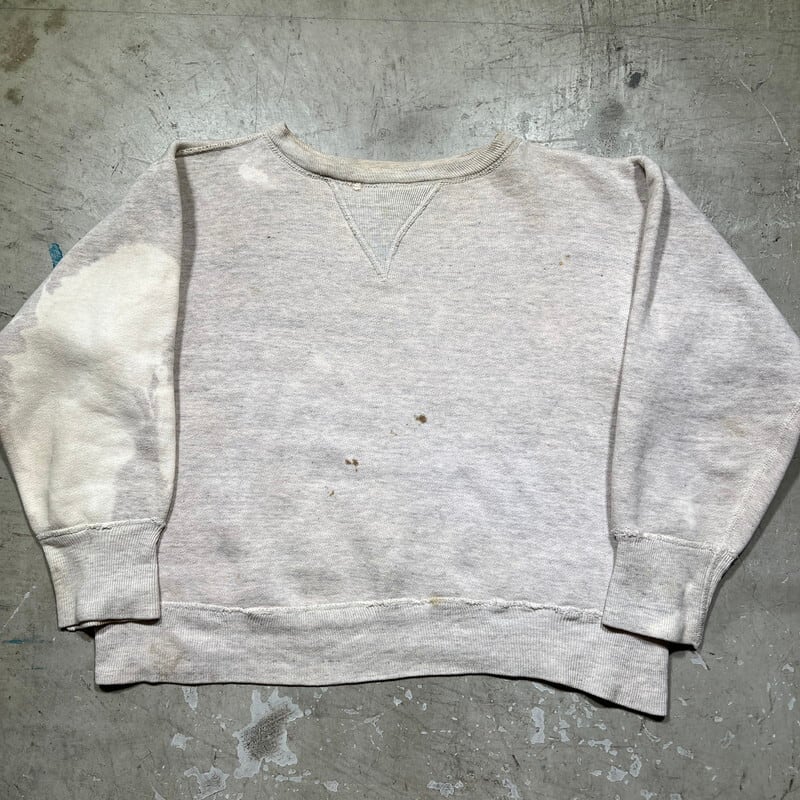 ~50年代のUnknownヴィンテージスウェットです。タグは欠損している為ブランドは不明です。貼り付けの両Vガゼット仕様で、首と裾、袖リブには一部縫い直しが見られますが基本全て4本針で縫製されています。所々にシミやブリーチ抜けが見られますが、生地自体はまだフカフカとしております。全体的にごくうっすらとピンクっぽい色移りがありますので、その色移りを取ろうとしてブリーチ抜けが出来てしまった可能性があります。上記のようにリブの縫い直し以外はボディにダメージはございません。身幅と肩幅はそれなりにサイズはあるものの着丈と袖が短く、約150cmの小柄な女性スタッフで丁度良い丈感だったので平均的な体格の男性ではかなり短丈になってしまうサイズ感です。ここ最近では両Vのスウェットも枯渇していますし、サイズは小さいながらも雰囲気の良いお品ですので、サイズが合う方はもちろんですが、サイズが合わなくともディスプレイやコレクションとしても素晴らしいアイテムだと思います。お探しだった方は是非この機会にいかがでしょうか。