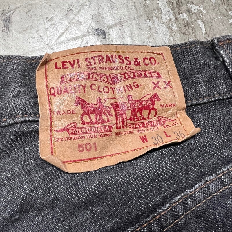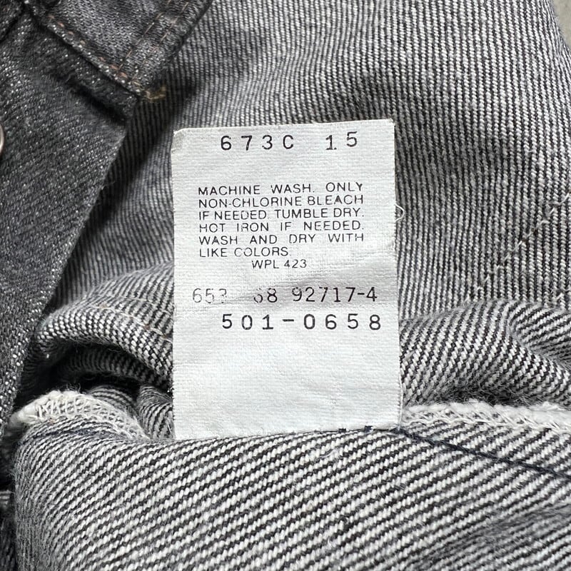 80年代後半頃のLevi's 501-0658ブラックデニムパンツです。先染めと呼ばれる表糸をブラックで染め上げたモデルです。刻印は653、赤タブスモールe。紙パッチの印字が赤文字で、赤文字になった直後あたりの88年頃のモデルかと思われます。ご紹介するこちらは色落ちの少ないグッドコンディションの1本で、生地の折り目ヤケのような箇所はございますが、ダメージは特にございません。紙パッチは割れなく残っております。ウエストは表記W30インチで、実寸はW29~30と若干の縮みがあります。レングスは丈詰めされています。先染めのブラックデニムは人気も高くなり、コンディションの良い物は特に動きの速いアイテムとなりますので、サイズでお探しだった方は是非いかがでしょうか。