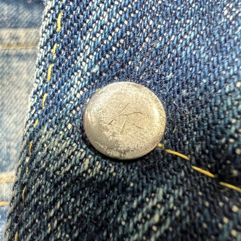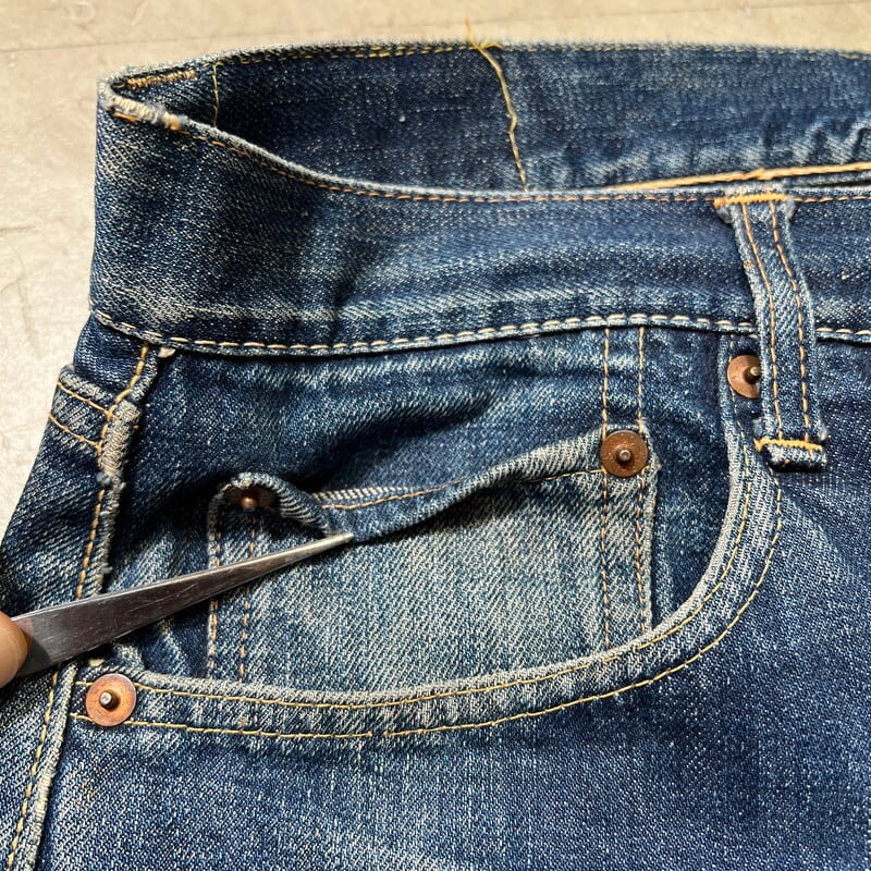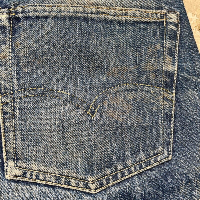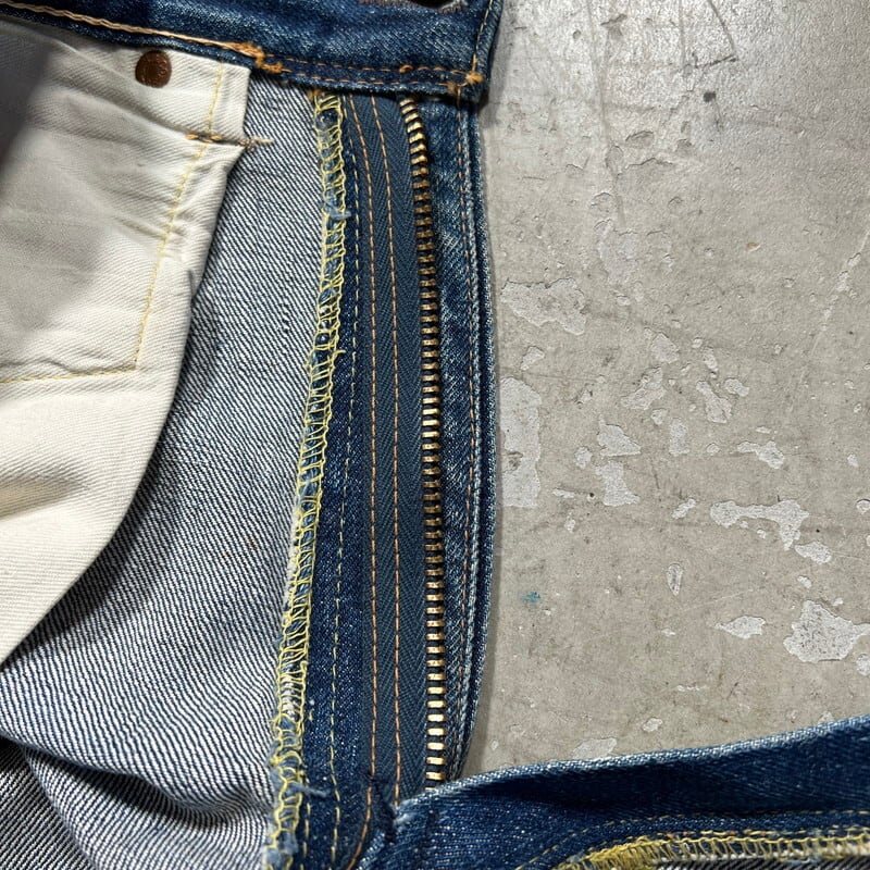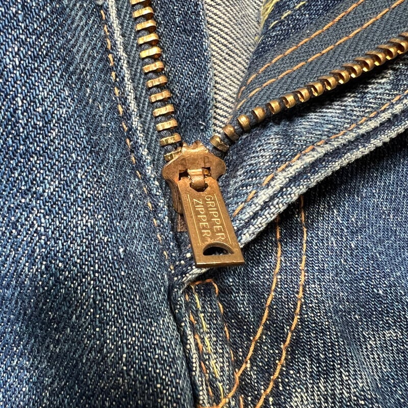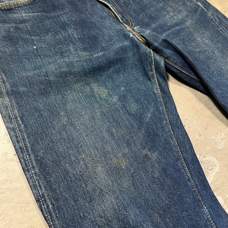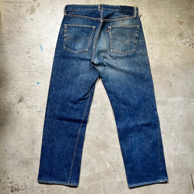 50年代から60年代のLEVI'S501ZXXデニムパンツです。1954年に501のジッパーフライバージョンとして発売されたモデルです。トップボタンシルバー、K刻印、Vステッチ、GRIPPERのカムロックジッパー、コインポケット裏シングル、鉄製リベット、隠しリベット、隠しリベット刻印ドット、オフセット、両面赤タブBig E。パッチは欠損していますが、ステッチ右上に微かに紙パッチが残っており、ギャラ入り期のモデルです。色落ちは6割程ですがXXらしい粗い濃さが残る1本です。シミや汚れも相まって素晴らしいエイジングです。フロントのジッパーはオリジナルでは無く修理交換されていますが、かなり自然な仕上がりです。レングスはチェーンステッチで裾上げされています。細かな擦れ等はございますが、ダメージはほとんど無く、この年代のXXとしてはかなりコンディションが良いと言える1本です。ウエストは実寸W33インチとゴールデンサイズですので、着用出来る方も多いかと思います。ヴィンテージデニムらしい良い色落ちでコンディションも申し分無いスペシャルピースです。価格高騰が止まらないヴィンテージデニムは、出会った時がチャンスですので、お探しだった方は是非いかがでしょうか。