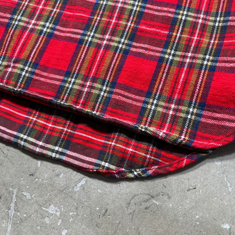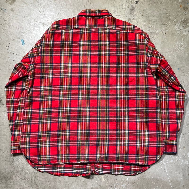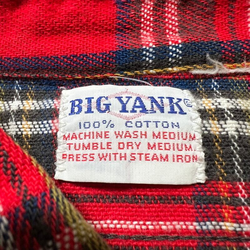 60年代頃のBIG YANKチェックヘヴィーネルシャツです。1898年イリノイ州シカゴで創業したReliance Manufacturing Company社が展開していたブランドです。コットンネルで明るい色味のチェック柄が使われています。襟先はやや長めで芯は入らないタイプです。ボタンは全てミルク色の樹脂ボタンです。サイドはマチは入りません。右胸のボタンホールがややほつれていますが、その他は目立つダメージや汚れはございません。サイズ表記はございませんが、身幅の具合からL相当かと思います。身幅もあり着やすいサイズ感ではないでしょうか。暗くなりがちな秋冬のコーデの差し色に是非いかがでしょうか。ダウンベストとの相性は抜群です。