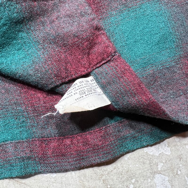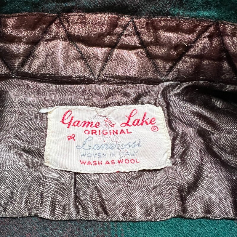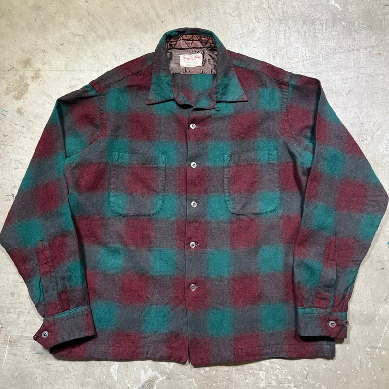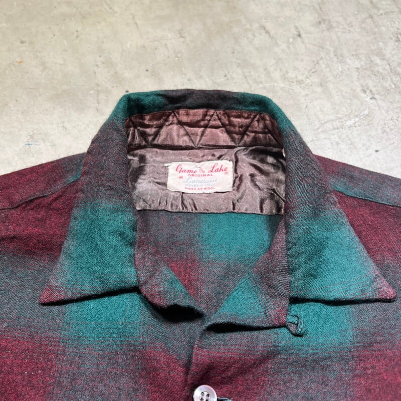 ~60年代頃のGame and Lakeオンブレチェックオープンカラーシャツです。Game and LakeはBLOCH HELLER COMPANY(創業年不明)が展開していたブランドです。1917年創業の老舗イタリアンファブリックメーカーのLanerossiの生地を使用しています。エンジとグリーンのコントラストが美しい1着です。袋襟で襟芯仕様ですが、芯は取り出されています。ループボタンの開襟です。ボタンは全て黒蝶貝と思われるシェルボタンが欠損無く揃っています。襟元のサテン地に若干変色があり、カフスの先にややほころびが見られます。その他目立つ汚れやダメージ等は特にございません。Lサイズ表記ですが着丈はそこまで長く無く合わせやすいサイズ感だと思います。渋い色味ですのでギャバジン織のクラシックなパンツ等と合わせてみてはいかがでしょうか。