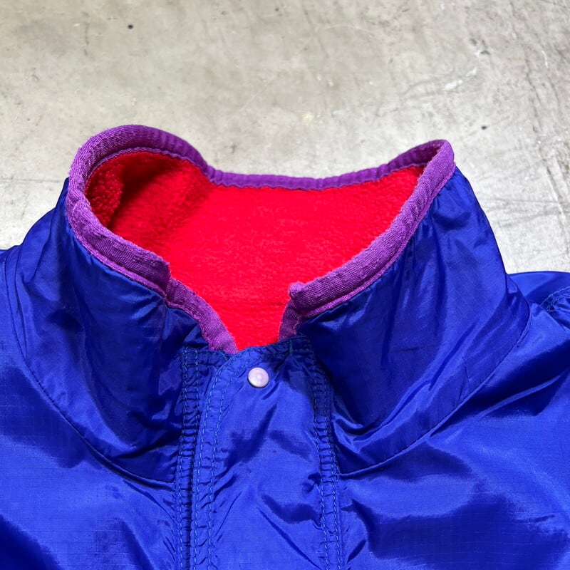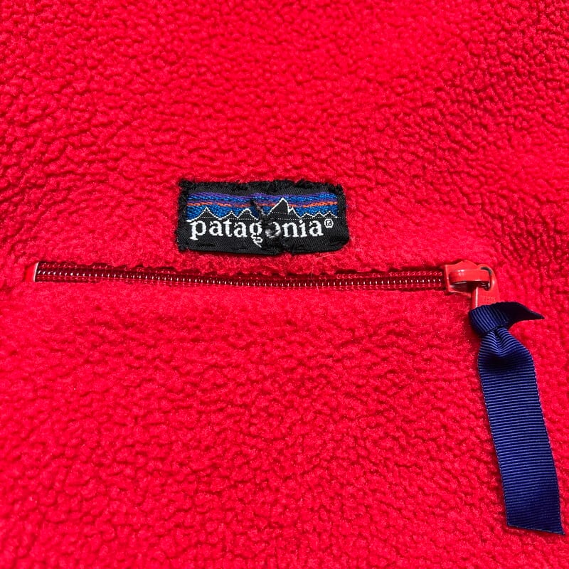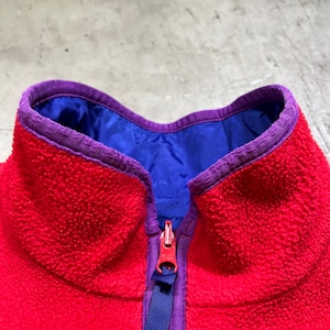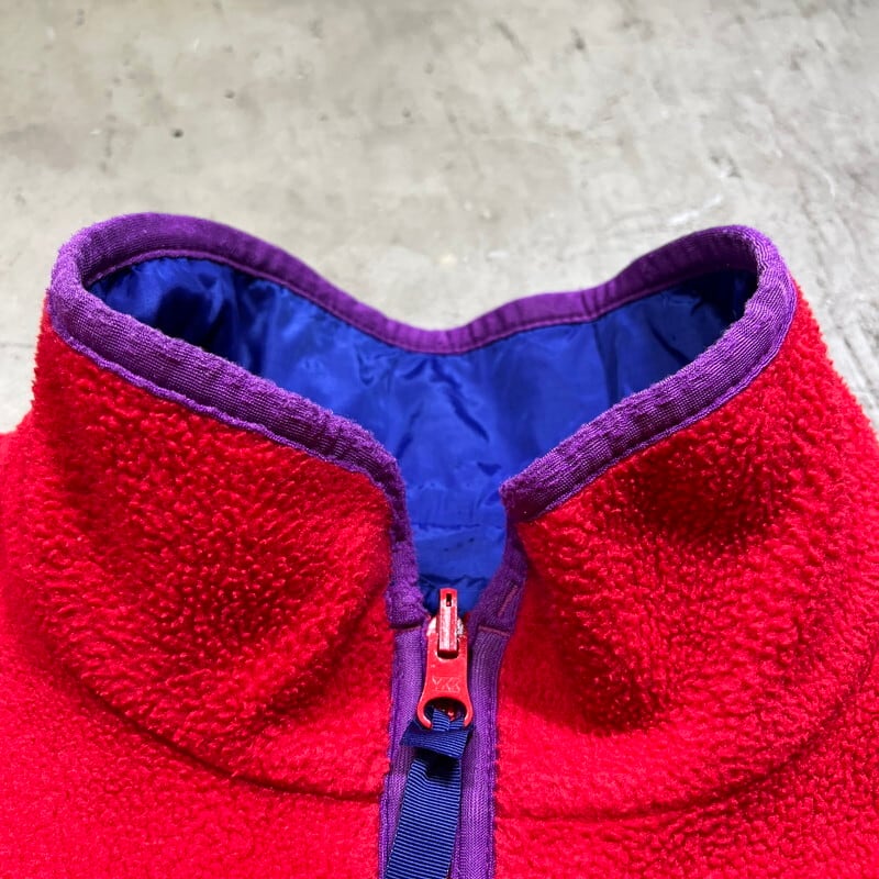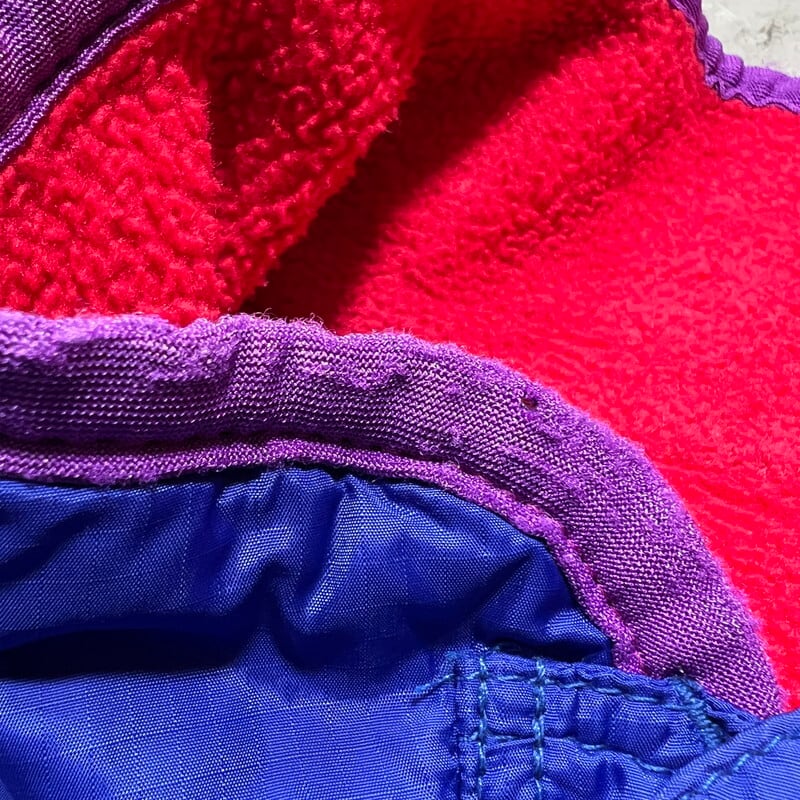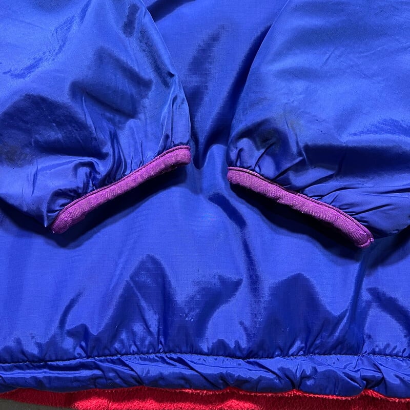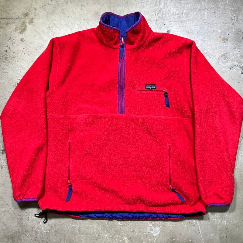 80年代のパタゴニア グリセードプルオーバージャケットです。89年製造の初期頃のモデルです。表がシンチラフリース×ナイロンのリバーシブルジャケットで、ナイロン面のポケット内側にタグが付きます。発色の良いローズレッドとブルーの配色が目を惹くパタゴニアらしい1着です。襟や袖先のパイピングに若干擦れがございます。ナイロン面の左肩に小さなハンドリペアがございます。その他細かな擦れや引っ掻き傷の様なものがございますが、大きくないのでそこまで気にならないかと思います。袖先にうっすらシミ汚れがございます。フリース面は胸元のタグに擦れによるダメージがあります。肘のフリースがやや潰れています。その他大きなダメージや汚れはございません。XLサイズでゆったりとした大きさですので着用出来る方は多いのでは無いでしょうか。裾のドローコードで絞るとシルエットや着丈も幾分調整できます(ドローコードのストッパーは社外品です)。カラーバランスの良い古いパタゴニアがお好きな方は是非この機会にいかがでしょうか。