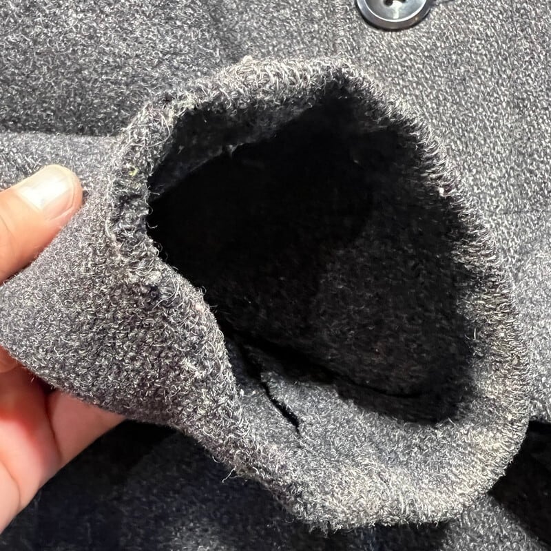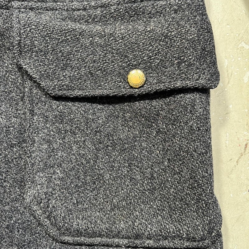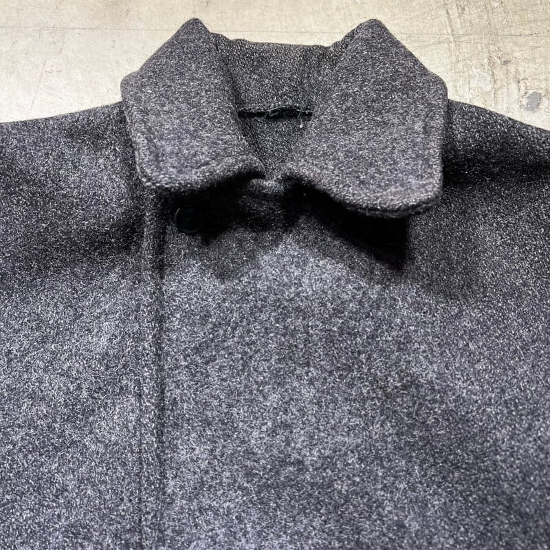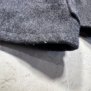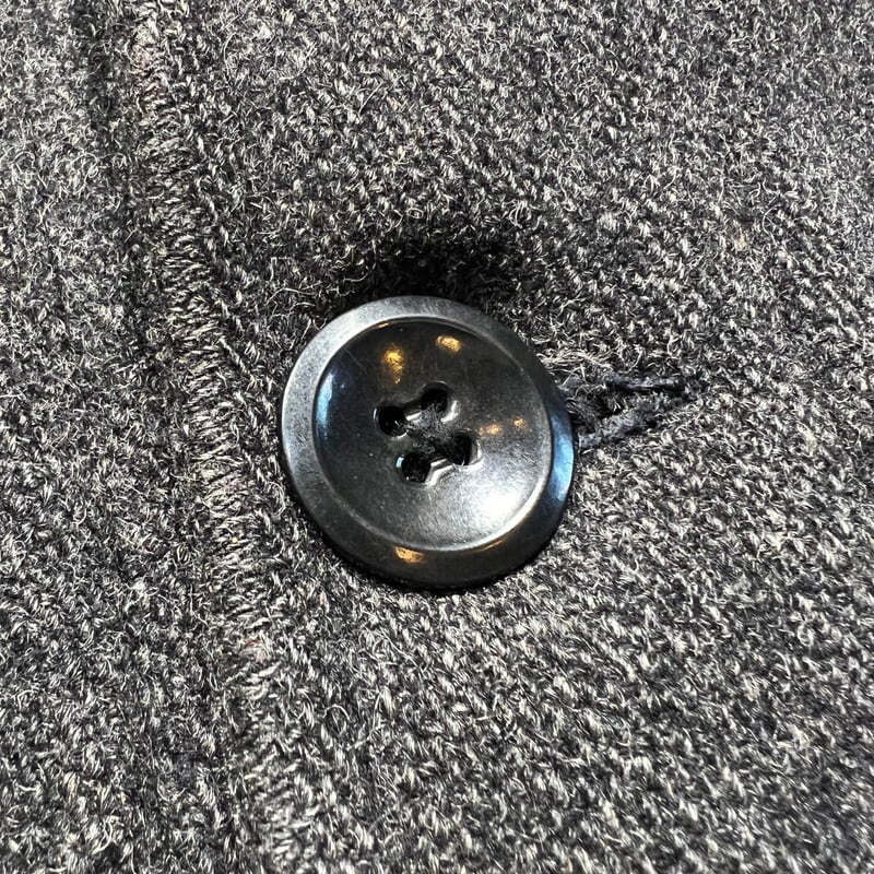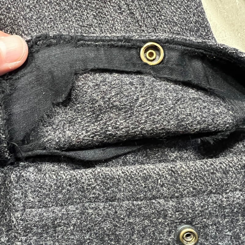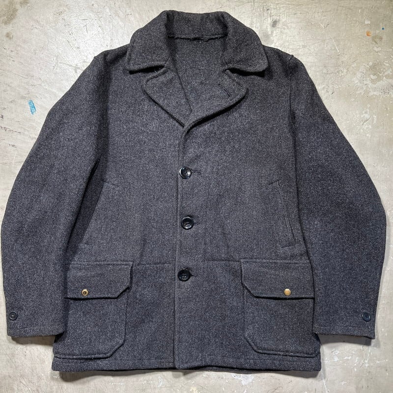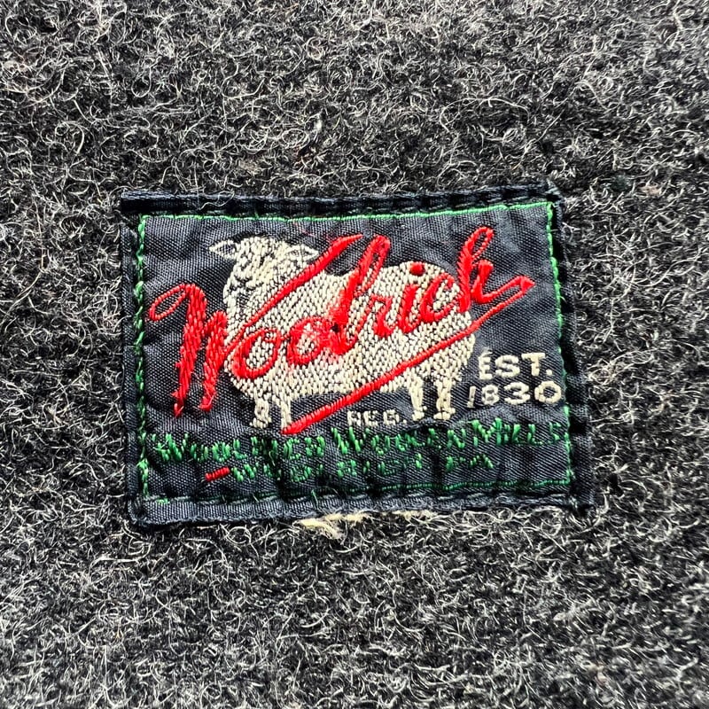 30年代頃のWoolrichウールジャケットです。ご紹介するこちらは一つ前のBLACK BEAR同様に4つポケットののジャケットでライニングの付かない1枚地です。タグはグリーンの枠で囲まれた古いタイプが縫い付けられています。フラップにはゴールドの渦模様のメタルスナップボタンが使用されています。袖先には飾りボタンが付きますが両袖各1個づつ欠損しています。グレーのウールで柄は無く非常にシンプルなデザインです。フロントの4つポケ以外にゲームポケット等は付きません。Pコートのようにかちっとはしておらずシルエットはとても綺麗です。首元に若干の変色が見られ、細かな擦れ等はございます。フラップ裏の当て布に破れがございます。ボタンホールにややほつれはありますが、着用に問題はございません。その他虫食いやダメージは無くコンディションは良好です。シンプルで都会的な印象もありますが、アウトドアっぽさも残るデザインはお好きな方も多いのでは無いでしょうか。さらっと羽織っているとパッと見では古さは分かりにくいですが実は1930年代のド級のヴィンテージというある意味変態的な魅力がある1着です。サイズ表記はございませんが40~42相当です。サイズ感も良く合わせやすいグレー単色のアイテムですのでお好きな方は是非この機会をお見逃しなく。