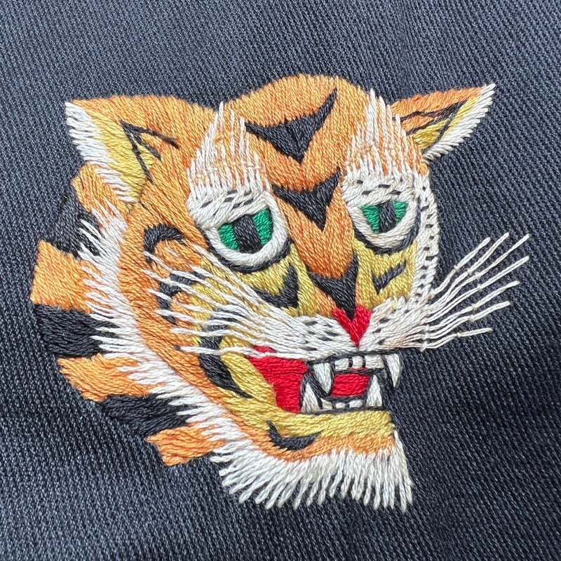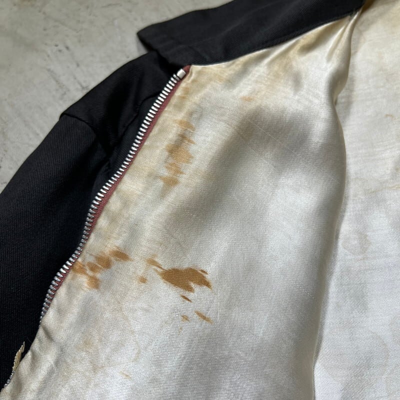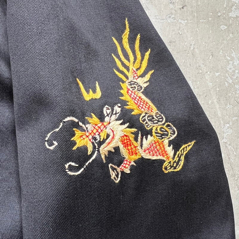 60年代のベトナムスーベニアジャケットです。通称”ベトジャン”と呼ばれ、近年では様々なブランドがサンプリングした事で知名度も高く、ヴィンテージ古着市場でも大変人気のあるアイテムです。ご紹介するこちらは、ブラックのコットンツイル地に、ヘタウマな虎や龍等の刺繍が施されています。フロントはアルミのVKKジッパーです。サテンのライニングにもシミや汚れが見られますが、表面は首元のうっすらとした汚れ以外はダメージもほとんど無くコンディションは良好かと思います。刺繍の糸切れほとんどございません。サイズ表記はございませんが、メンズでいうS~M(36~38)相当かと思われます。アームホールや腕回りがやや細目の作りですので、がっしりした体格の方にはお勧めしません。細かなダメージ等はございますが、コンディションの良いベトジャンは本当に見かける機会も減りましたので、サイズが合う方は是非この機会にコレクションに加えてみてはいかがでしょうか。
