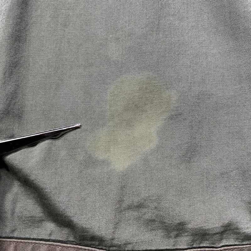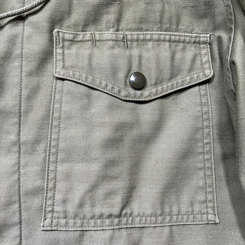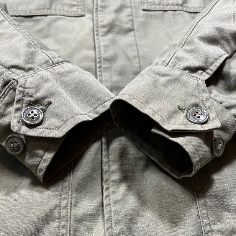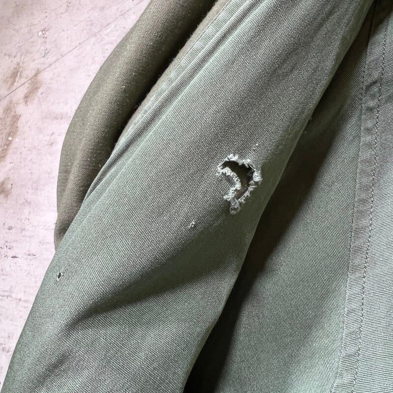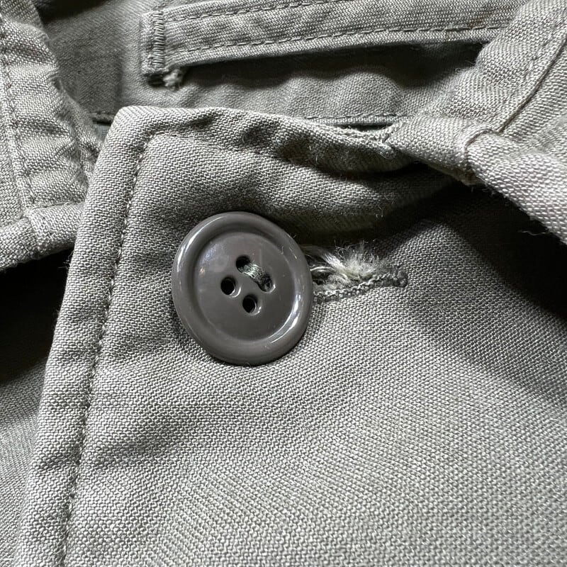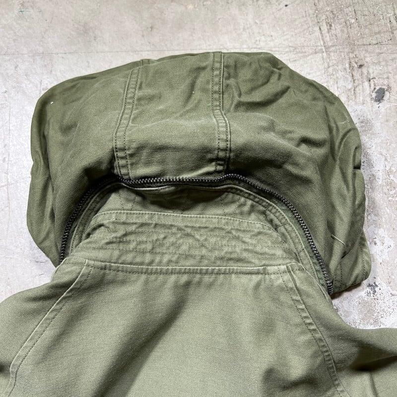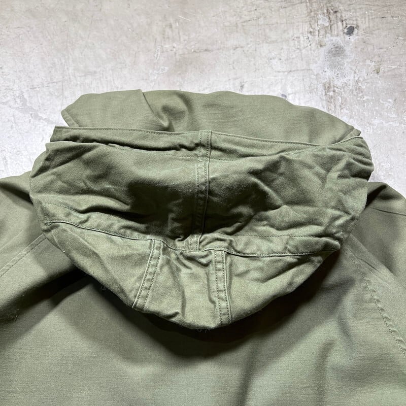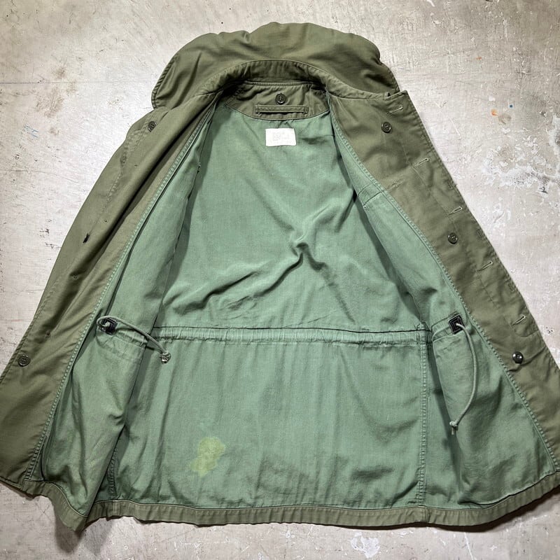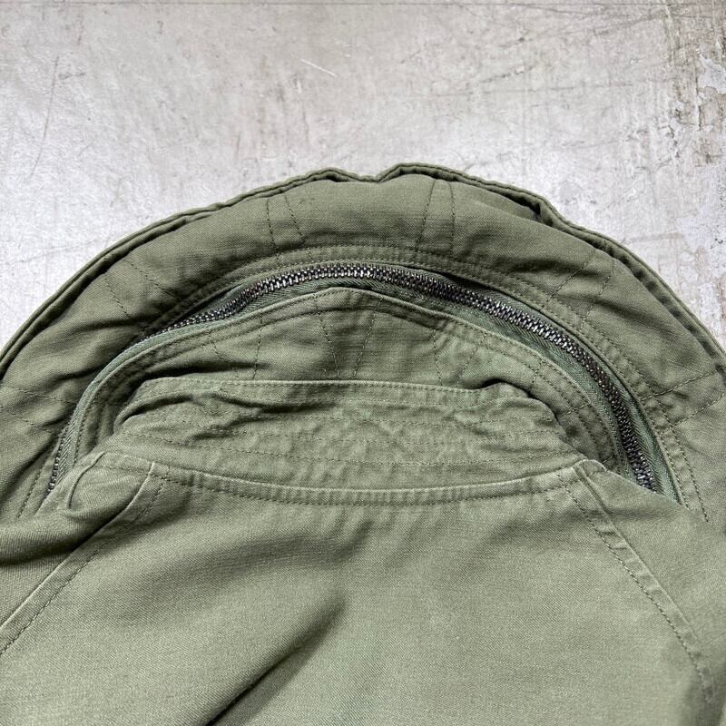 6月23日のCONTRACT DATEが記載されています。フードが内蔵された丸い襟が特徴で、形状が牛の耳に似ている事からキャトルジャケットと呼ばれています。ご紹介するこちらは、空軍にのみ支給されたアイテムで、1965年からはM-65に統一され製造が終了となったモデルです。66年表記がある事から同モデルの最終期に製造されていた物だと思われます。M-65と違い肩はラグランスリーブで、フロントにはジッパーは付かずボタンでの開閉となります。肩回りに黒っぽい薄汚れがいくつかあり、背面右裾付近に色抜けのような箇所がございます。内側にピンホールやダメージが数カ所あり、胸元のインシグニア裏に細かなダメージがいくつかございます。サイズはSMALL-LONGです。SMALL表記ですが、少しゆとりのあるサイズ感です。M-65に比べると製造期間も短く頻繁に出るようなアイテムでもないのでお探しだった方はいかがでしょうか。ライナーは付きませんが、専用のライナーを取り付けると防寒アウターとしても使えます。