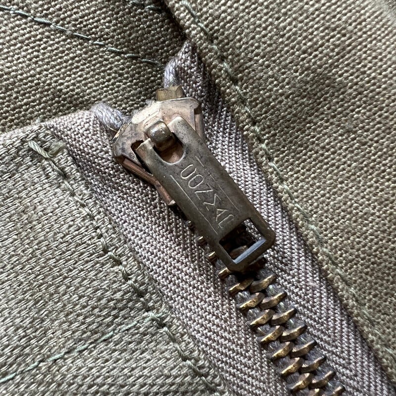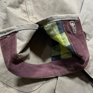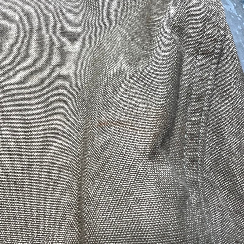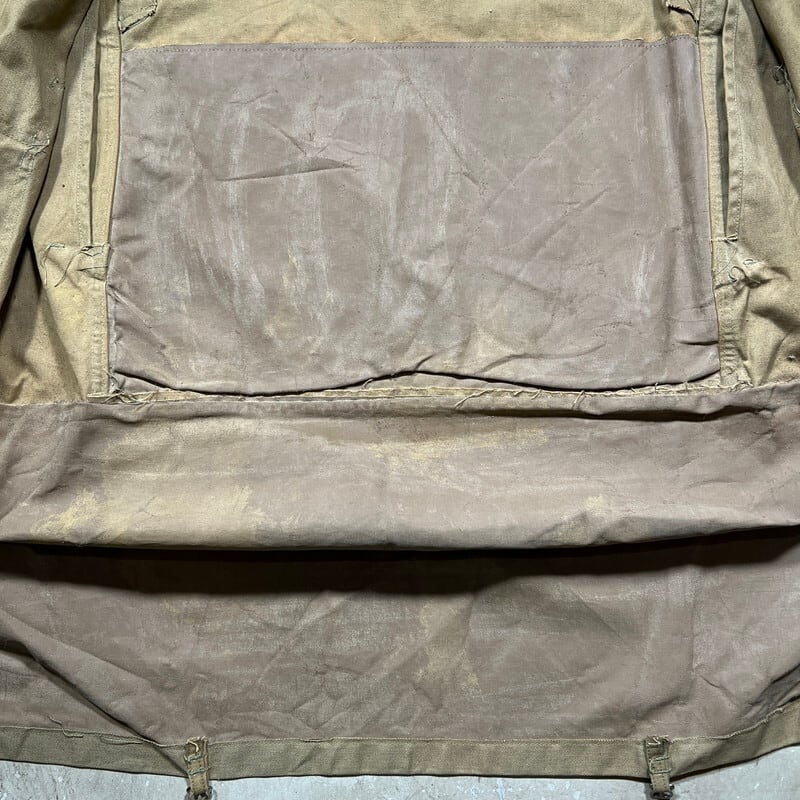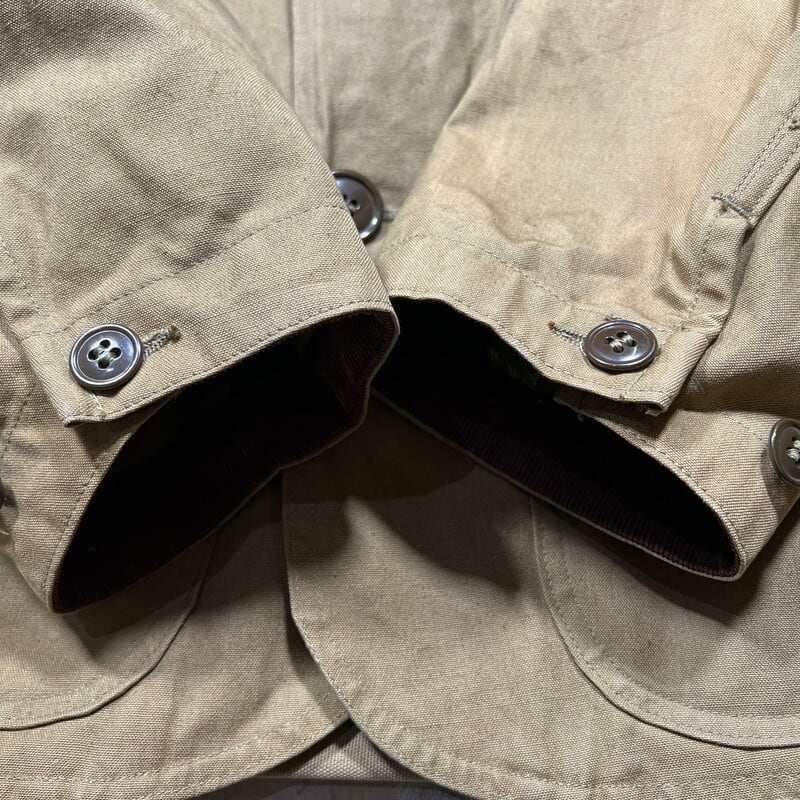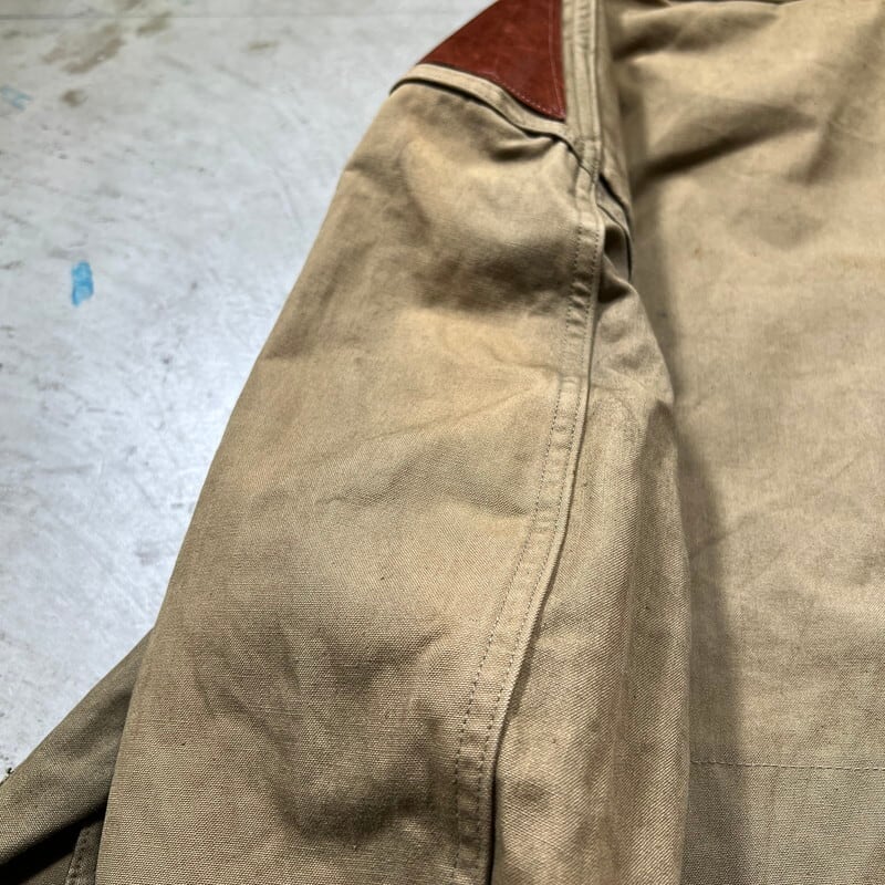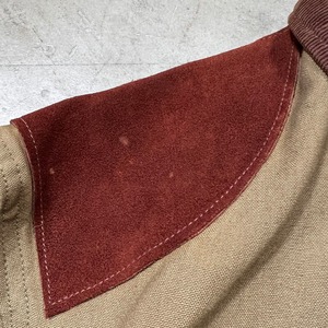 50年代頃のCUMBERLANDダックハンティングジャケットです。ハンティングやフィッシングウェアで有名なMASLAND社製のアイテムです。CUMBERLAND自体今いち情報が少ないので詳細はわかりませんがMASLANDの系列ブランドなのでしょうか。ご紹介するこちらのアイテムは、両肩にスエードのパッチが縫い付けられており、脇下にベンチレーションホールがございます。裏地にイエローベースのネル地が使われております。スエード部分に細かなシミがあり、ゲームポケット内のコーティングに劣化があり、汚れもございます。袖に若干ヤケのような変色がございます。全体的には使用感は少な目でコンディションの良い1着です。サイズ44でL相当です。シルエットも良くコンディションも申し分無いのでおすすめな1着です。