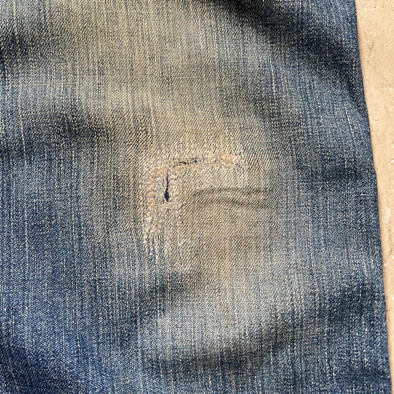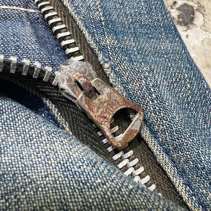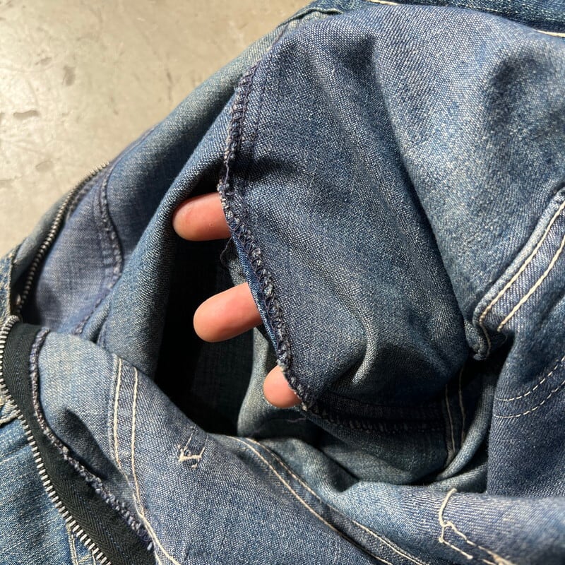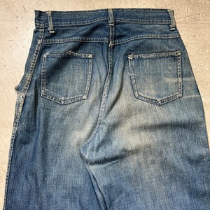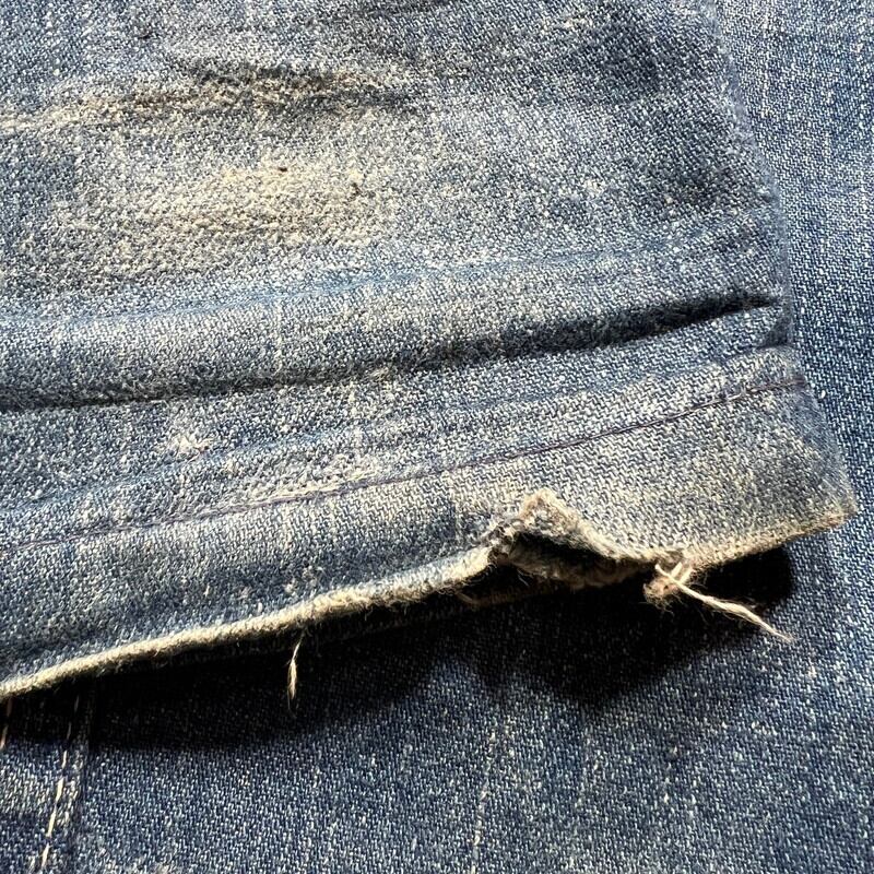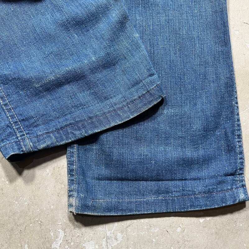 50年代頃のUnknown デニムランチパンツです。ランチパンツとは、1930年代頃にデュードランチという牧場観光に着用する為に作られた女性向けのワークパンツで、深いハイウェストにサイドにジッパーが取り付けられているのが特徴です。ご紹介するこちらはタグ等が付かない為ブランドは不明ですが、恐らくストア物だと思われます。ライトオンスながら素晴らしい縦落ちと、メリハリのあるヒゲが印象的な1本です。サイドのトップボタンで1インチちょっと調整が出来ます。ジッパーは古いアルミのSERVALベル型が使われています。ウエストやポケット裾等に擦れやダメージが見られ、ステッチ飛びもいくつかございます。左ポケット下と左膝にリペアがございます。右ポケットのステッチが一部飛んでいますので縫い直しが必要です。ウエストは実寸W28~29インチ程で上記にもあるようにウエストのボタンで調整が可能です。腿周りはゆったりとしていますのでウエストが入れば男性の方でも着用は難しくないのかもしれません。色落ちがとにかく良いのでサイズが合う方は是非いかがでしょうか。