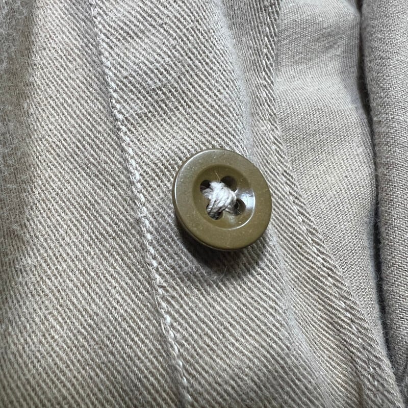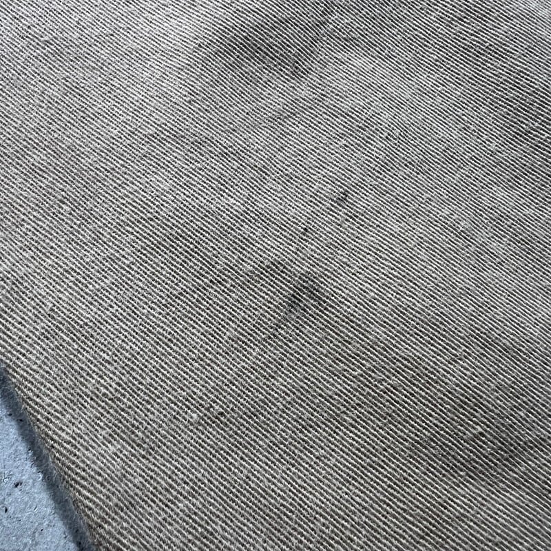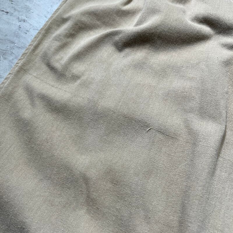 50年代から60年代頃のイギリス軍グルカパンツです。1814年から1816年にイギリス東インド会社とネパール王国の間で勃発した戦争で、ネパールの山岳民族出身のグルカ兵達が着用していたパンツが由来となったアイテムで、フロントで交差したサイドのアジャスターで調整するデザインです。ウエストは最大でW32インチ、最小でW29インチまで調整が可能です。内タグは欠損しております。フロントは縫いつけのボタンフライ仕様です。後継の1950パターンに比べこちらはサイドのスラッシュポケット以外は省略されています。腿から裾にかけてワイドなストレートシルエットです。70年代以降のモデルですとややテーパードが入るシルエットになる為こちらのゆったりワイドシルエットがお好きな方もい多いのでは無いでしょうか。裾付近に薄汚れがあり、右腿に糸抜けがございます(ダメージでは無いので着用に問題はありません)。ウエストセンター背面に補強のハンドリペアがございます。その他擦れ等の小傷はございますが、年代を考慮すればコンディションは良好だと思います。サイズは上記にもあるように3インチ程調整が効きますので細身な方から標準体型の方までご着用いただけます。ユーロミリタリーの中でもなかなか出ないアイテムですので、お探しだった方は是非この機会にいかがでしょうか。良いサイズでオススメです。