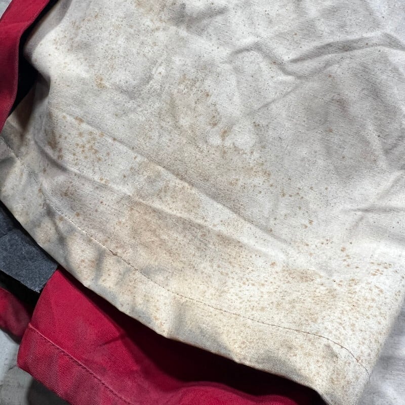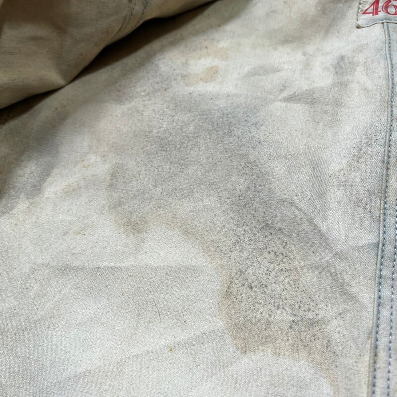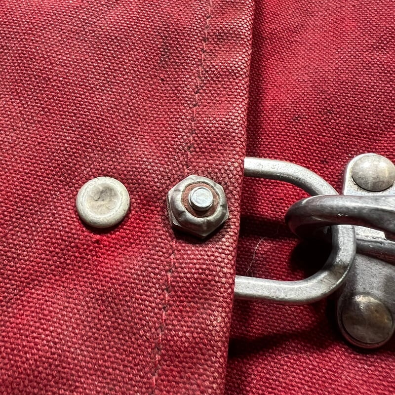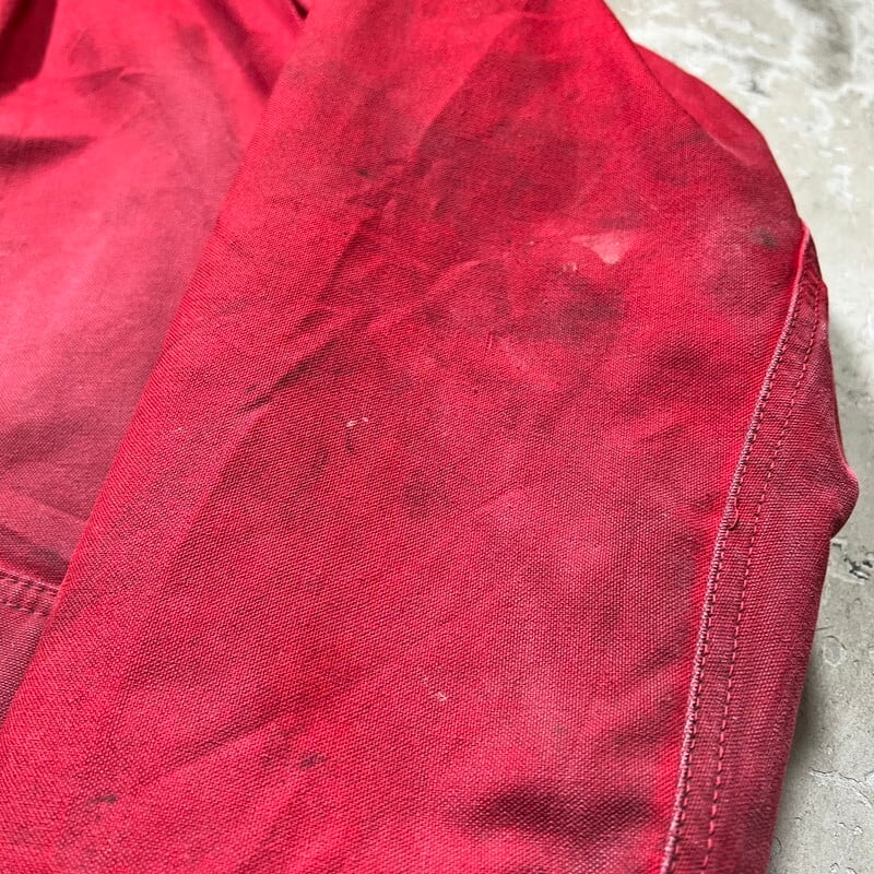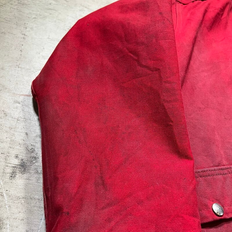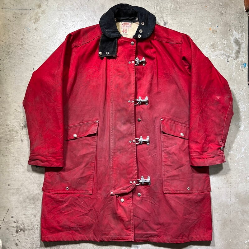 40年代から50年代頃のMorning Prideファイヤーマンコートです。Morning Pride Mfg Coは1921年、オハイオ州デイトンにて創業した消防士用の衣類等を製造するメーカーです。ニューヨークのFDNYでもこのMorning Pride社のウェアが使用されているようです。ご紹介するこちらは、古い年代では非常に珍しいレッドカラーのダック地を使用した1着です。襟とチンストラップ内側はブラックカラーです。フロントはアンカーマーク刻印の入るフックとスナップで開閉が出来ます。大きなポケットは水が入らない様フラップが付き、万が一水がポケットに入ったとしても水を抜く為のドレンホールが下部に配置されています。ゴム引きのようなライナーは取り外しが出来ます。全体的に汚れがあり、フロントがくすんでいますが、大きなダメージは無く袖内側のリブも綺麗です。下から2番目のフックの留め具がナットで固定されています。サイズ表記は46ですが、普段44を着用している方でも差し支えなく着用できると思います。なんといってもこの年代ではほとんど見る事の無いカラーリングが堪りません。ライナー付きですと防寒性も高くなりますが、普段使いならライナー無しの方が使用はしやすいと思います。ヴィンテージファイヤーマンコートは注目している方も多いと思いますので、お探しだった方は是非いかがでしょうか。