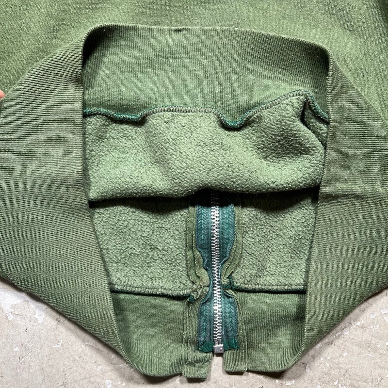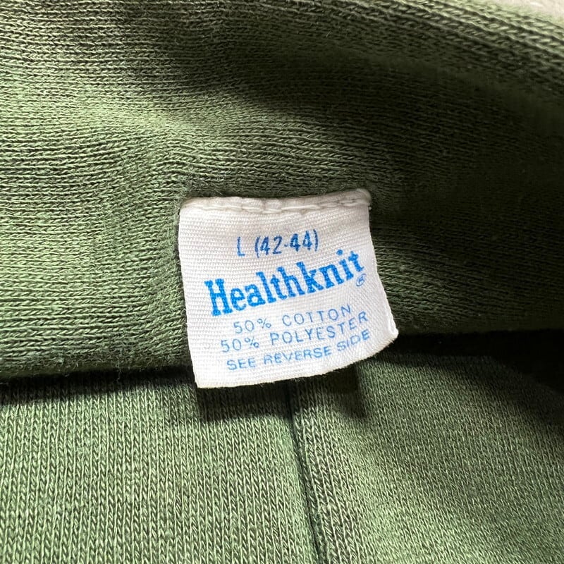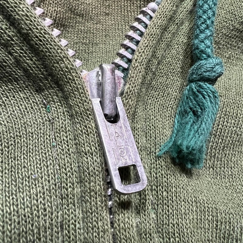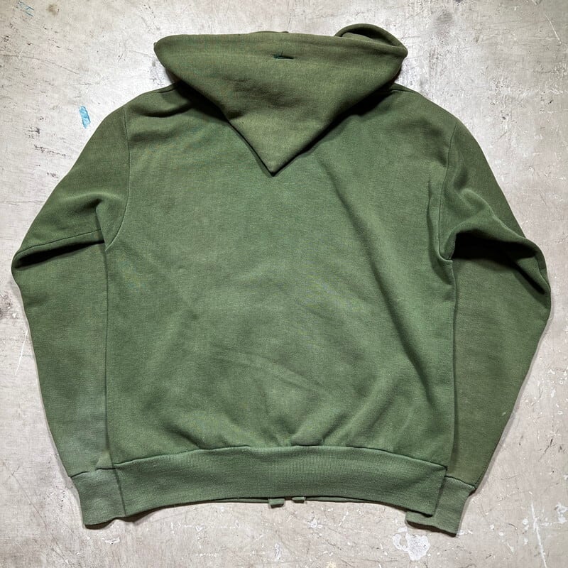 60年代頃のHealthknit ジップアップスウェットパーカーです。Healthknitは1900年テネシー州ノックスビルで創業した老舗アンダーウェアブランドです。ご紹介するこちらは、オリーブグリーンカラーのフルジップパーカーで、程よくフェードしておりヴィンテージスウェットらしい色味です。フロントはアルミのTALONジッパーが使われています。タグはフードに付きます。所々薄汚れが有り、左袖に小さなダメージが見られます。リブにダメージございません。L表記ですが、M相当のサイズ感です。ヴィンテージスウェットの中でも人気のカラーですので、サイズが合う方は是非この機会にいかがでしょうか。