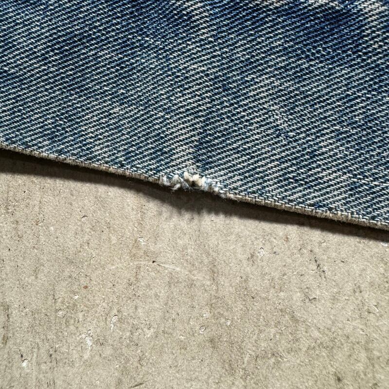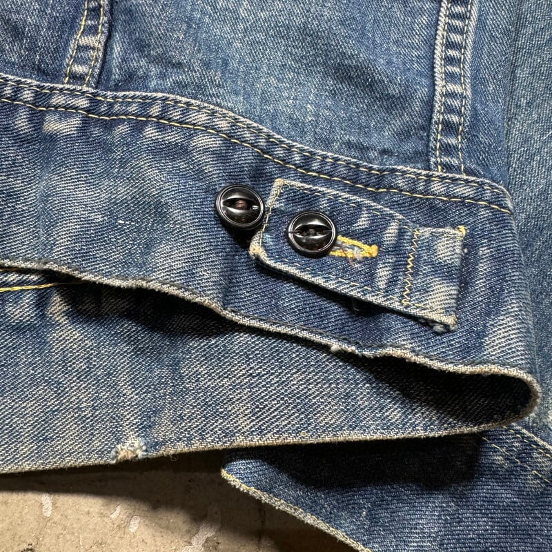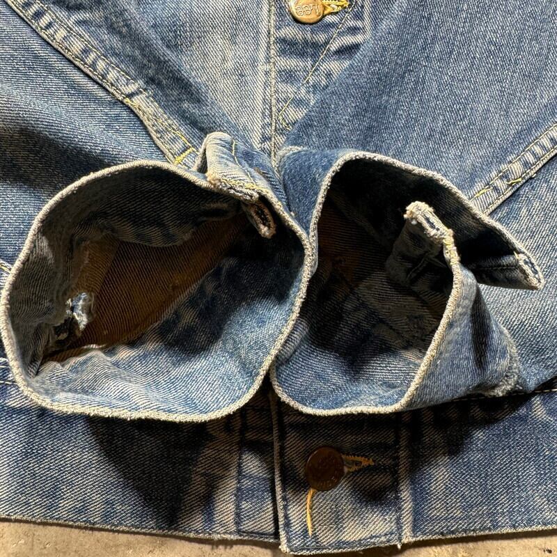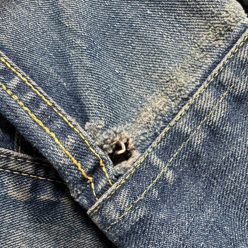 60年代頃のLee101-Jデニムジャケットです。首、ピスネーム共にMRが入らない黒タグモデルです。ボタン裏は全てドット刻印です。左胸ポケット内側にユニオンチケットが縫い付けられています。全体的に色落ちが見られ4~5割程の色残りですが、バランスが良く合わせやすいのでは無いでしょうか。背面にはヨットをモチーフにした刺繍が施されており唯一無二の雰囲気が溜まらない1着です。両袖に折り曲げ跡のダメージがございます。裾に小さなダメージや一部ステッチ飛びが見られます。サイズはなかなか見つからない48 REGULARでゆったりとしたサイズ感が魅力的です。着丈が短い101-Jなのでこれ位のサイズですと良い塩梅で合わせていただけるかと思います。リーバイス同様にじわじわと価格が上がっており、大きいサイズに加え、背面の刺繍入りモデルはなかなか出にくくなったと思いますので、お探しだった方は是非この機会にいかがでしょうか。