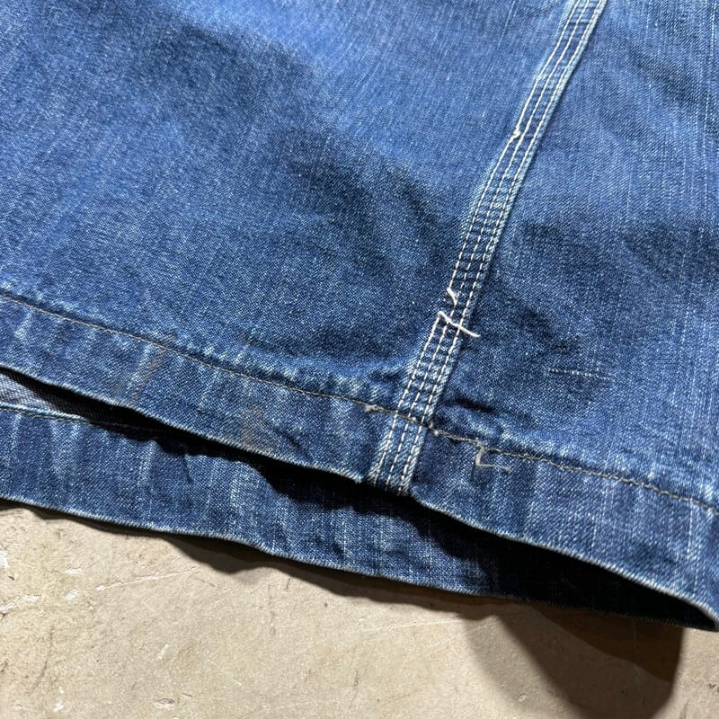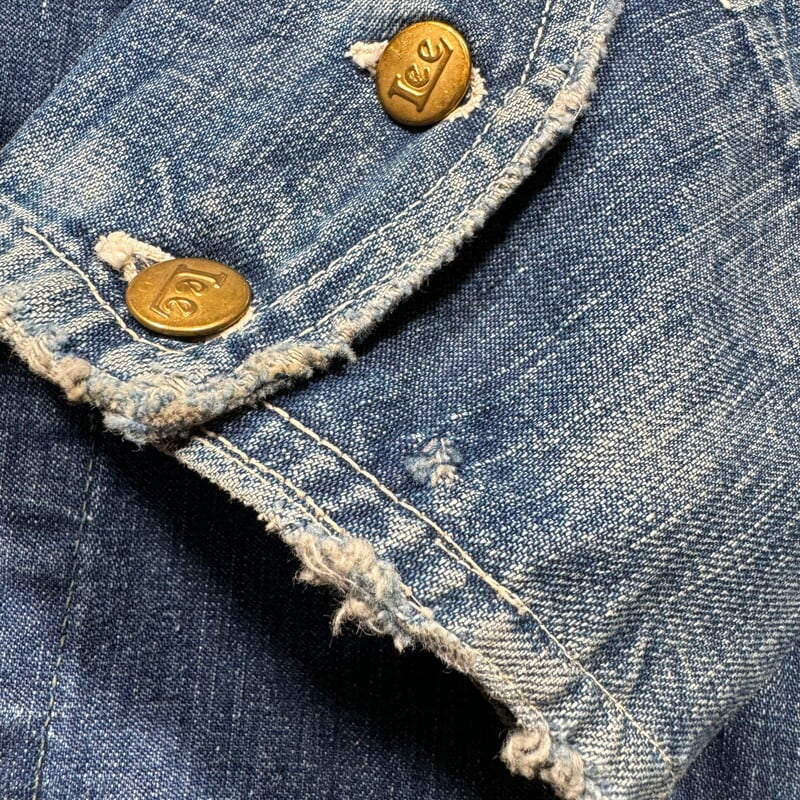 40年代のLee91-Jデニムカバーオールです。1940年代後半頃まで使用されていたハウスタグが残る1着です。タグのeが傾斜していないのでハウスタグの最終期のモデルだと思われます。色は7割程残る今では希少な濃いめの個体です。胸のスナップボタン以外が首振りボタンです。50年代以前のモデルで見られるロングLと呼ばれるボタンが使用されています。左胸ポケット内側にユニオンチケットが付きます。ポケット縁や袖先に擦れやダメージがございます。右肘付近には生地をはめ込んだリペアが施されておりますが、ボディ同様に古い年代のデニムが使われていますので、濃淡の具合も楽しめます。左袖のボタンが一つ欠損しています。生地はしっかりとしておりこれからも長く着用していただけるグッドコンディションです。こちらもなかなか出ない48 REGULAR表記のゆったりサイズです。しかし着丈は比較的長く無いのでオーバーサイズに来てもバランスの良いサイズ感です。この辺りの古いLeeも本当に見つかりづらくなったと思います。Lee好きななら1度は手に入れたいオリジナルのハウスタグが付く貴重なモデルですので、ゆったりサイズでお探しだった方は是非この機会をお見逃しなく。今後の入荷はどんどん難しくなっていくアイテムですのでお早めに。