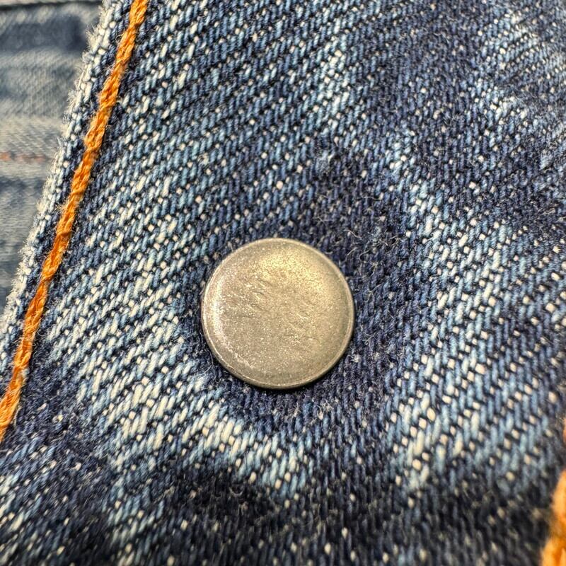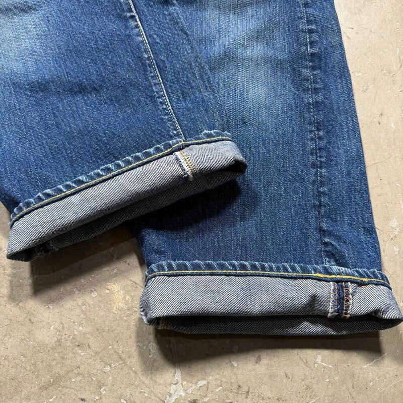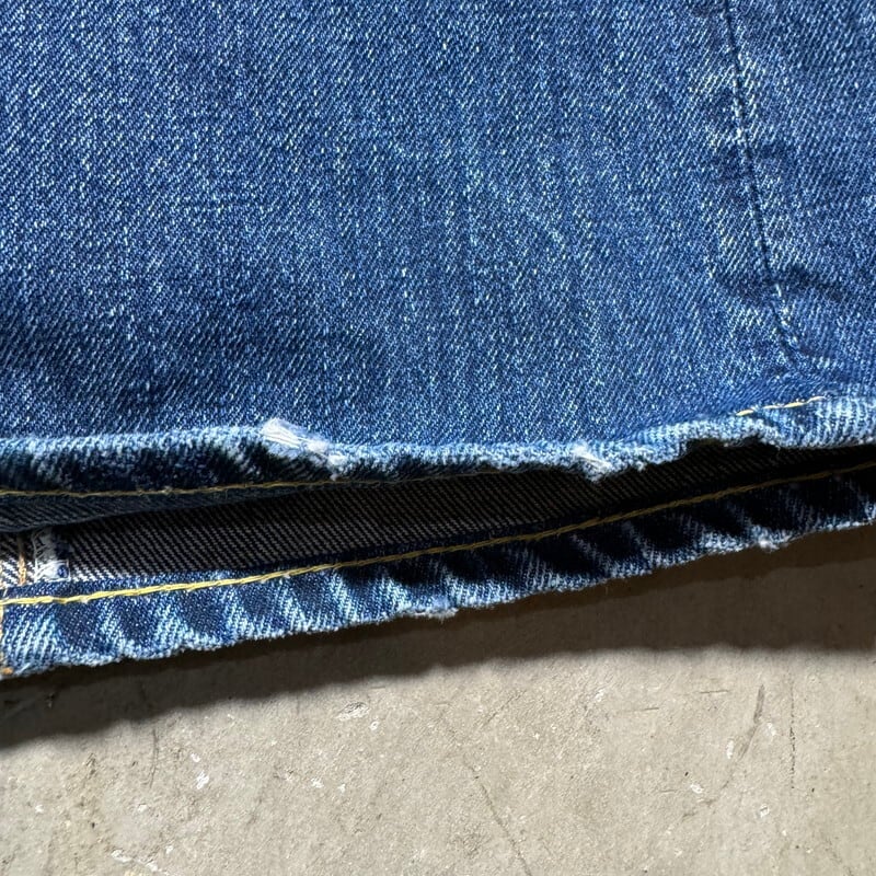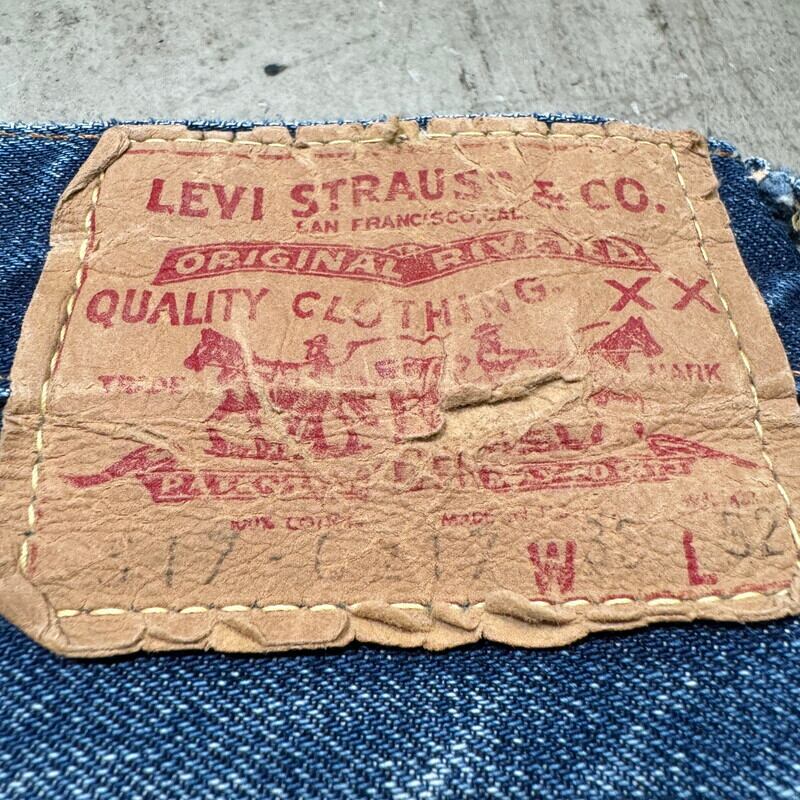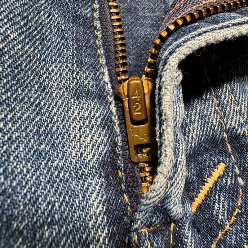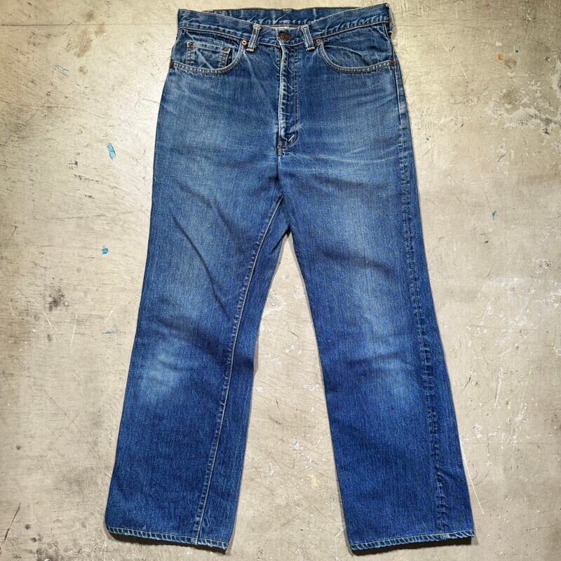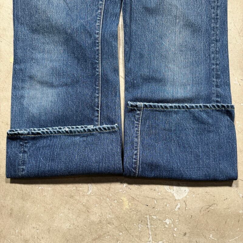 70年代のLEVI'S 517-0217ブーツカットデニムです。トップボタン裏ドット刻印、42TALON、バックポケット裏シングル、アウトシーム裏両面シングル、デカ文字表記、赤タブBig E、不均等V。1971年にデニムラインの517が発売され、66前期へ移行するまでの僅か1~2年程という極めて短い期間のみ製造されていた希少アイテムで、紙パッチの印字はデカ文字と呼ばれる初期頃のモデルです。色残りは5割程ですが、生地がしっかりとしたグッドコンディションの1本です。裾に細かな擦れによるダメージが見られます。ポケット縁やフロントのステッチが2色使いのレインボーステッチでです。バックポケットのアーキュエイトステッチは全て解けています。517と言えば緩やかに裾が広がったブーツカットシルエットで有名ですが、初期頃のモデルの中にはその広がりが極めて緩い物も混在しているようで、こちらの個体はブーツカットというよりほぼストレートシルエットです。レングスは裾上げがされていますが、カットしてフレア部分がなくなったという訳ではなさそうです。ブーツカットが苦手という方でもこの個体はほぼストレートですのでシルエットを気にせず穿いていただけます。ウエストの表記は消えかけていますが実寸W33インチのゴールデンサイズです。最初期の517Big Eはなかなか市場にも出ないと思いますので、お好きな方は是非この機会にいかがでしょうか。