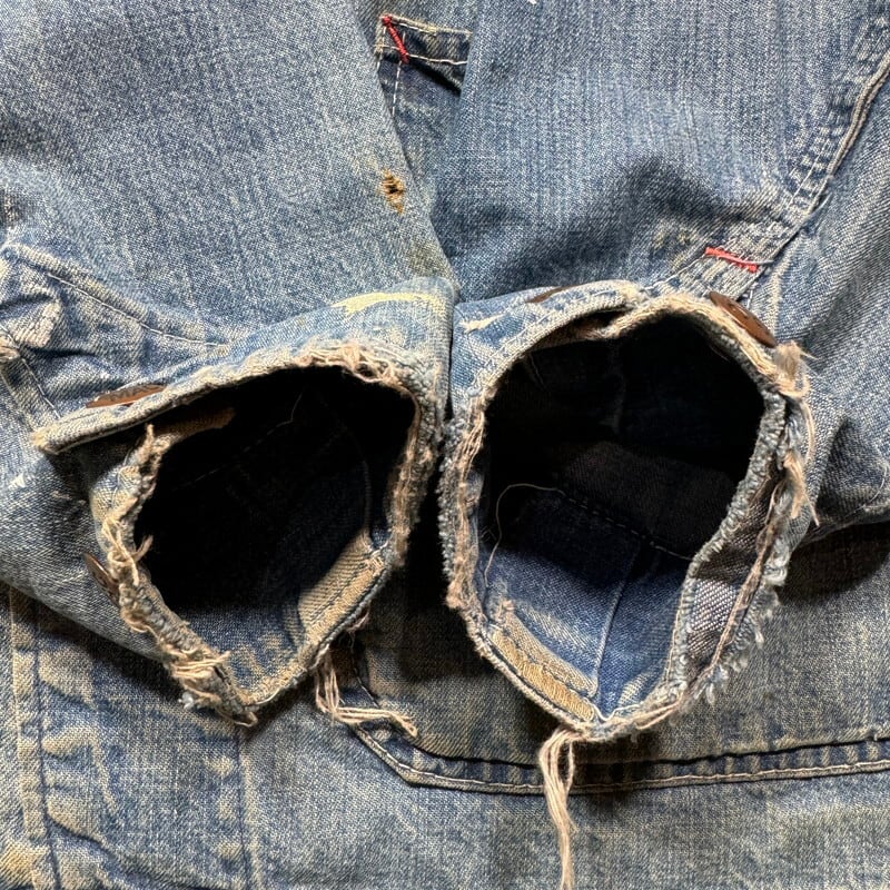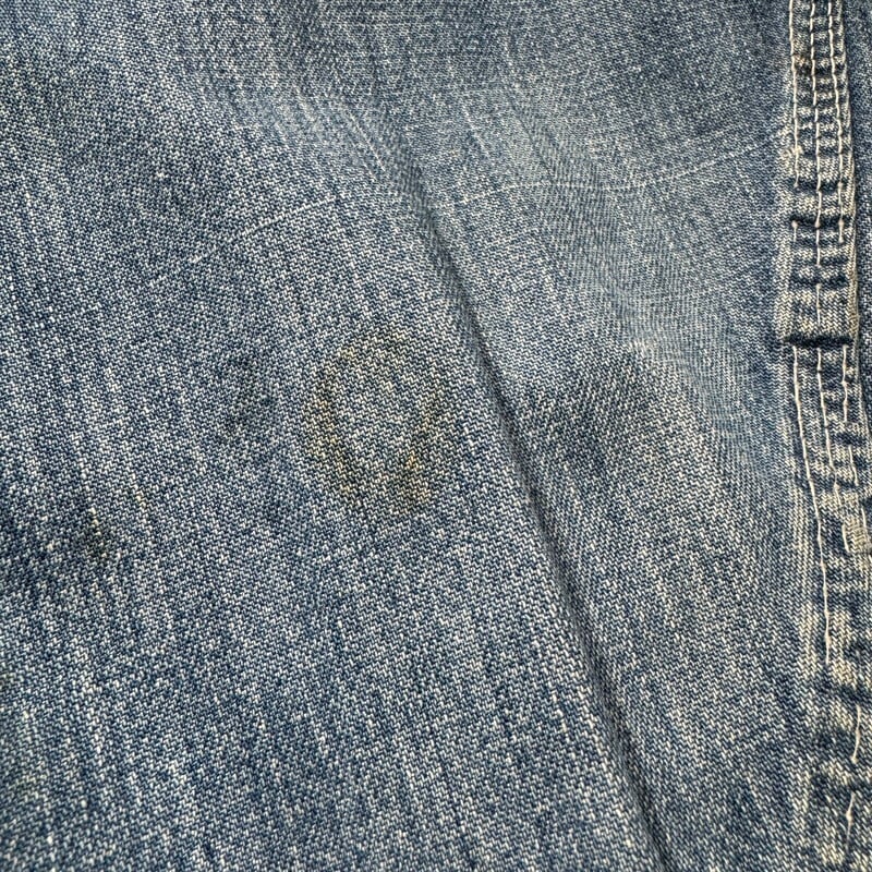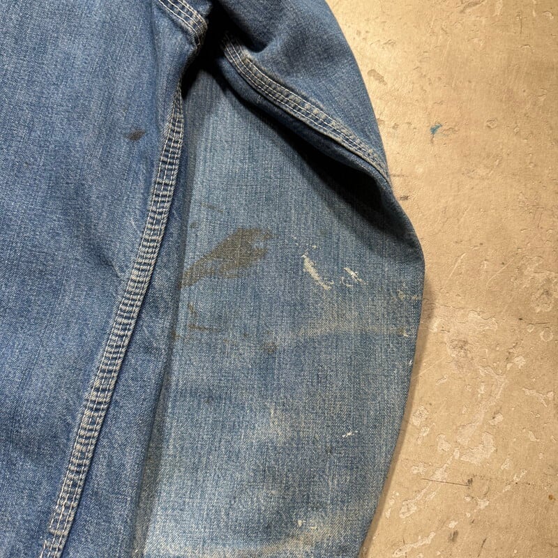 70年代頃のBIG MACデニムカバーオールです。アメリカ3大ストアブランドとして有名なJCPennyが手がけるプライベートブランドです。ご紹介するこちらは、3割程の色残りで汚れやダメージ等使用感のある個体です。フロント下部にはペンキ飛びがあり、袖にはオイル染みのような汚れも見られます。左のアームホール付近にダメージやリペア、両袖先にも擦れによるダメージがございます。裾のステッチが切れていて少しめくれています。カバーオールとしてはワークウェアらしい表情で気兼ねなく着用していただけます。サイズ表記はございませんが、40~42相当でしょうか。着やすいサイズ感でオススメです。デニムのカバーオールは以前に比べると年代問わず本当に見かける機会が減ったと思いますので、サイズ感や雰囲気がお好きな方は是非この機会にいかがでしょうか。