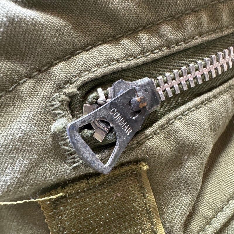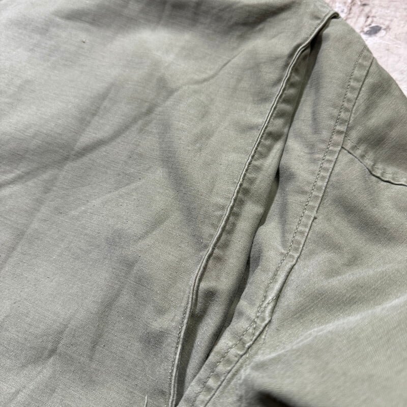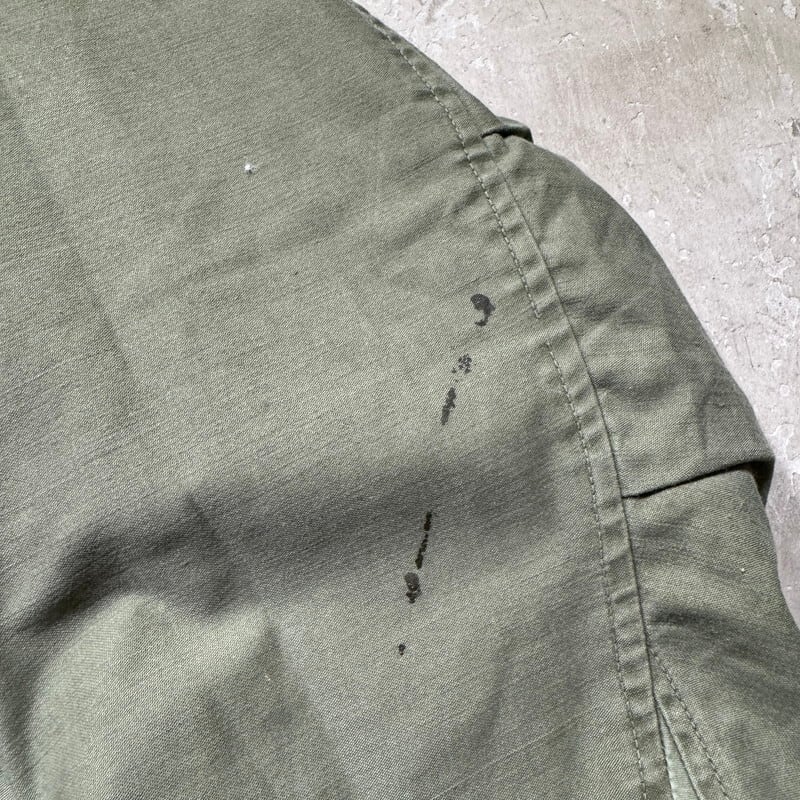 60年代のU.S.ARMY M-65フィールドジャケット1stモデルです。DSA100-1691、コントラクターは不明です。初期モデル特有のエポーレットが付かない仕様です。フロント、襟裏共にCONMAR社のアルミジッパーが使用されています。両肩や胸元にはワッペンを取り外した形跡がございます。両袖に汚れがございます。左袖ワッペンがあった箇所の下部に2mm程のダメージがございます。ジッパー差し込み部分にほつれはありますが、裂けてはいませんので開閉はスムーズです。その他気になるダメージは無く生地のコンディションは良好だと思います。MEDIUM SHORT表記で良いサイズ感です。エポーレット無しのこの1stモデルはお探しの方も多いと思いますので、この機会にいかがでしょうか。SHORT丈は探しても見つかりづらいと思いますのでサイズが合う方はオススメです。