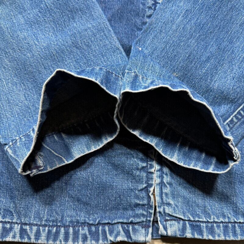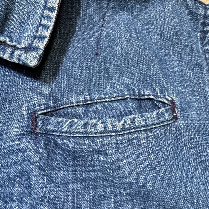 60年代頃のUnknownデニムワークジャケットです。タグが欠損していますのでブランド等は不明ですが、AL MILLER等のUSNデニムジャケットに似たデザインです。フロントはGRIPPERのカムロックジッパーが使用されています。袖は筒袖で、アジャスターボタン等は付きません。背面にはアクションプリーツが入ります。左肩にリペアが見られます。背面に糸抜けの様な線が入っていますが、着用に問題はございません。その他目立つダメージや汚れは無くコンディションは良好です。サイズは大き目で、44~46相当かと思われます。非常にシンプルなデザインですので幅広いスタイリングにお使いいただけます。このあたりのアイテムも見かける頻度はかなり減ってきた印象ですので、お好きな方は是非この機会にいかがでしょうか。