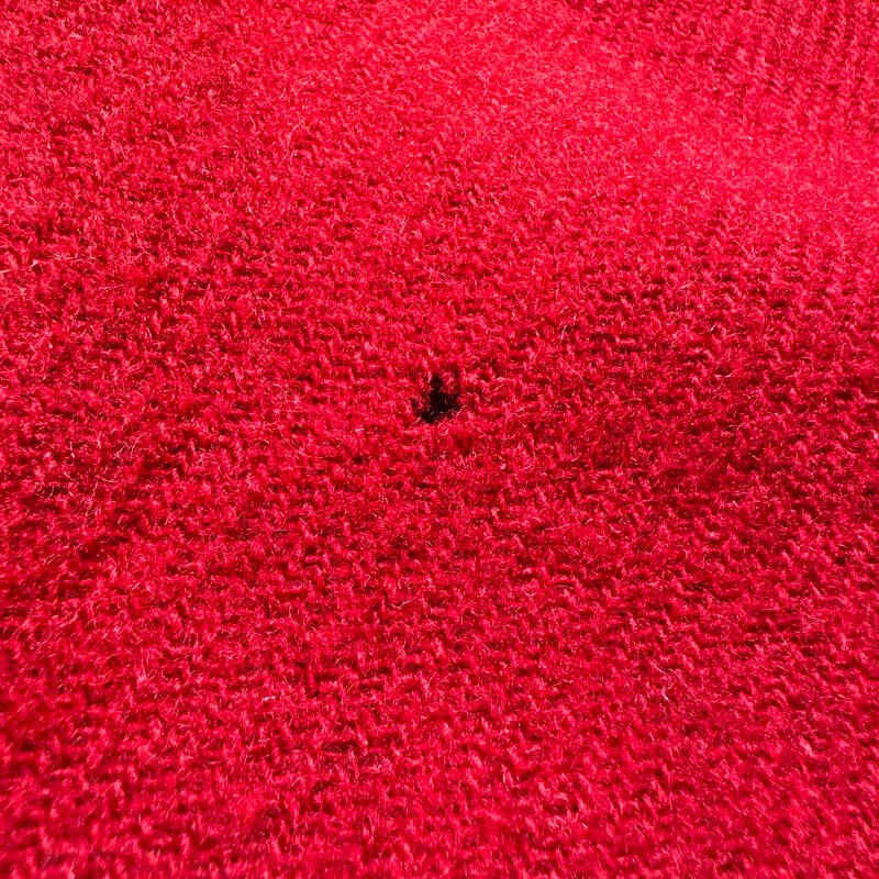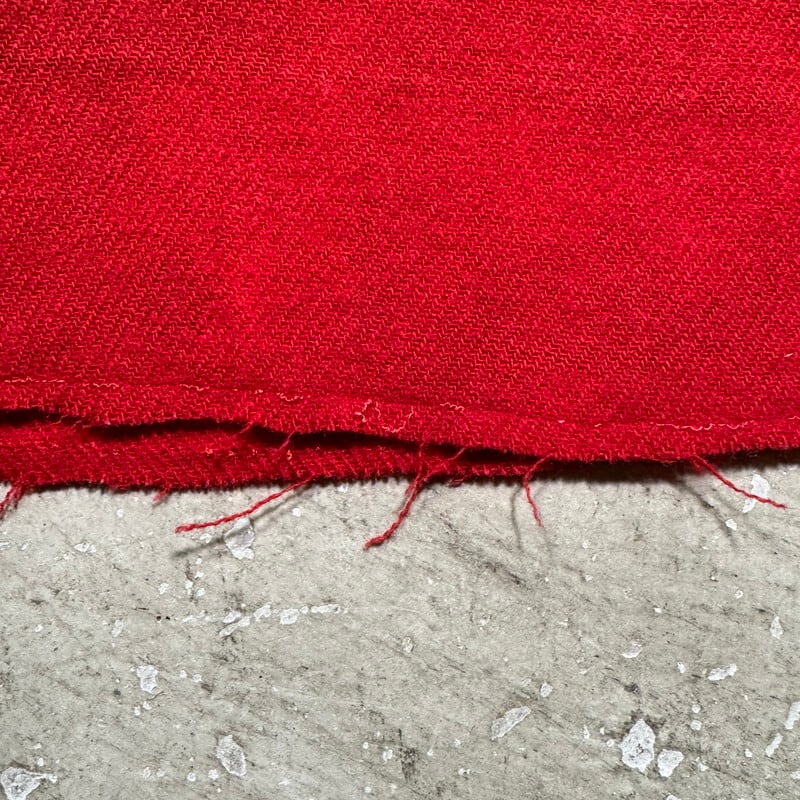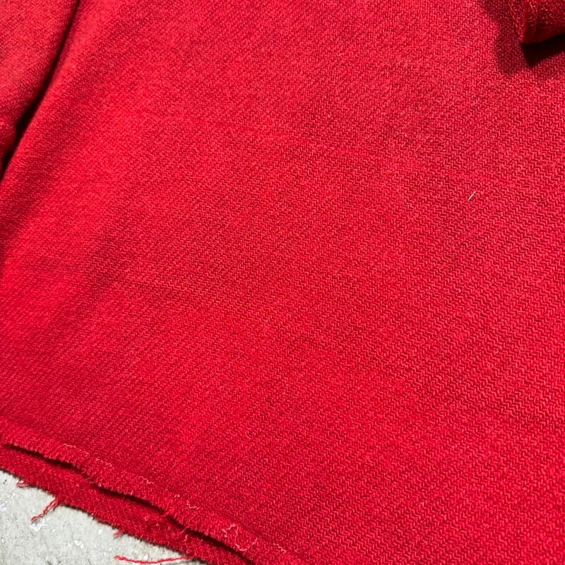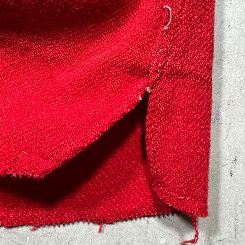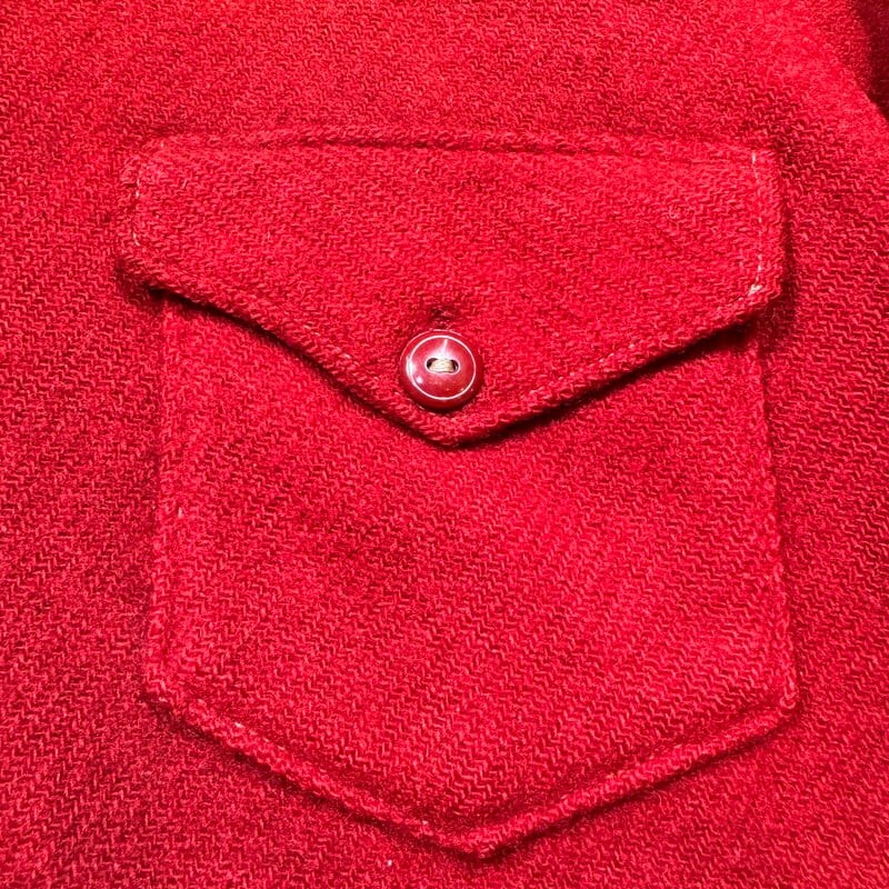 30年代初頭頃のWoolrichハーフジッププルオーバーシャツです。1830年に毛織工場として創業した老舗ブランドです。1930年代初頭にJOHN RICH&BROS表記が無くなった直後のタグが付きます。先細りの襟先で、台襟は付きません。コの字留めのデコタロンが使われています。ボタンは樹脂製のオーバルボタンです。サイドにはマチは付かない仕様です。裾10cm程折り返して着用されていたようで折り曲げ跡が若干残っています。裾上げされていたのか切りっぱなしの様になっており、ややほつれが見られます。背面中央下部に3mmほどの小穴がございます。ボディが赤いので分かりづらいですが、全体的にやや薄汚れがございます。サイズは16表記で身幅もあり着用しやすいサイズ感です。今となっては絶滅危惧なこの古いタグが付くWoolrichはなかなか見かける機会もないと思いますので、是非コレクションに加えてみてはいかがでしょうか。