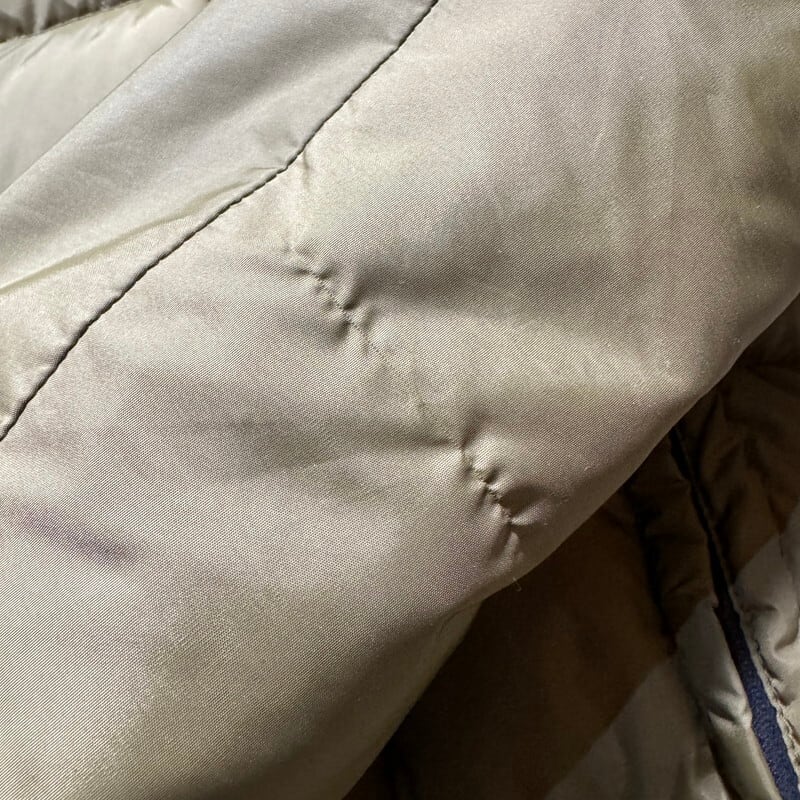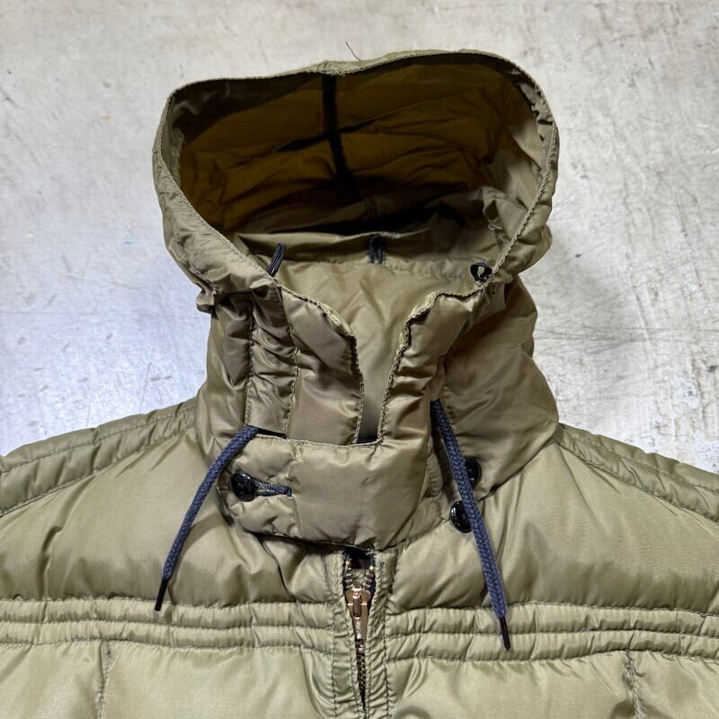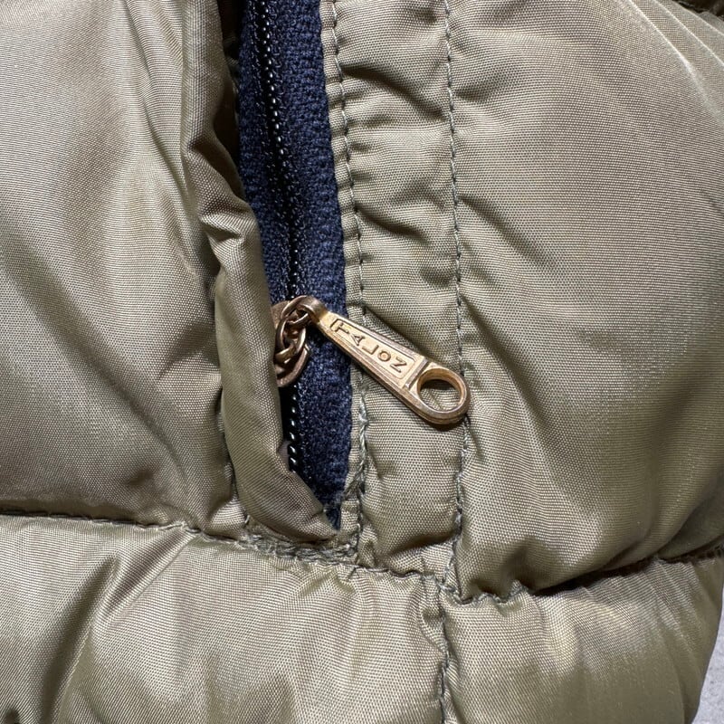 60年代のTEMPCO QUILTERSキルティングダウンジャケットです。創業年は不明ですが、かつてアウトドアメーカーが多くひしめき合っていたシアトル発のダウンブランドです。ボディにはブロック状のキルティングで袖はプレーンタイプのデザインです。フロントはCONMAR、ハンドウォーマーポケットには涙TALONが使用されています。小ぶりなフードは丸めて襟裏に収納できます。首元のチンストラップも良い雰囲気です。一見するとエディバウアーのモデルの様な印象です。襟元にうっすらと汚れがあり、多少使用感はございますが目立つダメージ等は無くコンディションは良好かと思います。ML表記ですが、ゆったりとした作りでL~XL相当です。落ち着いたオリーブカラーも良く、合わせやすい1着です。サイズも良いのでお好きな方は是非いかがでしょうか。