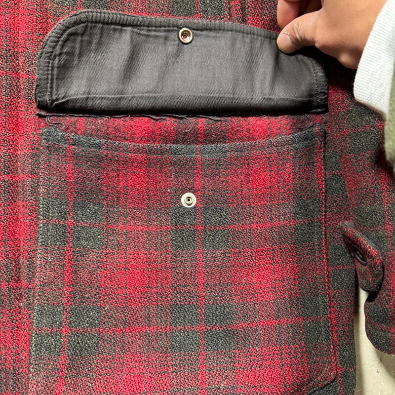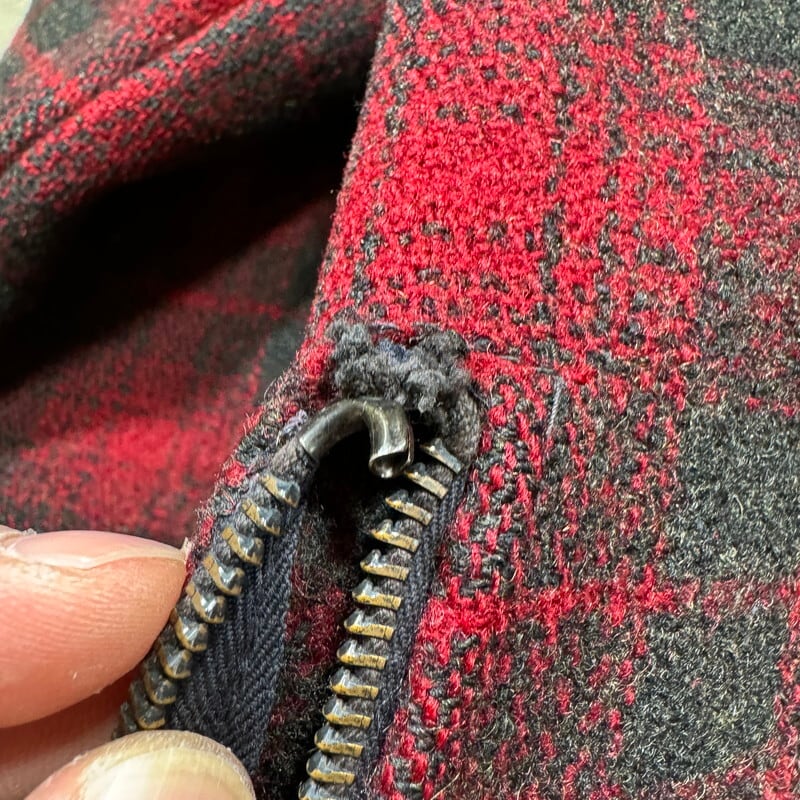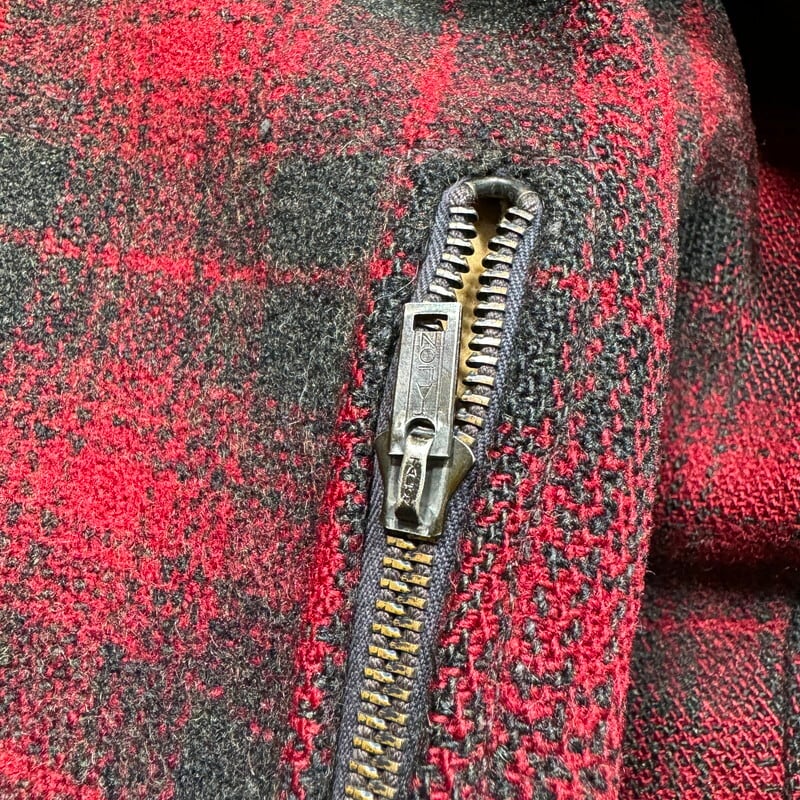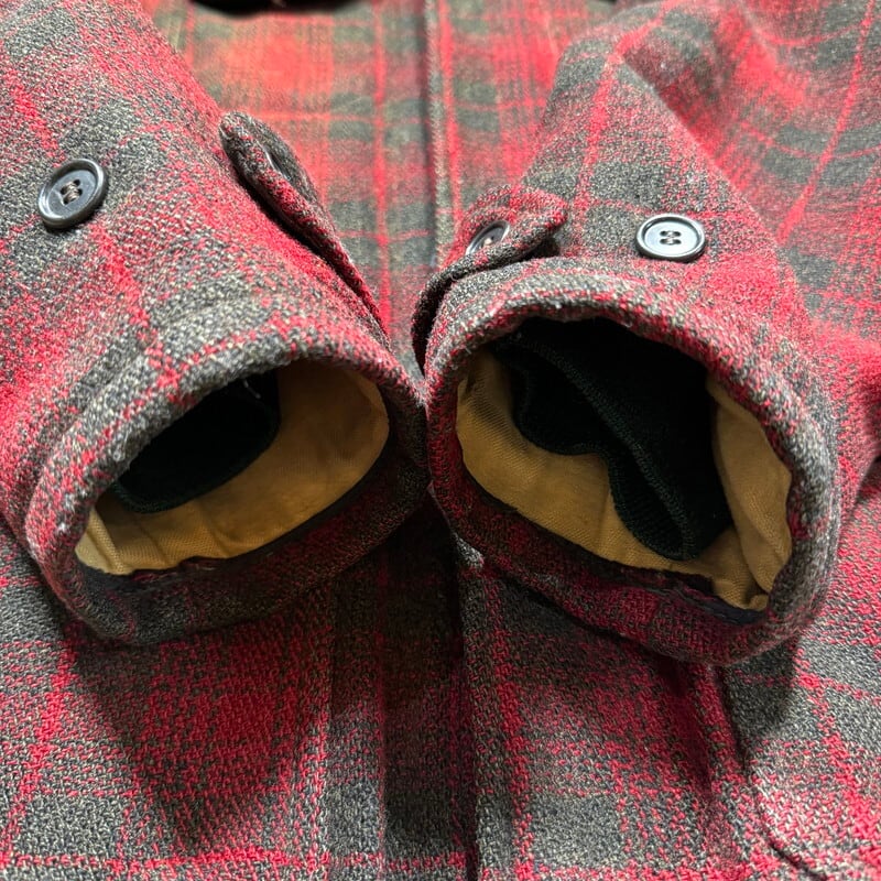 30年代から40年代初頭頃と思われるJOHNSON WOOLEN MILLSウールハンティングコートです。JOHNSON WOOLEN MILLSは1842年アメリカバーモント州で創業したアウトドアウェア等を製造する老舗ブランドです。ご紹介するこちらのアイテムは、フロント6ポケット、背面にゲームポケット、内側に一つポケットが付くタイプのモデルで、ブラックが褪色しオリーブの様な色味とレッドのチェックがクラシック感漂う1着です。袖とフロントセンターは縫いつけボタン、6つのポケットは無刻印のスナップボタンで、背面のゲームポケット両サイドはTALONジッパーが使われています。スナップとジッパーは元々ブラックフィニッシュ仕上げで経年により塗膜は剥がれています。襟元にはチンストラップが付きますので防寒用に襟を立てる事も可能です。フロント真ん中のボタンが付け替えられています。内側脇部分にライニングのハンドリペアがあり、一番下のポケット裏側にも当て布によるリペアがございます。右背面裾にL字型のリペアがあり、ゲームポケット左尾ジッパーエンドが取れかけています。その他色褪せやライニングに汚れ等はございますが、年代を考慮するとコンディションは悪くないかと思います。サイズは40表記ですが少しゆとりが有りますので42相当はあるかもしれません。以前も書きましたが、JOHNSONの古い年代のアイテムはなかなか出ませんのでお好きな方は是非いかがでしょうか。リペア等考慮していますので年代の割にお手頃かと思います。