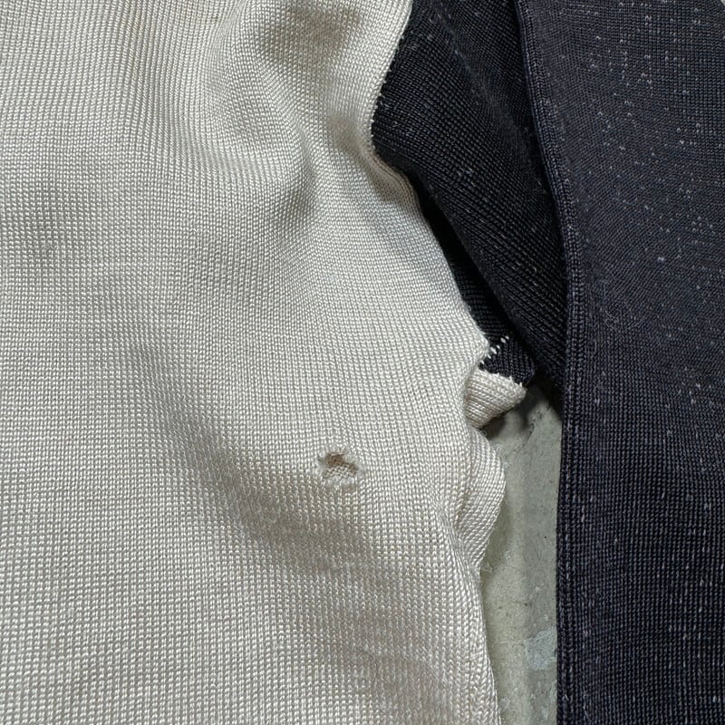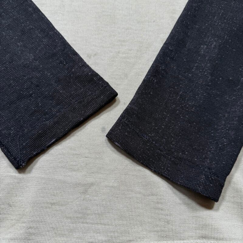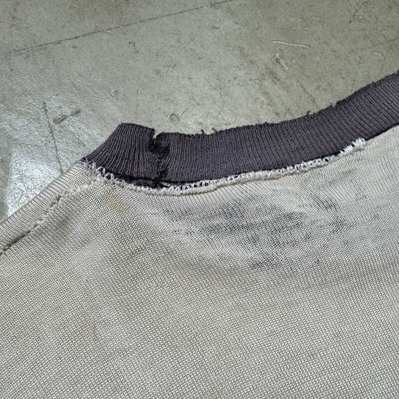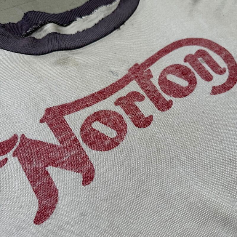 50年代頃のChampion3トーンL/Sカットソーです。ナス紺×ホワイト×杢ネイビーの珍しい3トーン仕様でフロントには1898年にイギリスで創業したバイク会社のNortonのロゴがプリントされています。ボディは全てレーヨンと思われ(ネックはコットン混?)全体的にダメージや汚れのある個体です。裾にランタグが縫い付けられています。袖の色味が少し特徴的で、濃いネイビーにパープルの様な部分的な色落ちがあり杢のように見えます。左袖先や裾、脇等にハンドステッチでの縫い直しがございます。サイズ表記部分が解れて確認できませんでしたが、S~M相当かと思われます。Championボディで、珍しいとされるハーレーダビッドソン物より遥かに珠数が少ないと思われます。ダメージや汚れのある個体ですが、非常に雰囲気がありますので、ヴィンテージデニムとの相性は抜群です。少し小さめですが、タイト目に合わせてみてはいかがでしょうか。