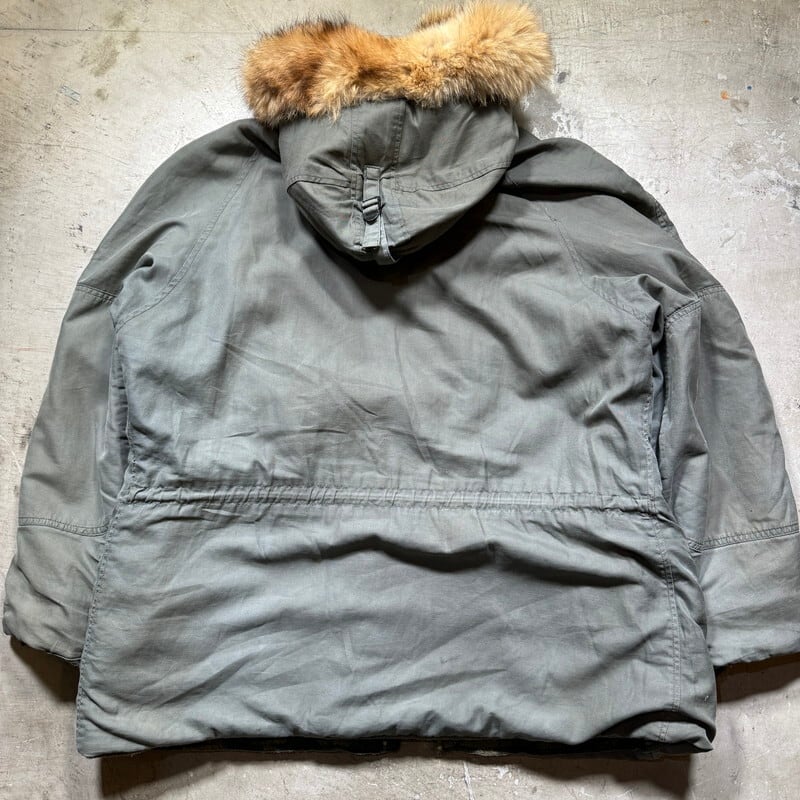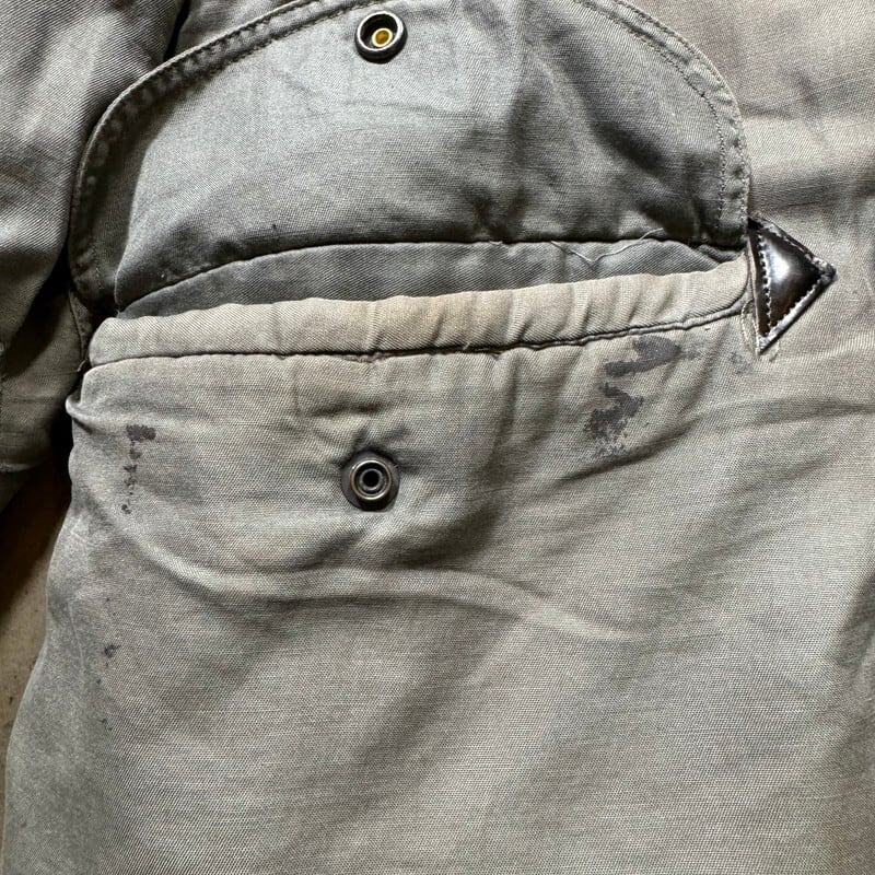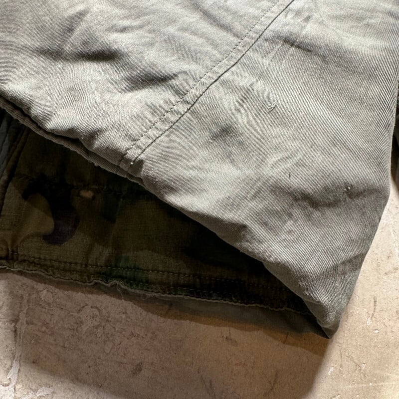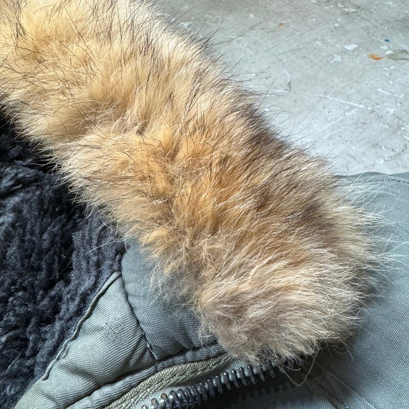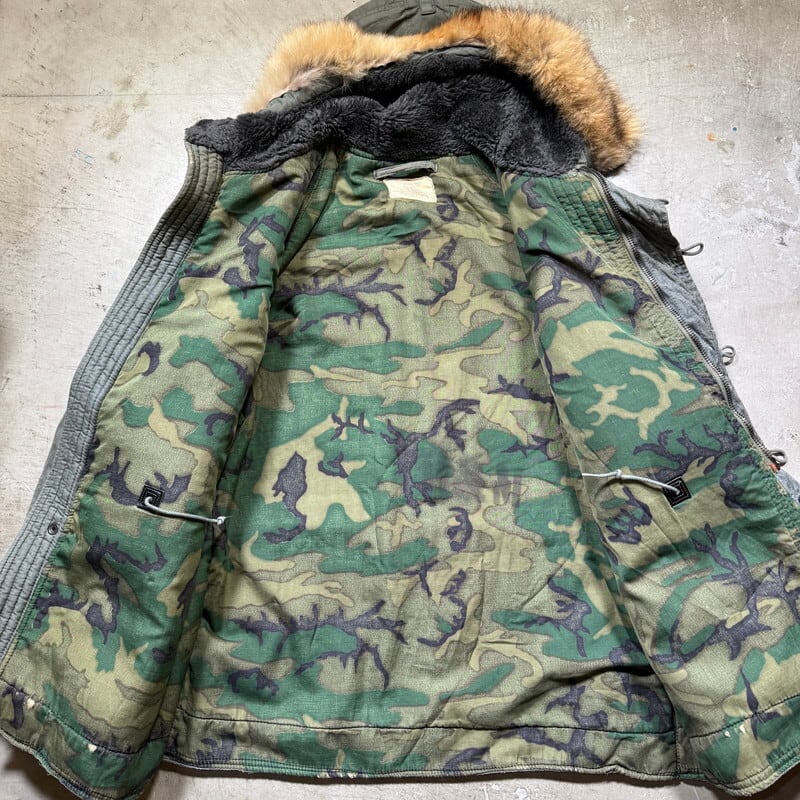 70年代のU.S.AIR FORCE N-3Bフライトジャケットです。スペックナンバーはMIL-J-6279H、コントラクトはDSA100-72-C-0309、1972年会計のSKYLINE CLOTHING社製。ご紹介するこちらは、一般的なN-3Bと違い、ライニングにERDLのグリーンリーフ柄が採用されたモディファイドモデルです。ファーにはリアルコヨーテファーが使われています。ジッパーはSCOVILLが採用されています。シェルはコットンで、通常のN-3Bに比べる柔らかい生地感です。全体的に汚れが見られ、特に右肩付近に大きなシミがございます。ジッパーの差し込み部に若干の解れがありますが、開閉に問題はございません。袖先内側にダメージがいくつもあり、一部ハンドリペアが施されています。裾付近にも擦れによるダメージ等がございます。コットンナイロンの個体に比べると少し重さも軽減されているように感じますので着やすいのではないでしょうか。他のモディファイドモデルも様々存在しますが、やはりこのグリーンリーフカモのライニングが付く個体は魅力的だと思います。LARGE表記ですが、着やすいサイズ感で、170cm70kgのスタッフで丁度良いです。このモデルをお探しだった方は是非この機会をお見逃しなく。