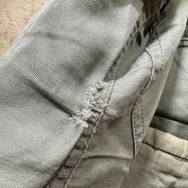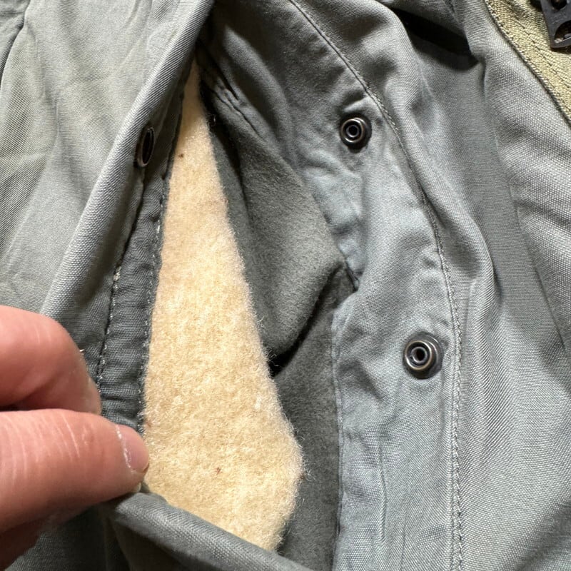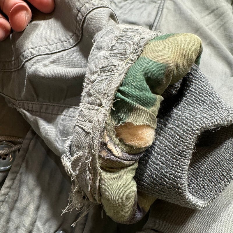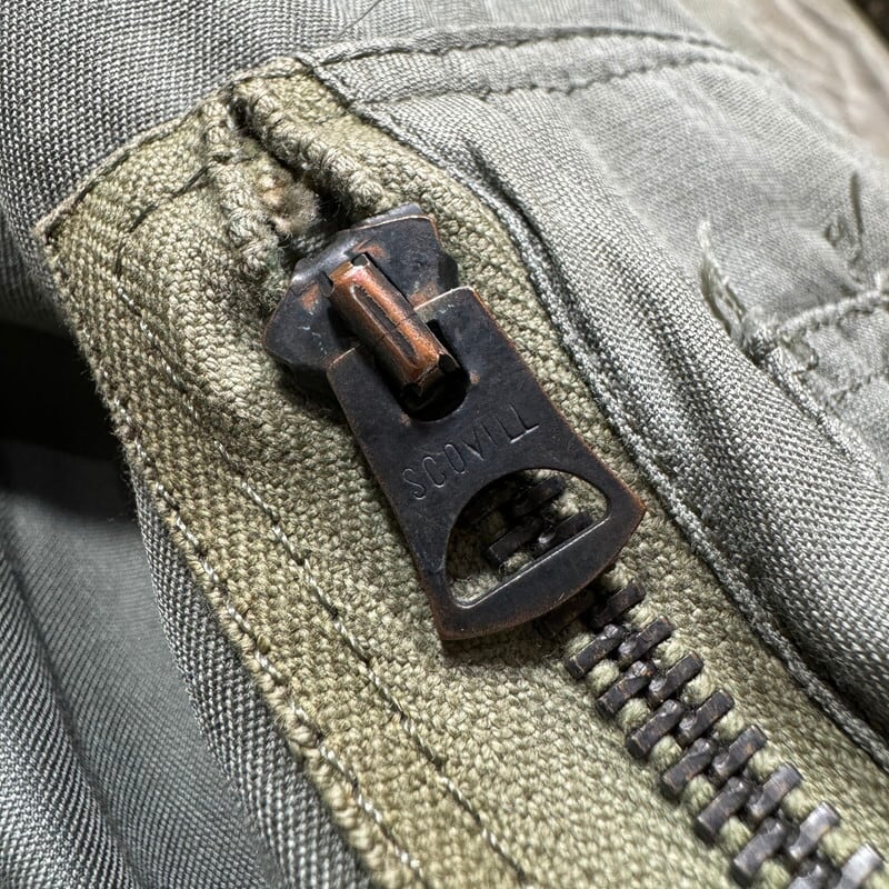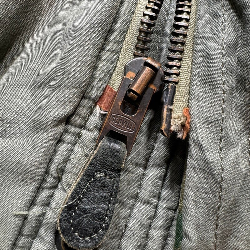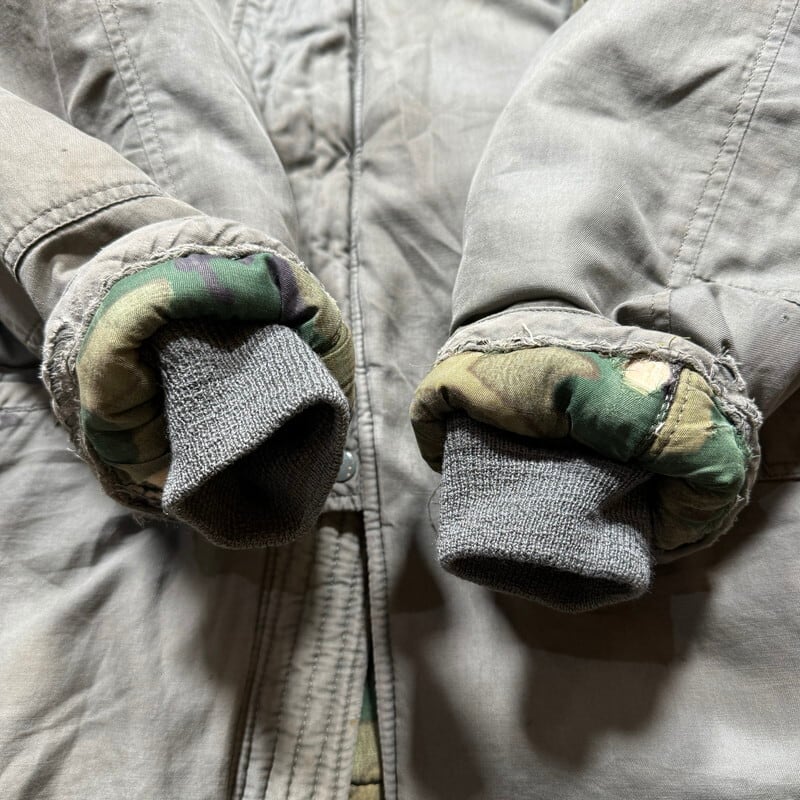 70年代のU.S.AIR FORCE N-3Bフライトジャケットです。スペックナンバーはMIL-J-6279H、コントラクトはDSA100-72-C-0309、1972年会計のSKYLINE CLOTHING社製。ご紹介するこちらは、一般的なN-3Bと違い、ライニングにERDLのグリーンリーフ柄が採用されたモディファイドモデルです。ファーにはリアルコヨーテファーが使われています。ジッパーはSCOVILLが採用されています。シェルはコットンで、通常のN-3Bに比べる柔らかい生地感です。全体的に汚れが見られ、特に右肩付近に大きなシミがございます。ジッパーの差し込み部に若干の解れがありますが、開閉に問題はございません。袖先内側にダメージがいくつもあり、一部ハンドリペアが施されています。裾付近にも擦れによるダメージ等がございます。コットンナイロンの個体に比べると少し重さも軽減されているように感じますので着やすいのではないでしょうか。他のモディファイドモデルも様々存在しますが、やはりこのグリーンリーフカモのライニングが付く個体は魅力的だと思います。LARGE表記ですが、着やすいサイズ感で、170cm70kgのスタッフで丁度良いです。このモデルをお探しだった方は是非この機会をお見逃しなく。