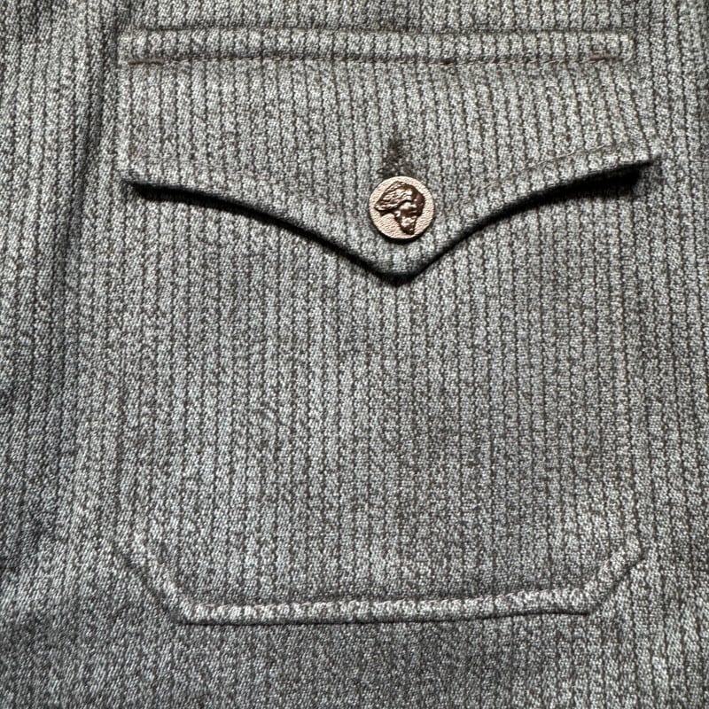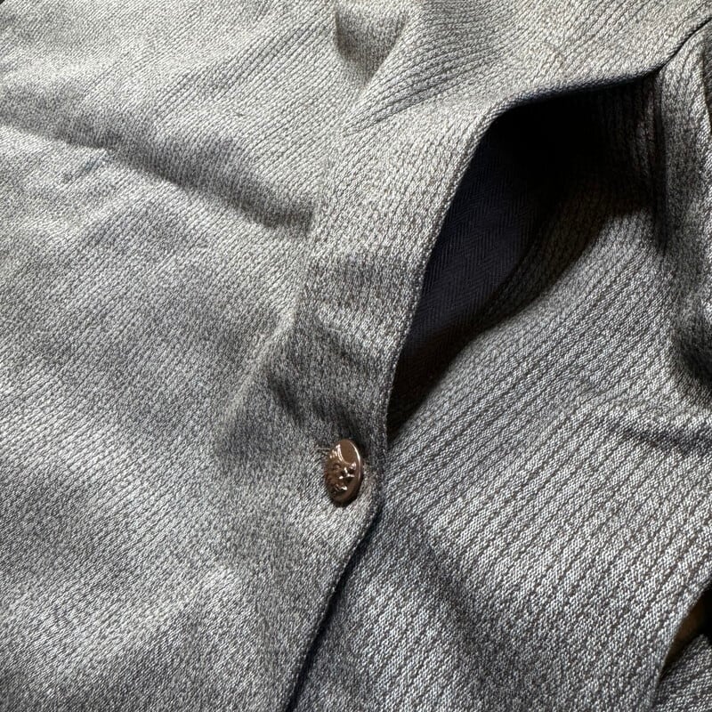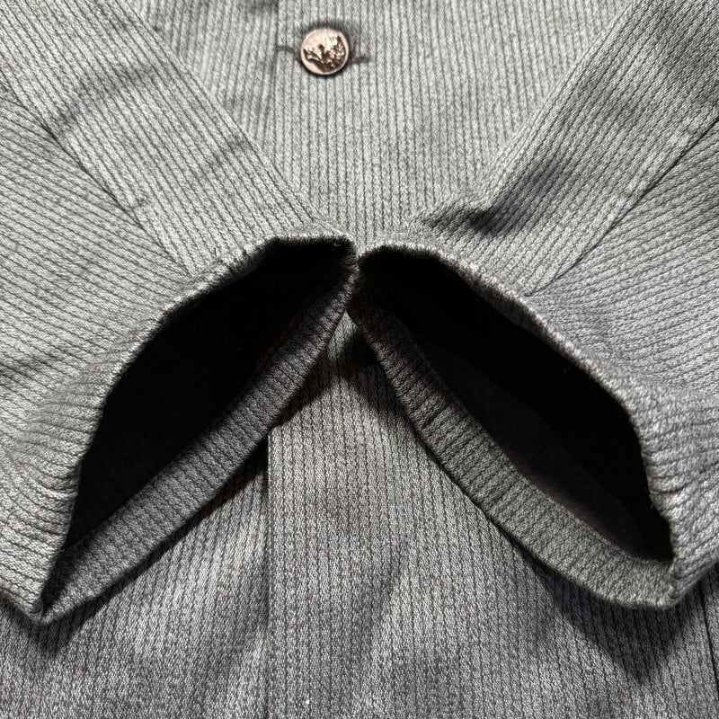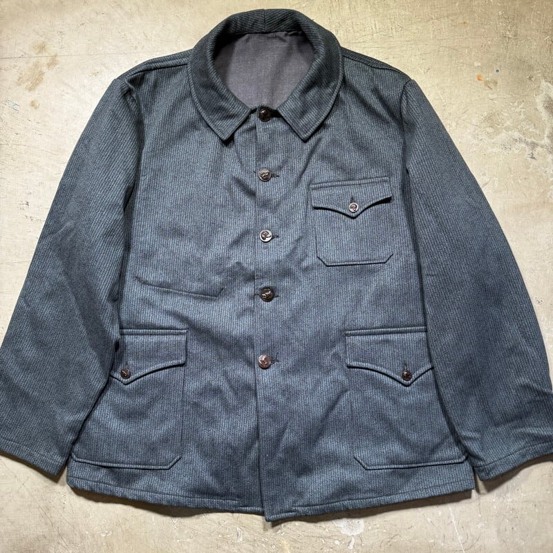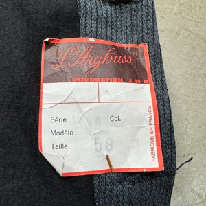 40年代から50年代頃のL.Arghuss フレンチピケハンティングジャケットです。前立て裏にフラッシャーが付く希少なデッドストックです。L.Arghussというワークウェア等を製造していたブランドの様ですが、詳細は不明です。フレンチピケは一般的にグレーが主流かと思われますが、ご紹介するこちらは写真では少し分かりづらいですが、青みの強い少し珍しい色味の1着です。狩猟犬や狼、鹿やイノシシが浮き彫りになった動物ボタンが使用されています。一番下のボタンは付け替えられているようです。フロントはフラップ付きの3ポケットで、背面は両サイドから出し入れできるゲームポケットが配置されています。ライニングの背中部分には、グレーのヘリンボーン生地が使われています。フラッシャーにサイズ58と記載されており、XL相当の大きさです。フレンチピケではなかなか出ないサイズだと思いますので、大き目をお探しだった方は是非この機会にいかがでしょうか。カラーも珍しいのでコレクションとしてもオススメです。