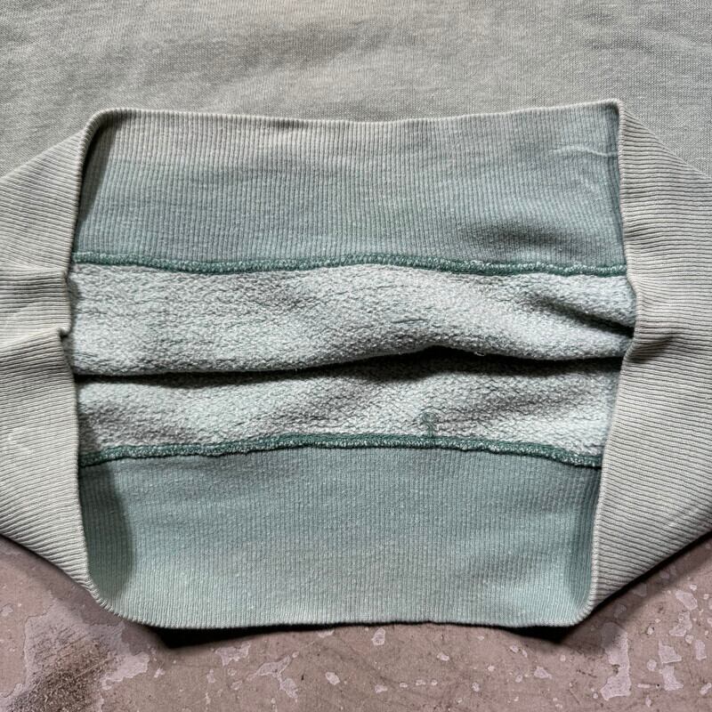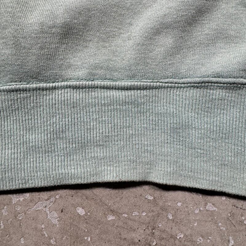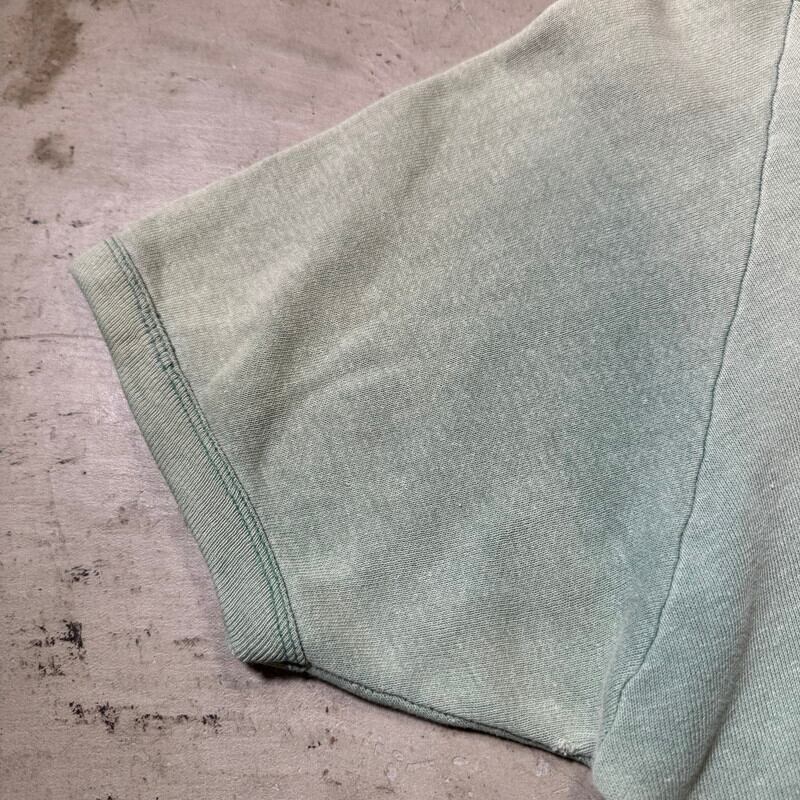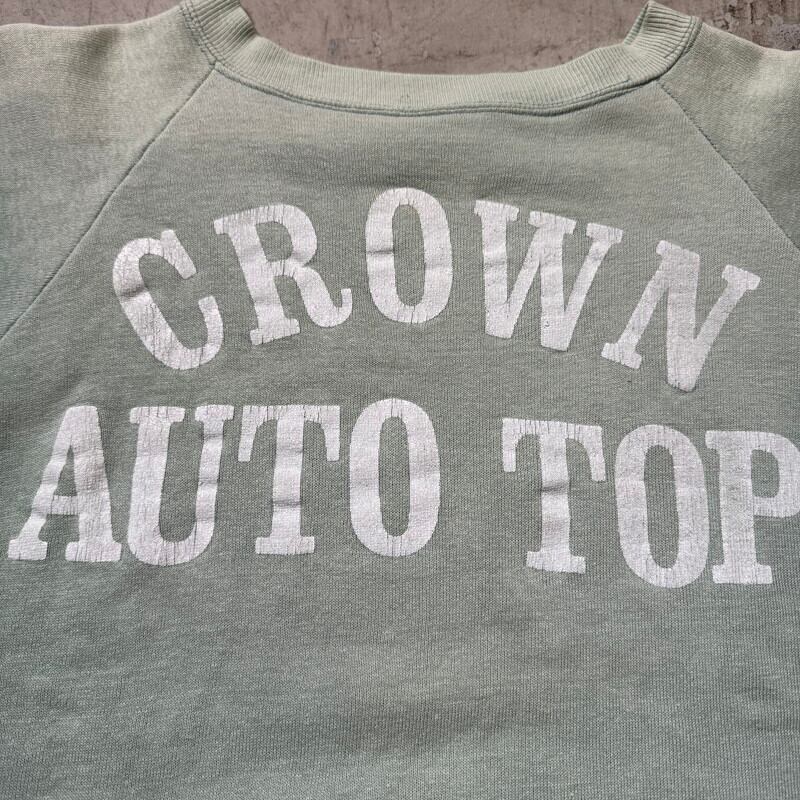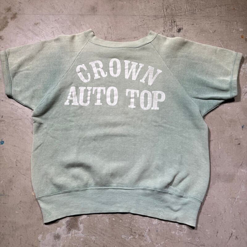 60年代頃のUnknown 半袖スウェットシャツです。タグが欠損していますので製造ブランドは不明です。フロントにプリントされたCROWN AUTO TOPは定かではありませんが1931年にオハイオ州コロンバスで設立された自動車関連の会社だと思われます(現在は廃業した可能性あり)。全体的にサンフェードした淡いライトグリーンがヴィンテージスウェットらしい表情でとても雰囲気の良い1着です。プリントのクラック具合も良い塩梅です。背面に小さなシミがいくつかございますがダメージ等はございません。身幅はゆったりとしていますが、着丈が短いのでS~M相当のサイズ感です。小柄な方ですとバランスよく着ていただけるのではないでしょうか。ヴィンテージスウェットではなかなか見る機会の少ないグリーンボディですのでサイズが合う方には大変お得なプライスかと思います。ディスプレイとしても映える1着でオススメです。