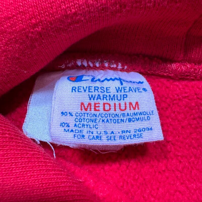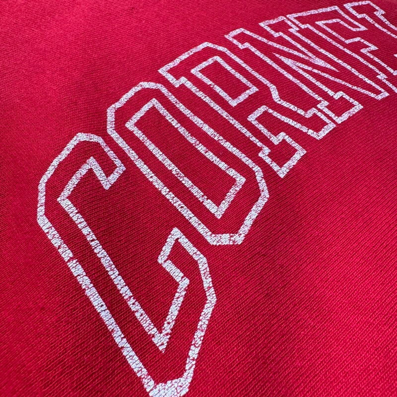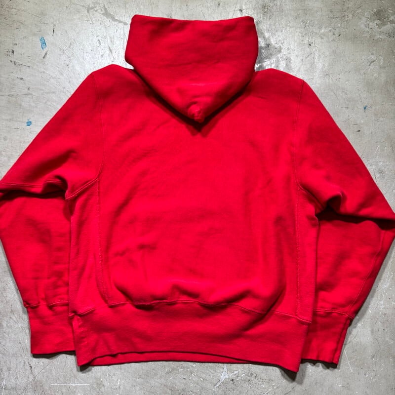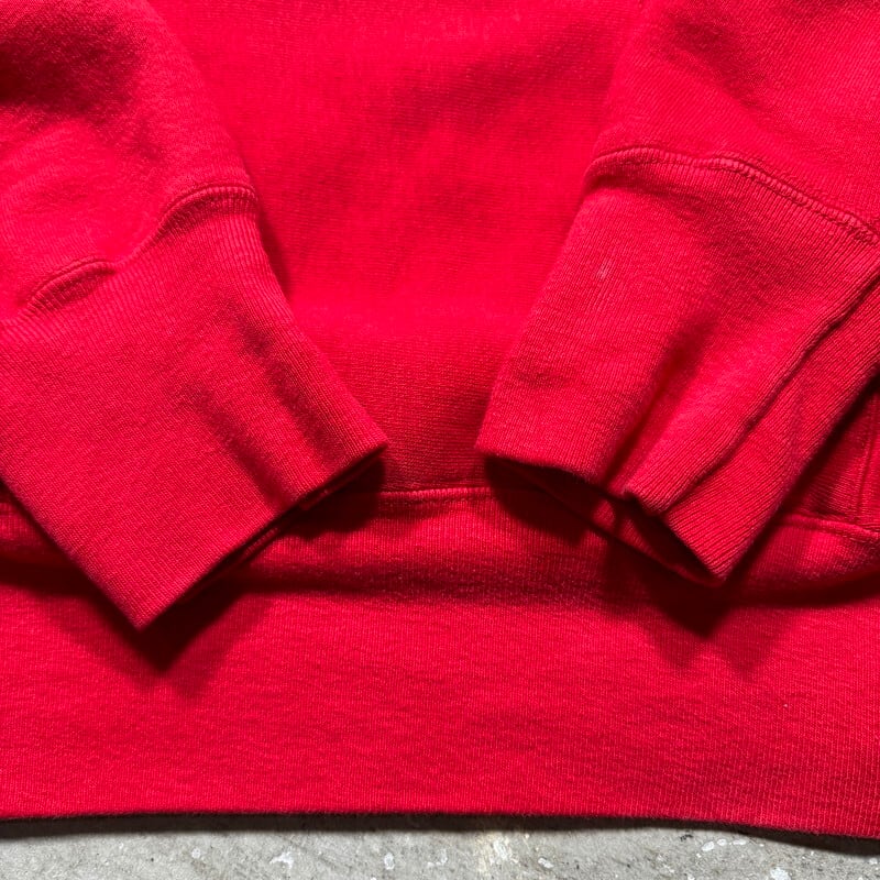 80年代のChampionリバースウィーブスウェットパーカーです。トリコの2枚タグが付くこちらは、1865年にニューヨーク州イサカで設立されたCORNELL大学のプリントが入る1着です。大学カラーであるレッドにホワイトの縁取りフォントがバランス良いデザインです。単色タグでも見られる旧型のハトメが使用されており、欠損しがちなフード紐も残っております。全体的にややフェードしておりプリントに擦れはございますが、フード付け根や袖先にもダメージは無くコンディションの良い個体です。左の袖リブに小さな汚れがございます。MEDIUM表記ですが身幅に少しゆとりがありますので合わせやすいサイズ感だと思います。トリコタグのリバースで状態の良い個体は見つかりづらくなったと思いますので、お探しだった方は是非この機会にいかがでしょうか。