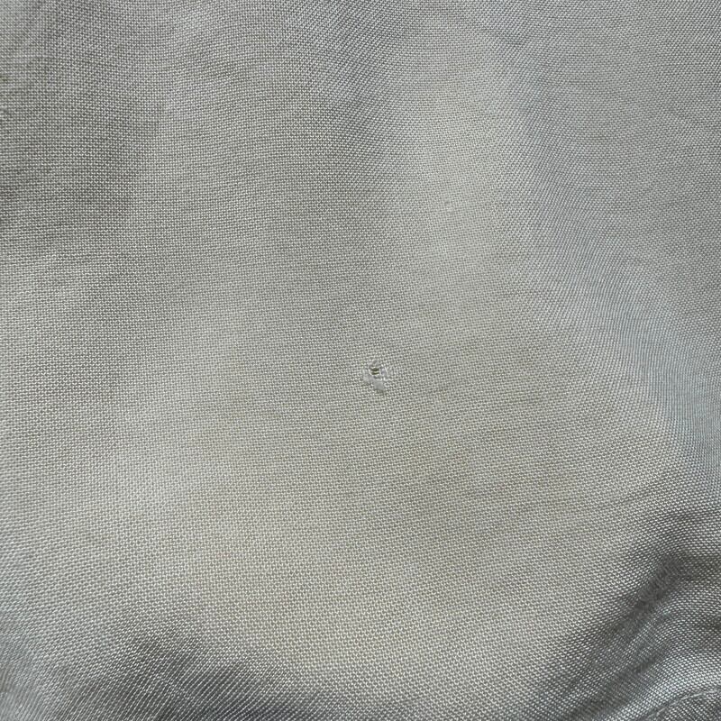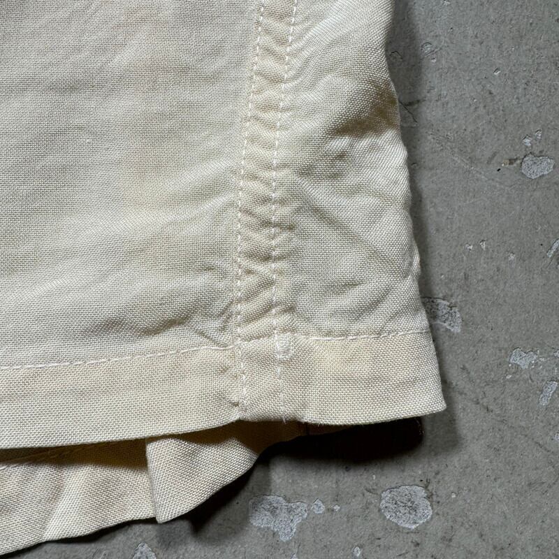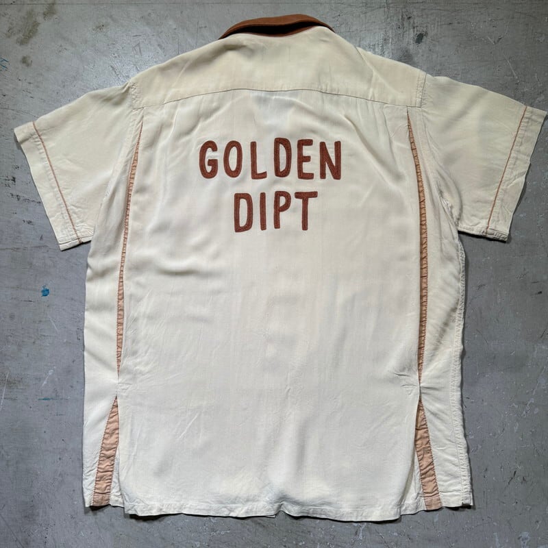 60年代頃のHiltonレーヨンボーリングシャツです。Hiltonは1956年にイリノイ州シカゴで創業した老舗ボーリングシャツカンパニーです。ご紹介するこちらは淡いベージュにブラウンの切り替えが落ち着いた雰囲気の1着です。襟には芯が入るタイプです。トップはループボタンが付く開襟仕様です。左胸にはJay,背面にはGOLDEN DIPTの文字が刺繍されています。GOLDEN DIPTは1938年に設立されたパン粉の食製品を作るブランドだと思われ、プロモーションや社内のボーリングクラブ等で使用されていたのかもしれません。襟元や背面の切り替え部分に色褪せが見られ、フロントに小さなシミがございます。フロントに2箇所、背面に1箇所小さなダメージがございます。その他使用感はございますが、状態は良好かと思います。Lサイズ表記でボックスシルエットですので合わせやすい1着です。ベージュとブラウンのカラーも雰囲気が良いのでお好きな方は是非この機会にいかがでしょうか。
