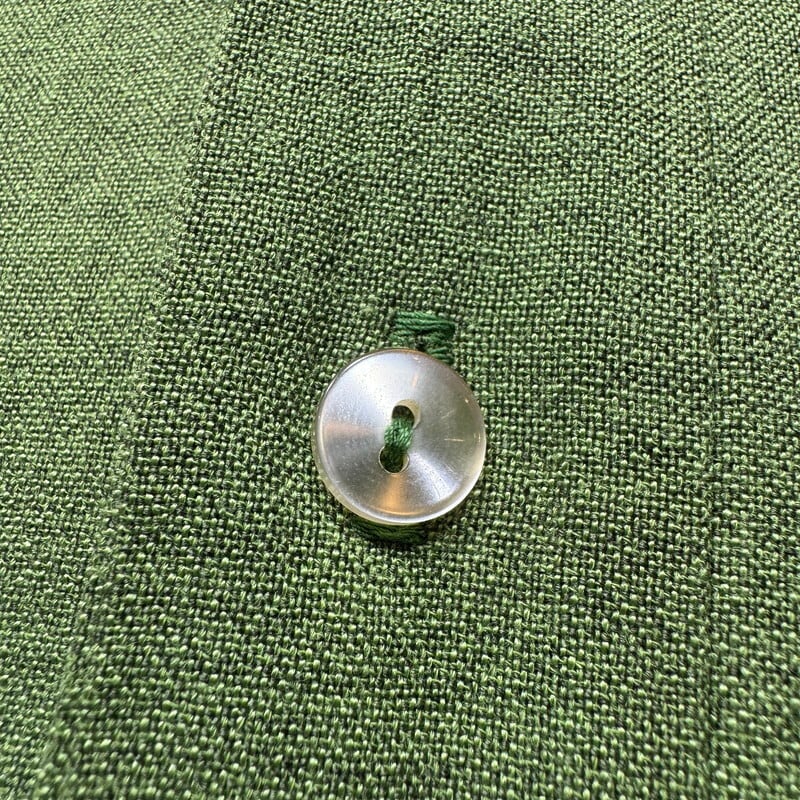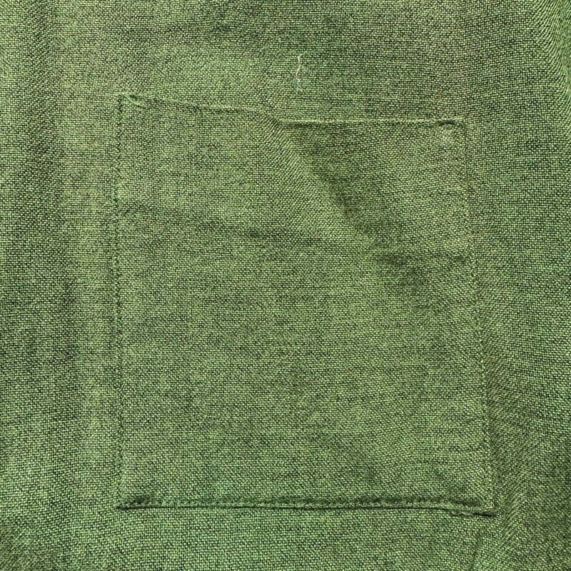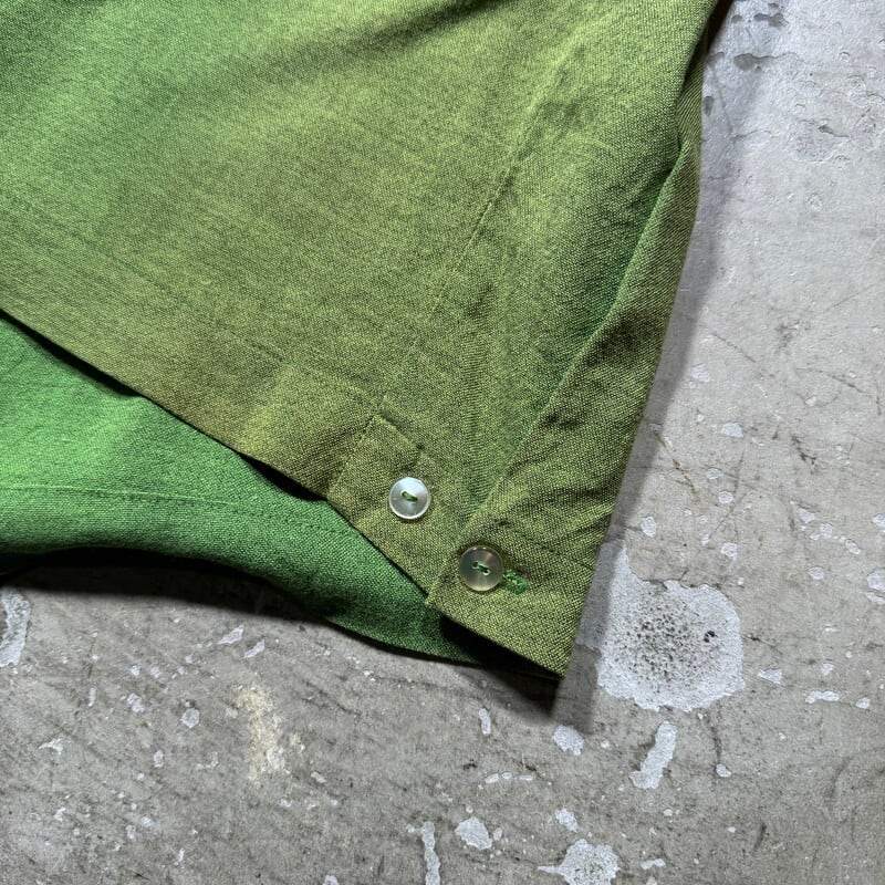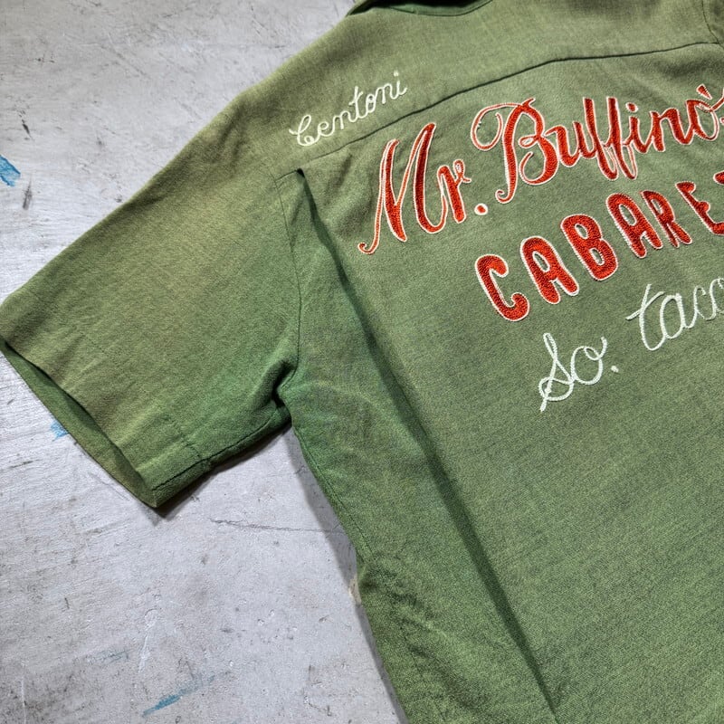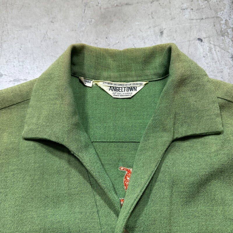 60年代頃のANGELTOWNボーリングシャツです。ブランド詳細は不明ですが、ボーリングシャツを中心に製造していたブランドのようです。コットン混のレーヨンシャツで、袋縫いの襟には芯が入ります。イタリアンカラーのようなループボタンの付かない開襟仕様です。サイドは2段階で調整できるアジャストボタンが付いています。フロントは無地、背面にはワシントン州サウスタコマにあったと思われるキャバレーの名前が刺繍されています。鶯色のような春らしい色味で、全体に褪色が見られます。左脇に1箇所小穴が有り、その他細かなシミがいくつかございます。MEDIUM表記ですが着丈はやや短めですっきりとした丈感です。フェードしたグリーンと背面の刺繍のオレンジが良いバランスでヴィンテージ感溢れる1着でオススメです。