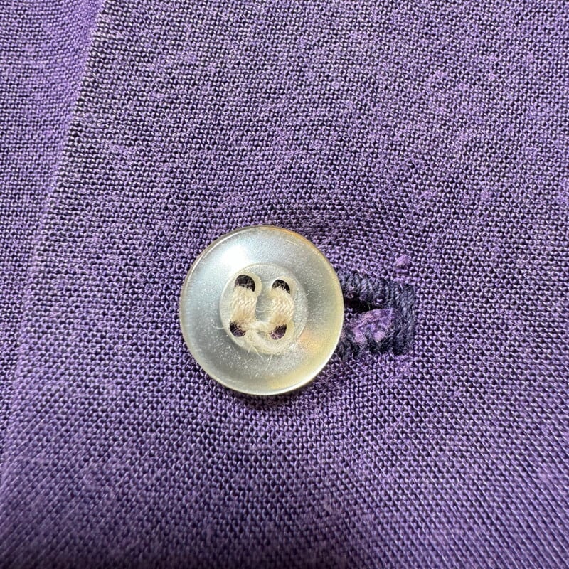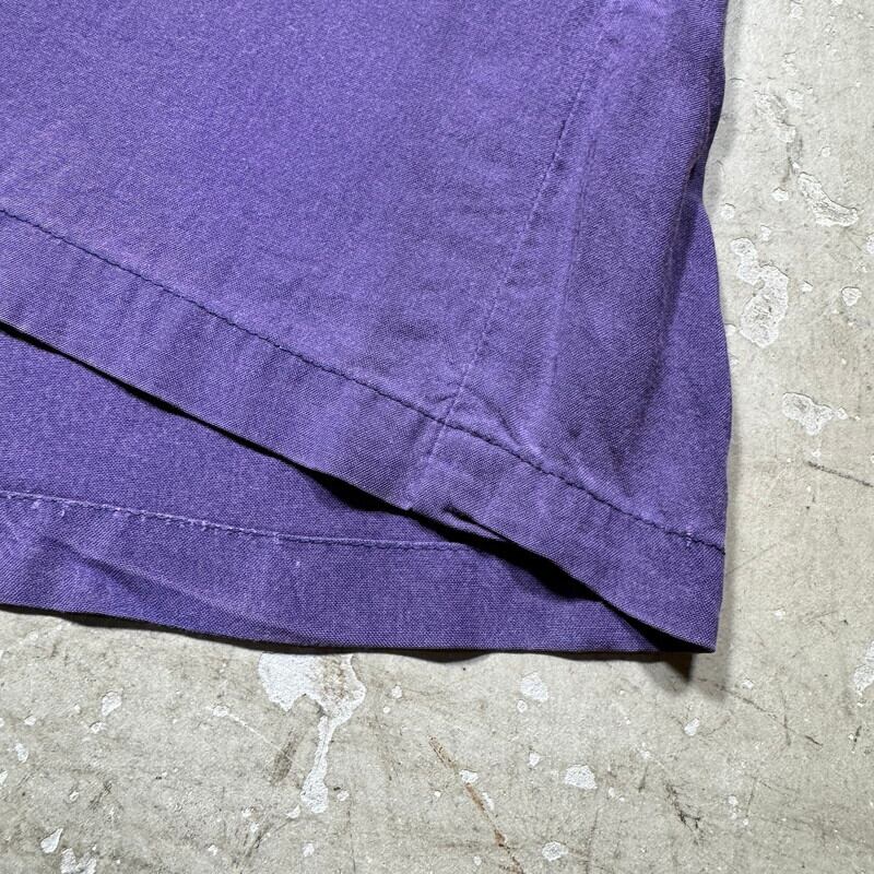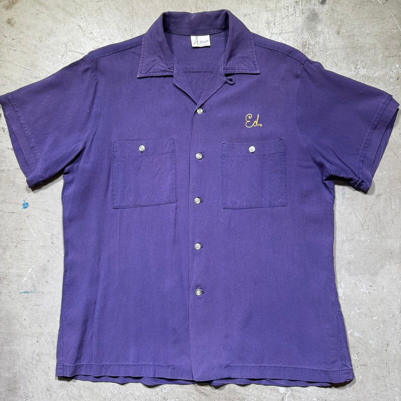 60年代から70年代頃と思われるArtvogue of californiaのレーヨンボーリングシャツです。1940年代に創業したアメリカ本土で創業したハワイアンシャツ等が有名なブランドです。ご紹介するこちらはArtvogueでもあまり見かける事のない吊りタグが備わった1着で、襟芯が入る開襟仕様です。左胸と背面に刺繍が施されています。背面のBERKELEY PUMPは田畑に人工的に水を供給する灌漑ポンプを造るメーカーで、プロモーションや社内のボーリングチームで使用されていたのかもしれません。元々パープルのようですがナス紺のようなフェードをしており非常に雰囲気の良い個体です。襟先に細かな擦れはございますが、その他目立つ汚れやダメージは特にございません。サイズ表記はございませんがメンズのS相当かと思われます。メンズとしては少し小さめですので女性の方でも合わせやすい大きさでは無いでしょうか。ナス紺の経年変化も楽しめると思いますのでサイズが合う方は是非この機会にいかがでしょうか。