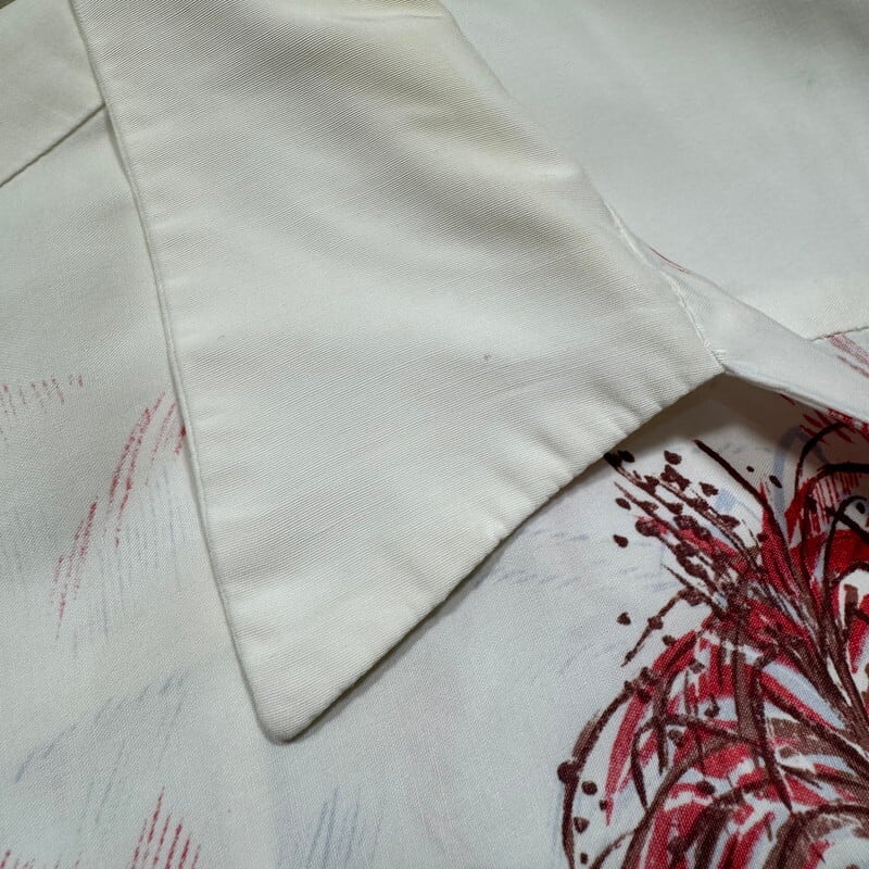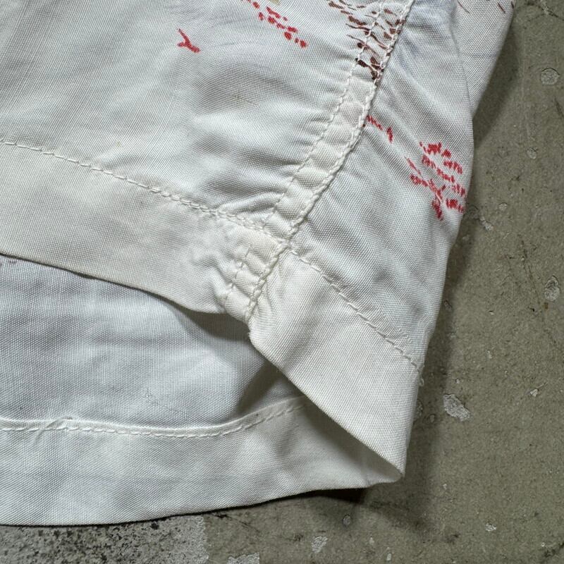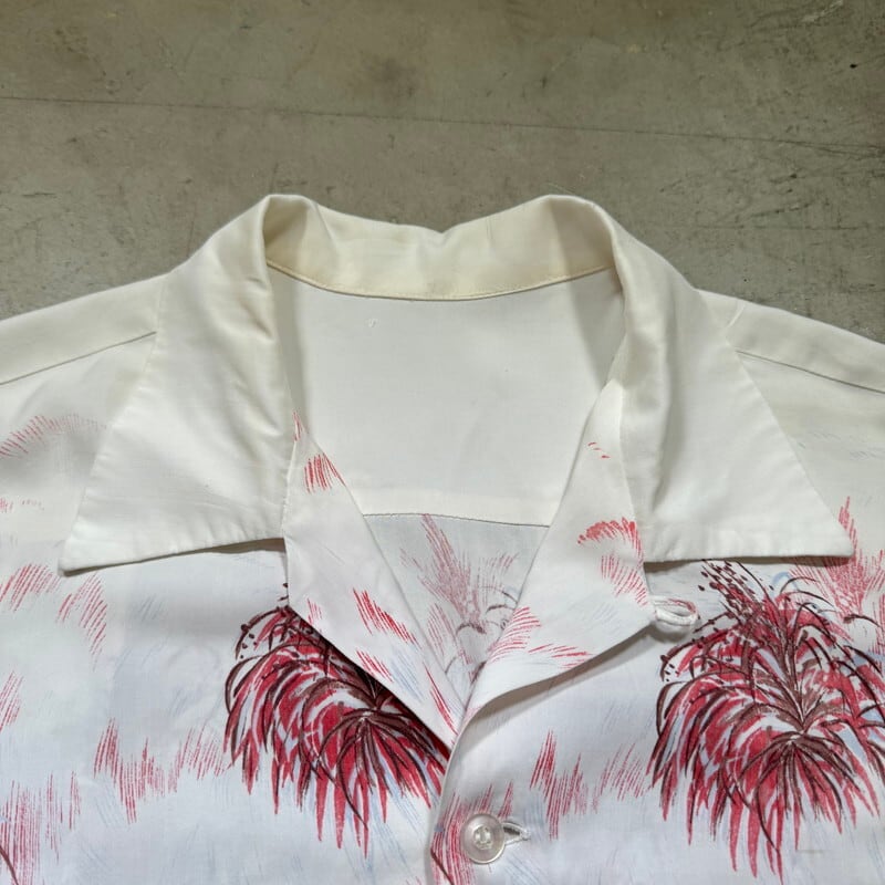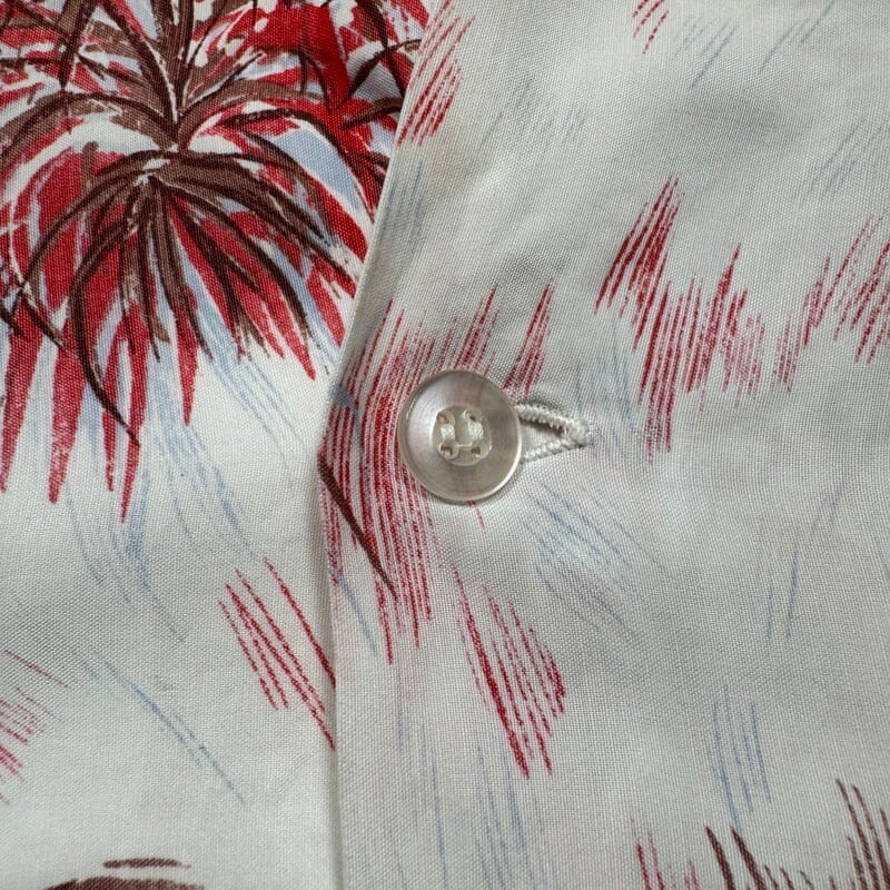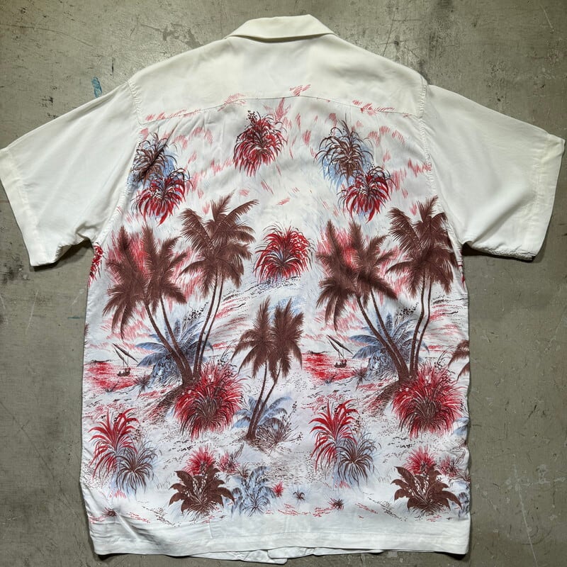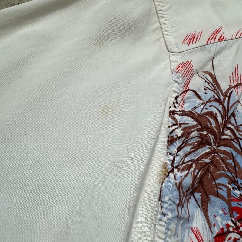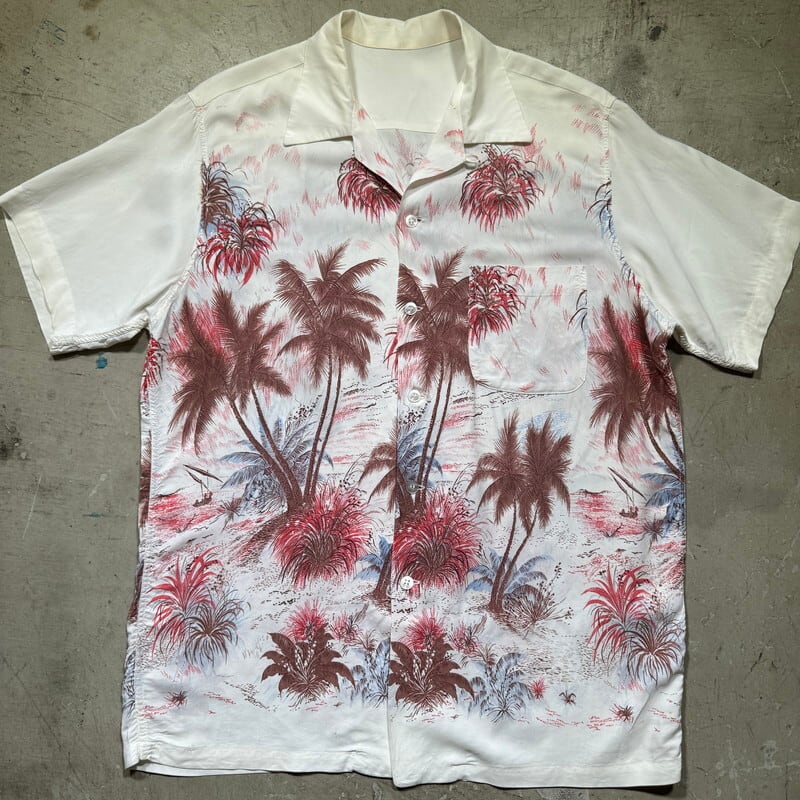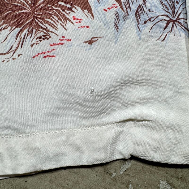 50年代頃のレーヨンハワイアンシャツです。タグが欠損していますが、DUKE KAHANAMOKU社製だと思われます。首元サイドにサイズタグが付きます。袋縫いのオープンカラーで、ボタンは全て揃っており、付け替えられた形跡はございません。ホワイトボディにピンクやブラウンベースでパームツリーなどの草木が描かれたデザインで袖にはプリントは入りません。襟元や、袖などに汚れがございます。フロントや肩、袖などにピンホールの様な小さなダメージがいくつかございます。左右のアームホール付け根の生地に一部ほつれが見られます。上から4つ目のボタンホール横の生地にもダメージがございます。全体的な使用感はございますが、致命的なダメージはございませんのでまだまだ長く着用していただけます。Lサイズ表記ですので緩めに合わせていただけます。落ち着いた色味なのでサマースラックス等と合わせてクラシックなスタイルに合わせてもカッコ良いと思います。