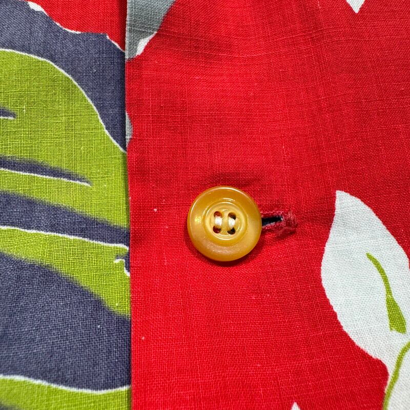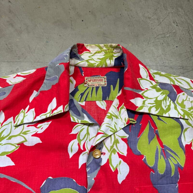 50年代頃のMcGREGORコットンハワイアンシャツです。McGREGORは1921年に創業した、100年を越える老舗アメリカンカジュアルブランドです。ご紹介するこちらは、ロングポイントと呼ばれる襟先の長い古いディティールで40年代後半から50年代初頭頃のモデルかもしれません。胸ポケットは綺麗に柄合わせされています。フロントはベークライトの様な樹脂ボタンが付きますが、一番下だけ交換されています。ジンジャー系の花や葉っぱが描かれたトロピカルな雰囲気のデザインです。全体的にバランスよく褪色していますので派手さは軽減され合わせやすい色味だと思います。襟に若干薄汚れはがあり、タグに一部ほつれはございます。左袖先にボンド(ペンキ?)の様なものが付着した箇所に小さいダメージがございます(画像8枚目)。その他目立つダメージは無くコンディションは良好です。Sサイズ表記ですが、着丈もありMサイズ寄りのサイズ感かと思います。ヴィンテージハワイアンシャツの中でもお探しの方も多いコットン地ですのでサイズが合う方は是非この機会をお見逃しなく。
