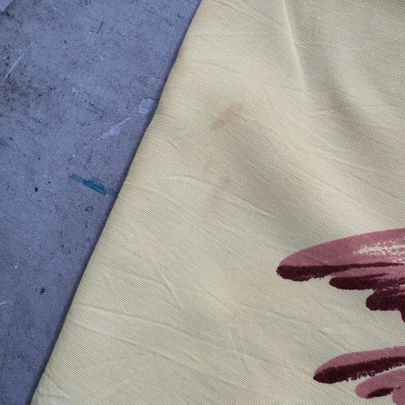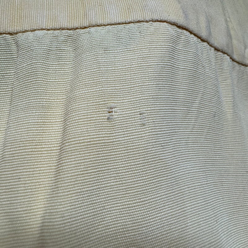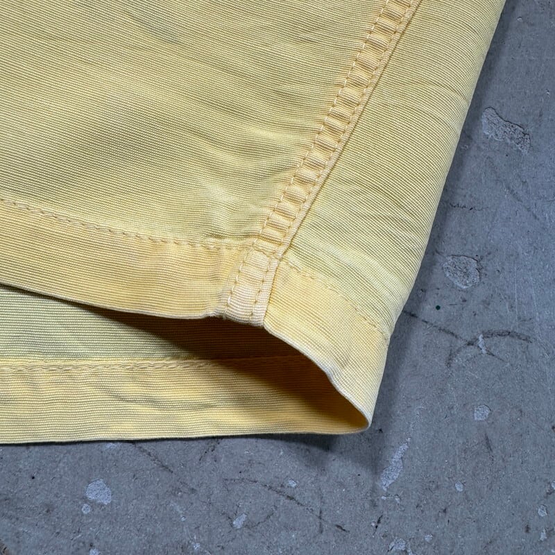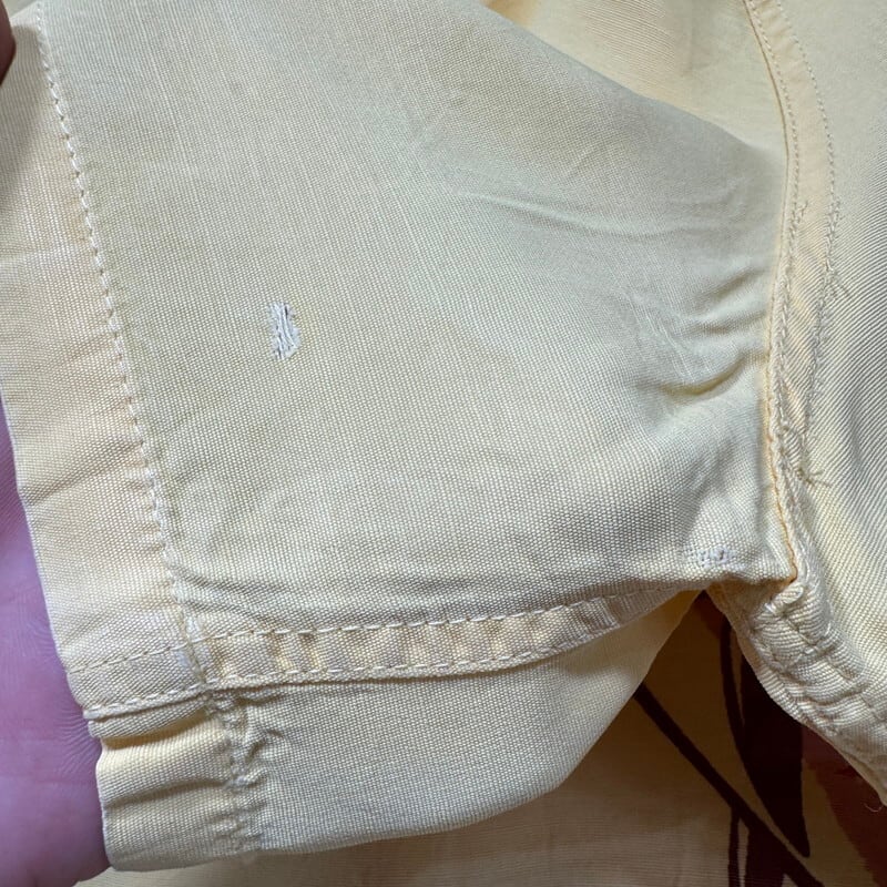40年代頃のCatalinaレーヨンハワイアンシャツです。1907年にカリフォルニア州ロサンゼルスでBentz Knitting Millsとして創業し、1928年に社名がCatalinaへと変更された歴史のあるブランドです。ご紹介するこちらは、ハワイアンシャツの中でも有名なバックパネルパターンで、通常とは違うシャークスキンと呼ばれる少しざらつきのあるレーヨン生地が使われています。襟は大きく外側に開いた古いディティールのロングポイントです。前後にセイルフィッシュを釣り上げる図柄が大胆にハンドプリントされています。第2と第6ボタンが交換されています。色褪せや擦れ等があり、色移りの様な汚れや薄いシミ等が全体的に見られます。その他ピンホール程の小さなダメージ箇所がいくつかございますが、年代を考慮するとコンディションは良好かと思います。MEDIUM表記ですがややゆとりがありますので普段Lサイズを着用する方でも問題ないサイズ感という印象です。クラシックな雰囲気で、パッ見ただけでヴィンテージとわかる図柄はハワイアンシャツ好きには堪らないと思います。お探しだった方はスペシャルな1着を是非この機会に手に入れられてはいかがでしょうか。