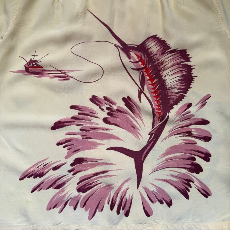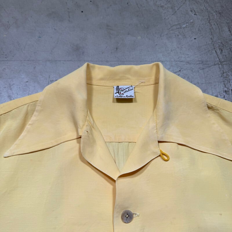 40's Catalina カタリナ レーヨンハワイアンシャツ バックパネル セイルフィッシュ カジキ フィッシング イエロー ハンドペイント シャークスキン Mサイズ ゆったりめ 名作 アロハシャツ 希少 ヴィンテージ BA-2498 RM2917H