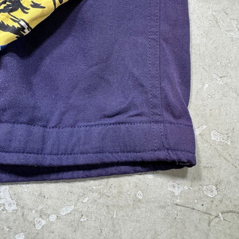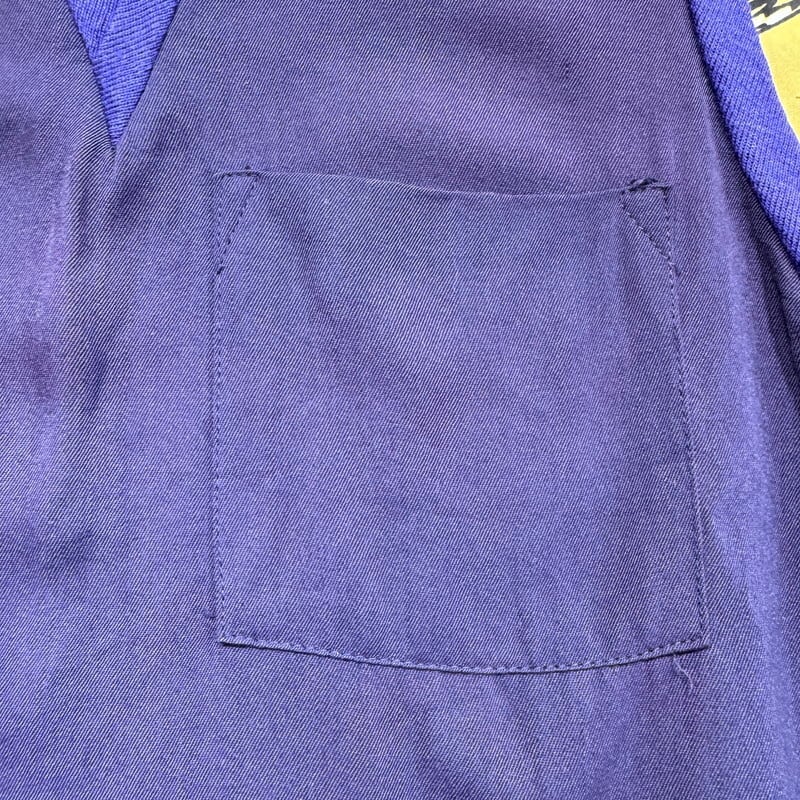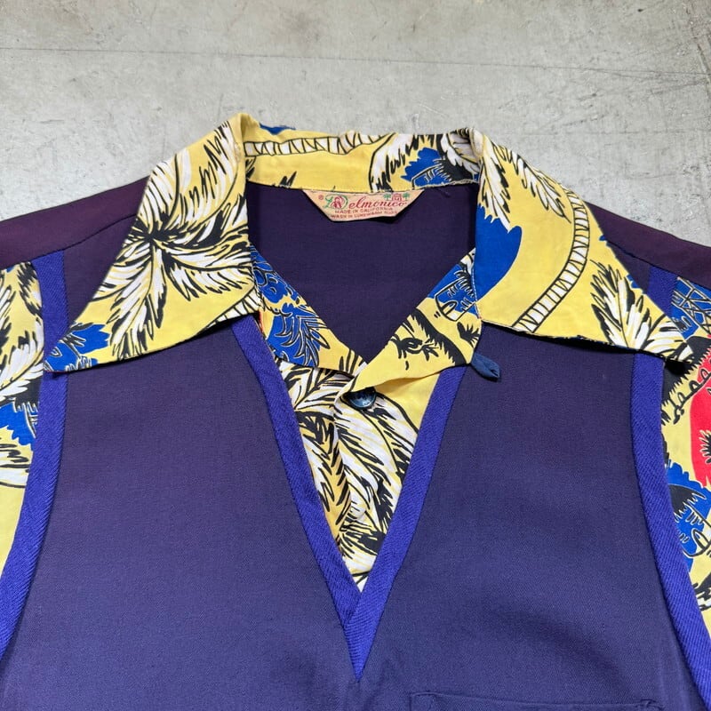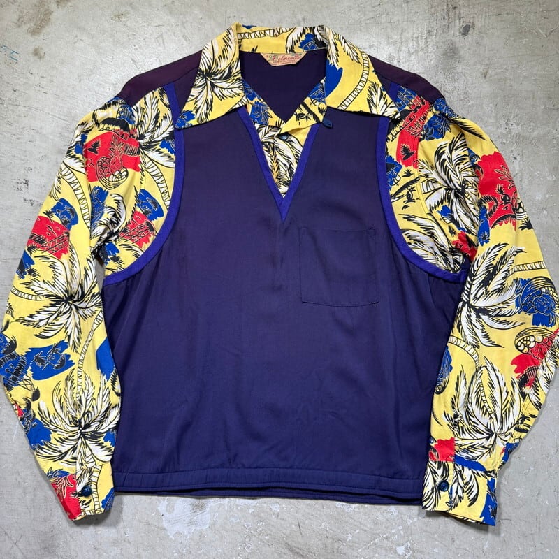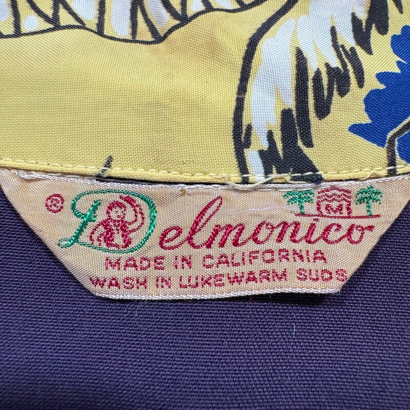 40年代から50年代頃のDelmonicoレーヨンギャバジンレイヤードプルオーバーシャツです。Delmonico社の創業年など出自は不明ですが、古い年代からハワイアンシャツやウェスタンシャツなどをカリフォルニアで製造していたメーカーのようです。ご紹介するこちらはレーヨンのハワイアンシャツとウール混のようなギャバジンのベストを合わせたようなレイヤード仕様の1着です。襟は外に広がったロングポイントで、ループボタンの開襟です。スクエア型のパty地ポケットが1つ付きます。ギャバジン部分は肩回りにフェードが見られナス紺カラーに変色しています。襟は一度リペアで裏返しに取り付け直されているようで両面共にダメージが見られます。右脇に小さなダメージがございます。その他擦れ等の使用感がございます。Mサイズ表記ですが着丈はやや短めですっきりとした印象です。ハイウェストなスラックスと合わせてロカビリースタイルで合わせてみてはいかがでしょうか。