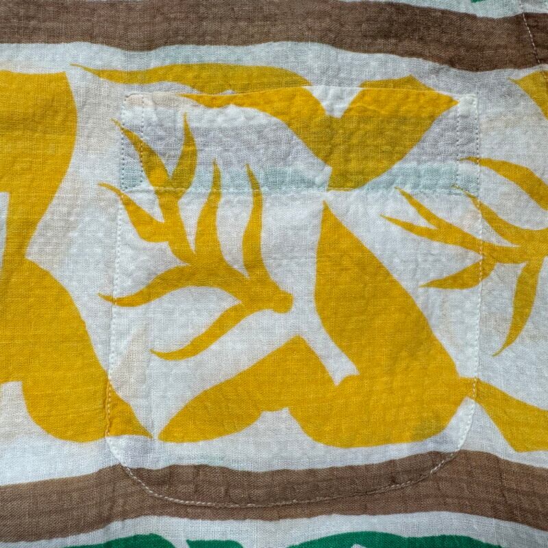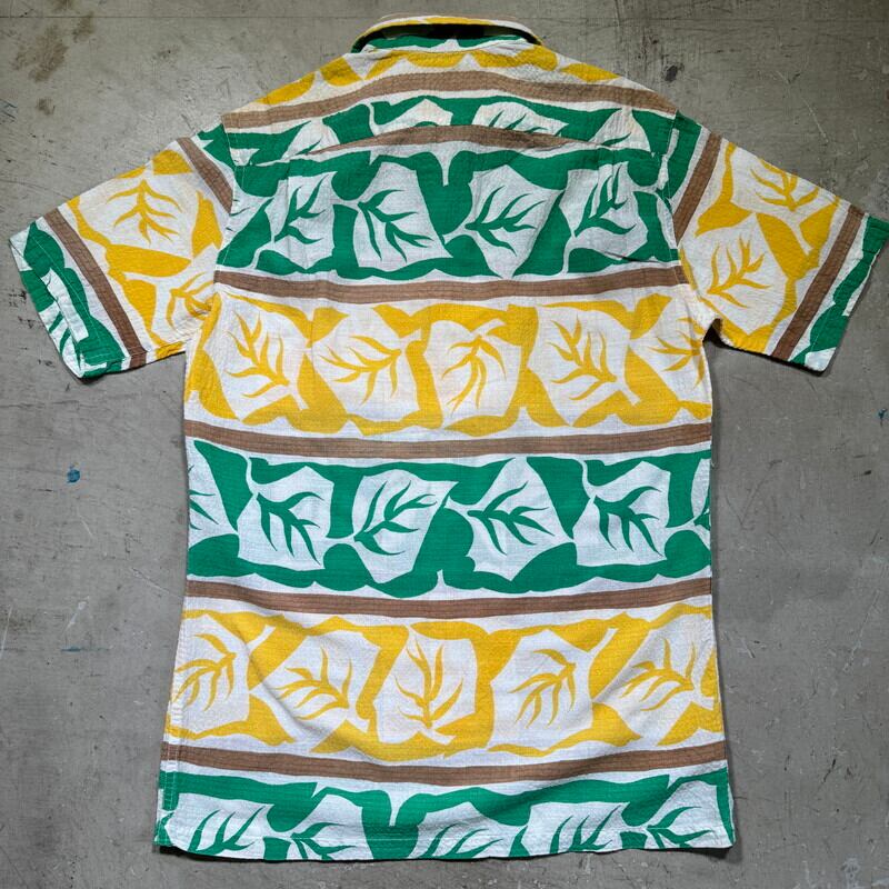 50年代頃のUnknownコットンシアサッカーシャツです。タグ欠損の為ブランドは不明です。袋縫いの丸襟で、ループボタンの開襟シャツ仕様です。フロントは樹脂ボタンが揃っています。凹凸のあるシアサッカーが使われておりますのでとても涼し気な印象です。図柄は恐らくリーフモチーフでイエローとグリーンのバランスがとても良いデザインです。全体的に色褪せがあり背面ぎ側に生地が少し擦れた箇所がございます。その他薄い細かな汚れ等ございますが、状態は良好かと思います。表記はございませんが、身幅が細く着丈の長めなS相当といったところでしょうか。身幅が細いのでボタンは閉めずさらっと羽織る位が丁度良いかもしれません。夏らしいアイテムで色味も綺麗なのでオススメです。サイズ感が合う方は是非この夏いかがでしょうか。