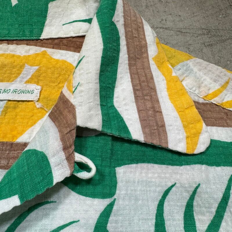 50's~ Unknown コットンシアサッカーシャツ ハワイアンシャツ 半袖 リーフモチーフ オープンカラー 開襟 イエロー グリーン ボタニカル S相当 小さめ 希少 ヴィンテージ BA-2501 RM2920H