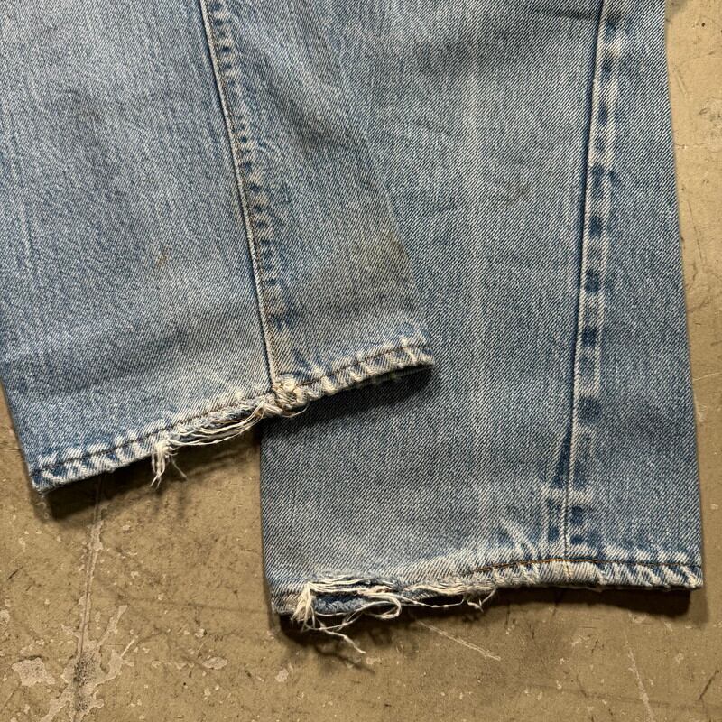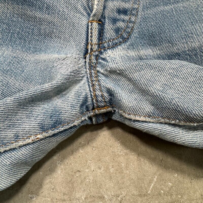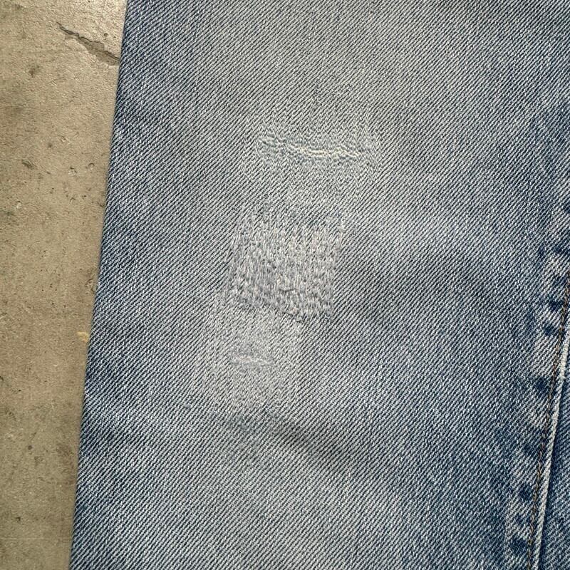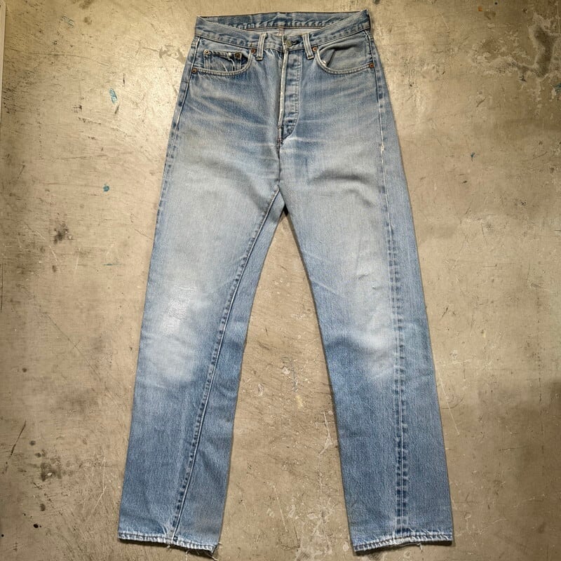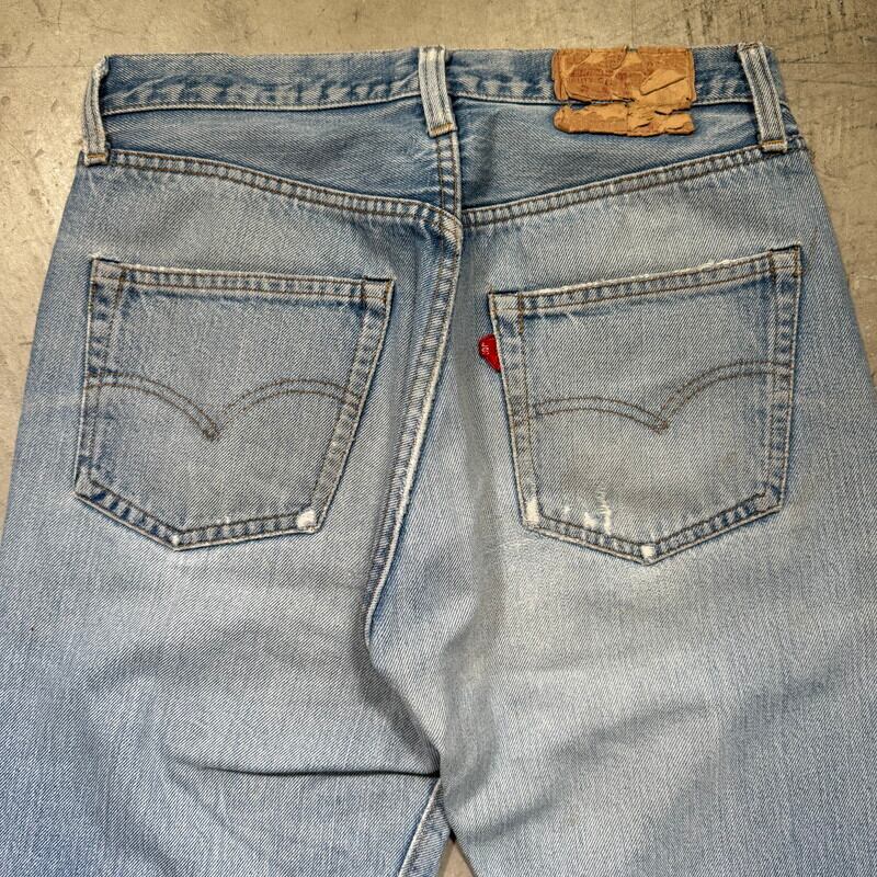 70年代から80年代のLevi's 501 デニムパンツです。トップボタン裏刻印6、ウォッチポケット裏チェーン、セルヴィッジ、赤タブスモールe、バックポケット裏チェーン。全体的に色落ちしており色残りは2~3割程度です。うっすらとヒゲが入り、アイスブルーのような色味ですのでこれからの温かい季節に使い易い1本です。フライ部分のボタンホールに若干の緩みがございます。ボタンフライ付け根や右膝、背面臀部にリペアがございます。その他バックポケットなどにも細かな擦れや裾にダメージがございます。左膝付近に細かなダメージがございます。ウエストはW30表記ですが、実寸はやや縮みがありW28インチ位です。女性も穿きやすいサイズ感だと思います。レングスは長めでオリジナルのチェーンステッチだと思われます。サイズが合う方は是非この機会にいかがでしょうか。