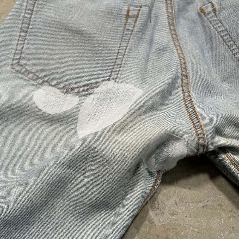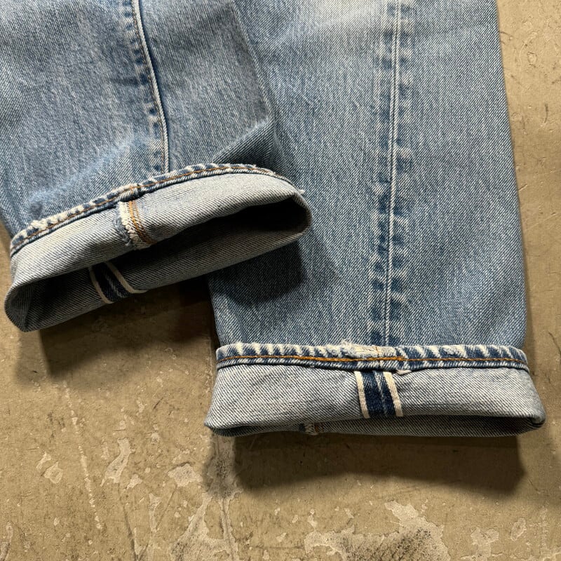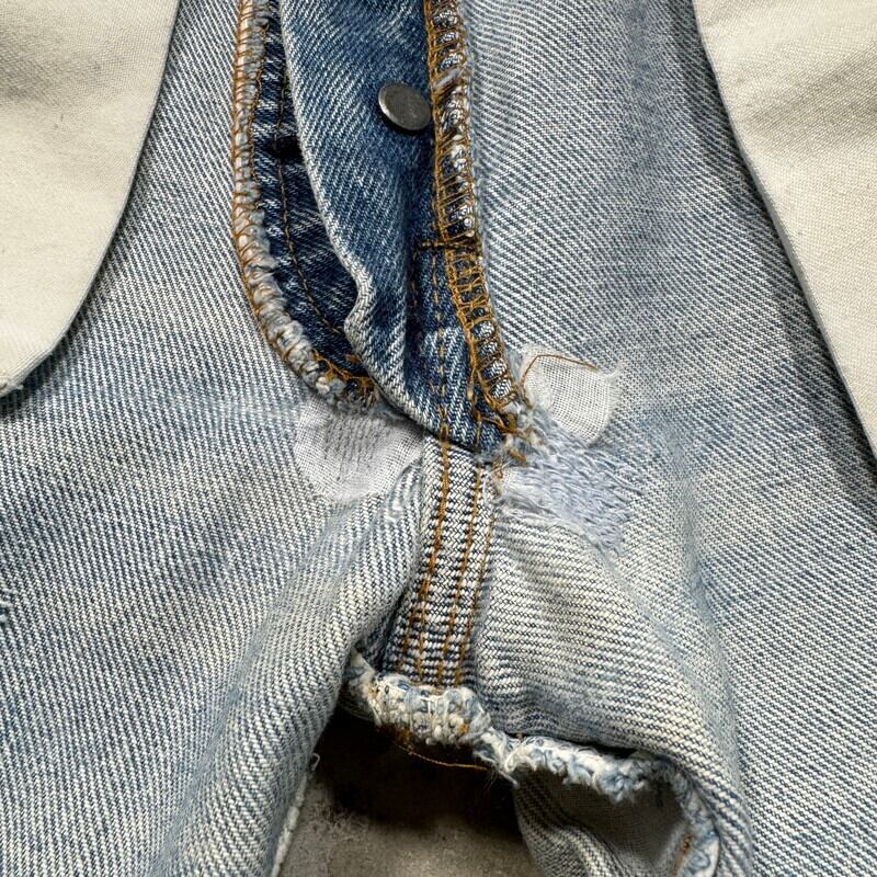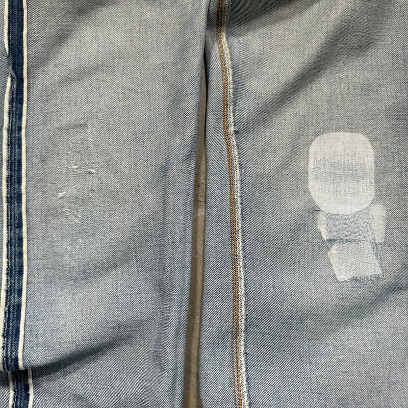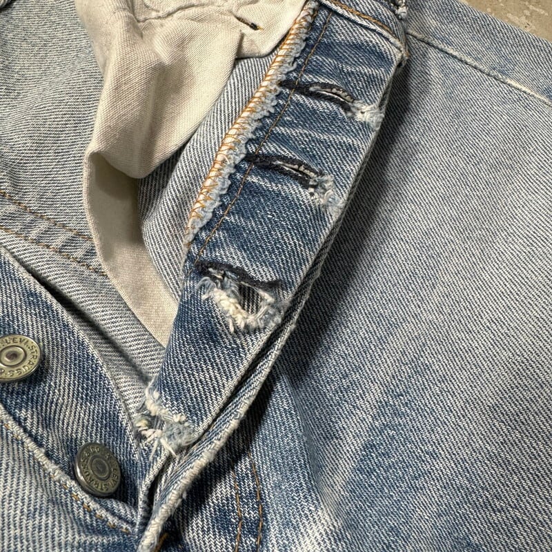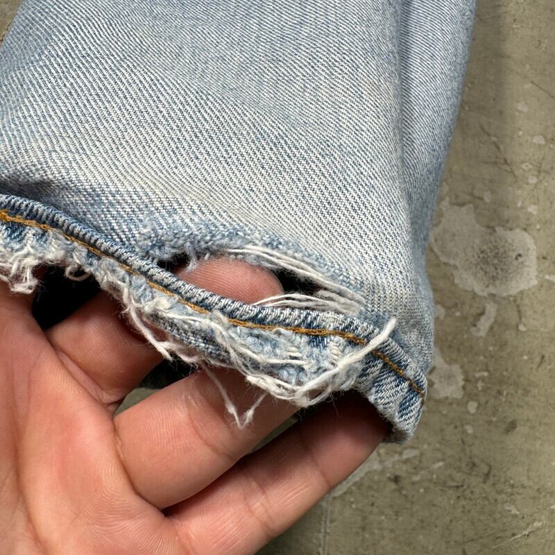 70年代から80年代のLevi's 501 デニムパンツです。トップボタン裏刻印6、ウォッチポケット裏チェーン、セルヴィッジ、赤タブスモールe、バックポケット裏チェーン。全体的に色落ちしており色残りは2~3割程度です。うっすらとヒゲが入り、アイスブルーのような色味ですのでこれからの温かい季節に使い易い1本です。フライ部分のボタンホールに若干の緩みがございます。ボタンフライ付け根や右膝、背面臀部にリペアがございます。その他バックポケットなどにも細かな擦れや裾にダメージがございます。左膝付近に細かなダメージがございます。ウエストはW30表記ですが、実寸はやや縮みがありW28インチ位です。女性も穿きやすいサイズ感だと思います。レングスは長めでオリジナルのチェーンステッチだと思われます。サイズが合う方は是非この機会にいかがでしょうか。