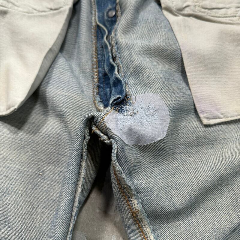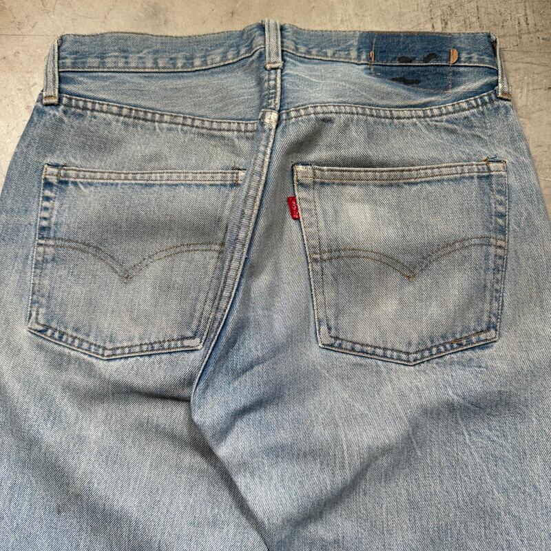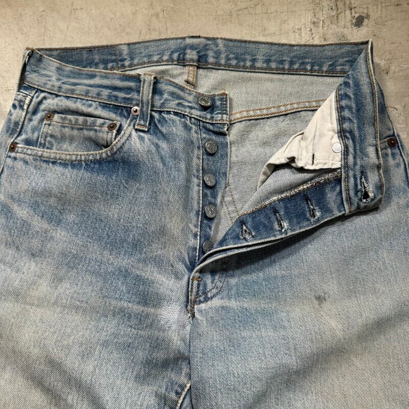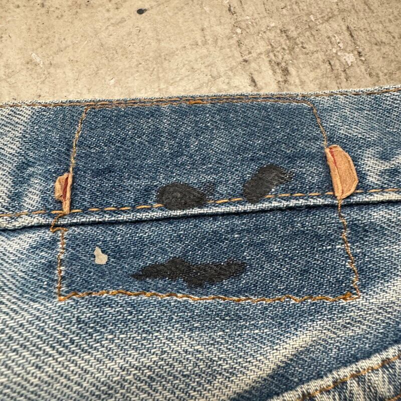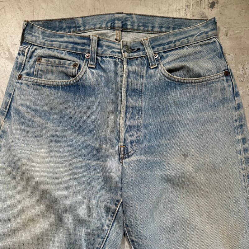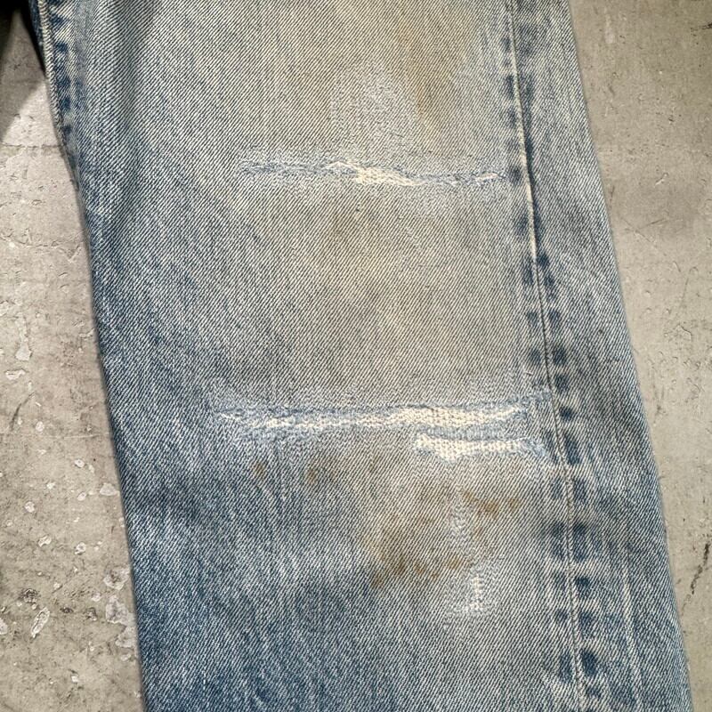 70年代から80年代のLevi's 501 デニムパンツです。トップボタン裏刻印6、ウォッチポケット裏チェーン、セルヴィッジ、赤タブスモールe、バックポケット裏チェーン。全体的に色落ちしており色残りは2~3割程度ですが薄汚れやリペア等も相まって雰囲気の良い1本です。股付け根や右脛、左膝にリペアがあり、その他細かな擦れ等ございます。ウエストはW32表記ですが、実寸はW30インチですので男女共に穿きやすいサイズ感です。コンディションこそ良い訳ではありませんが、リペアをしながら長く穿いていただきたい1本です。