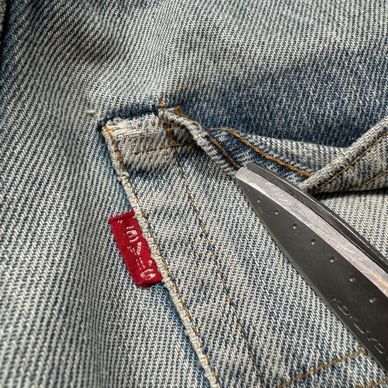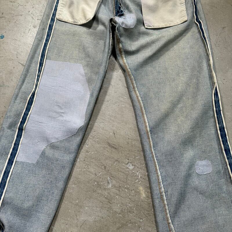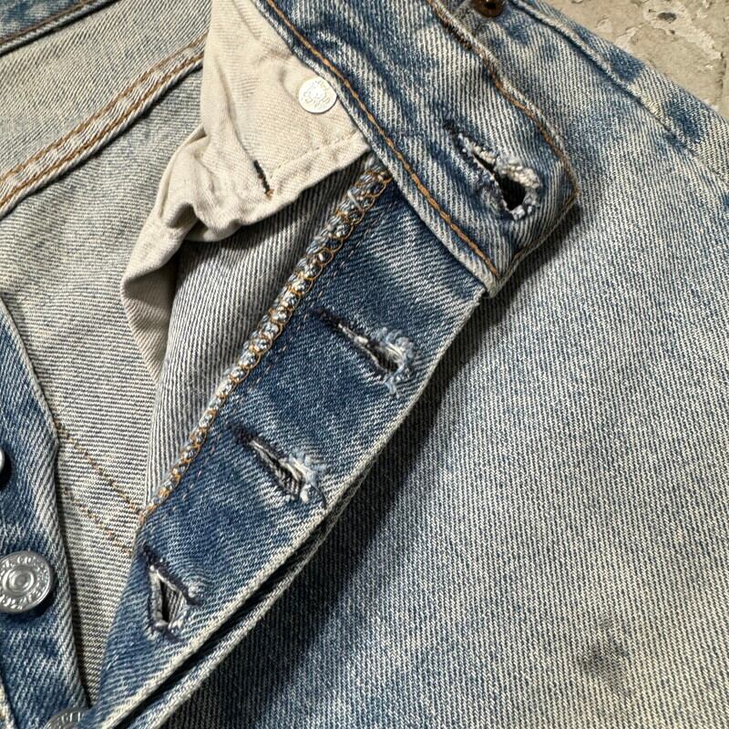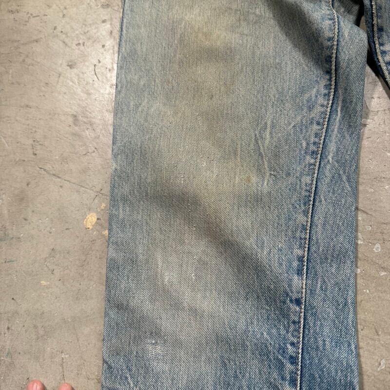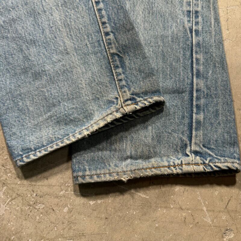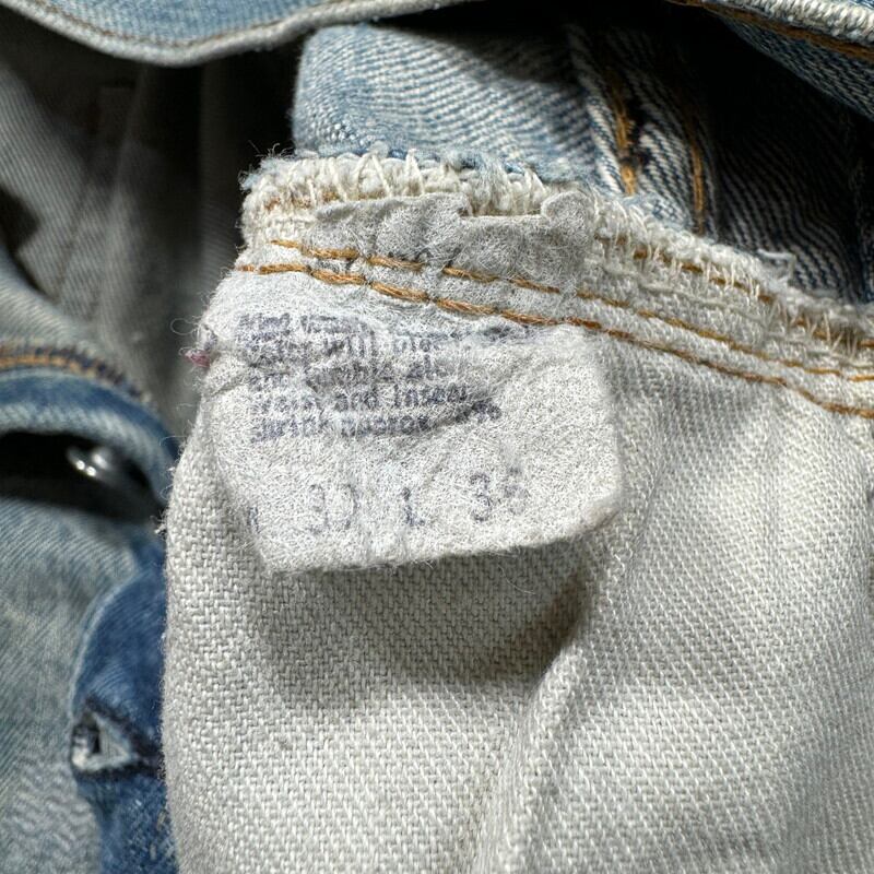 70年代から80年代のLevi's 501 デニムパンツです。トップボタン裏刻印6、ウォッチポケット裏チェーン、セルヴィッジ、赤タブスモールe、バックポケット裏チェーン。全体的に色落ちしており色残りは2~3割程度ですが薄汚れやリペア等も相まって雰囲気の良い1本です。股付け根や右脛、左膝にリペアがあり、その他細かな擦れ等ございます。ウエストはW32表記ですが、実寸はW30インチですので男女共に穿きやすいサイズ感です。コンディションこそ良い訳ではありませんが、リペアをしながら長く穿いていただきたい1本です。
