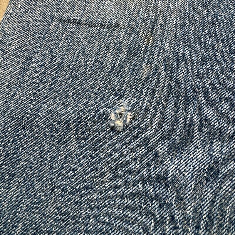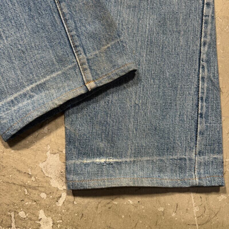 70年代のLevi's 501デニムパンツです。トップボタン裏刻印6、バックポケットシングル、セルヴィッジ、アウトシーム裏シングル×チェーン、赤タブスモールe。所謂66前期モデルで全体的に使用感が有り、両腿、両膝。股付け根、背面臀部などにたくさんリペアが施されたグランジ感溢れる1本です。擦れや細かなもあり、紙パッチはハンドステッチで留められています(店頭販売しており、試着に伴いパッチの形状が変わるかもしれませんのでご了承ください)。ハンドリペアの緩い感じも雰囲気が良く、これからの季節に是非合わして頂きたい1本です。レングスはシングルで裾アげされています。ウエストは実寸でW31インチです。カート・コバーンのようなグランジファッションがお好きな方には是非お勧めしたいデニムです。