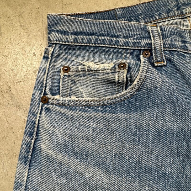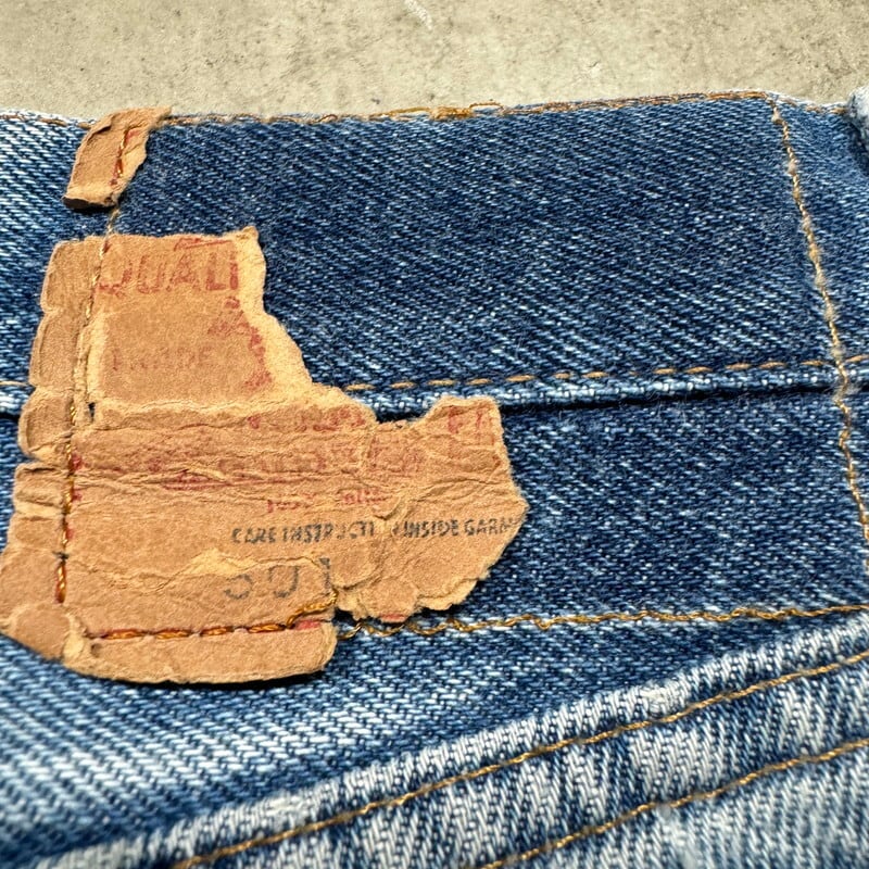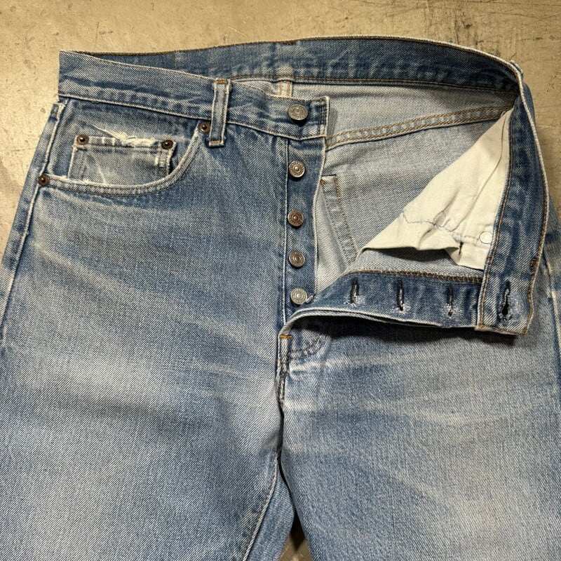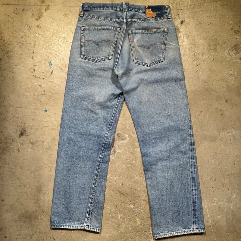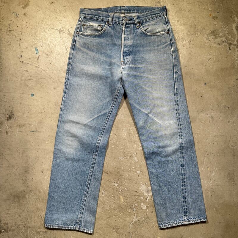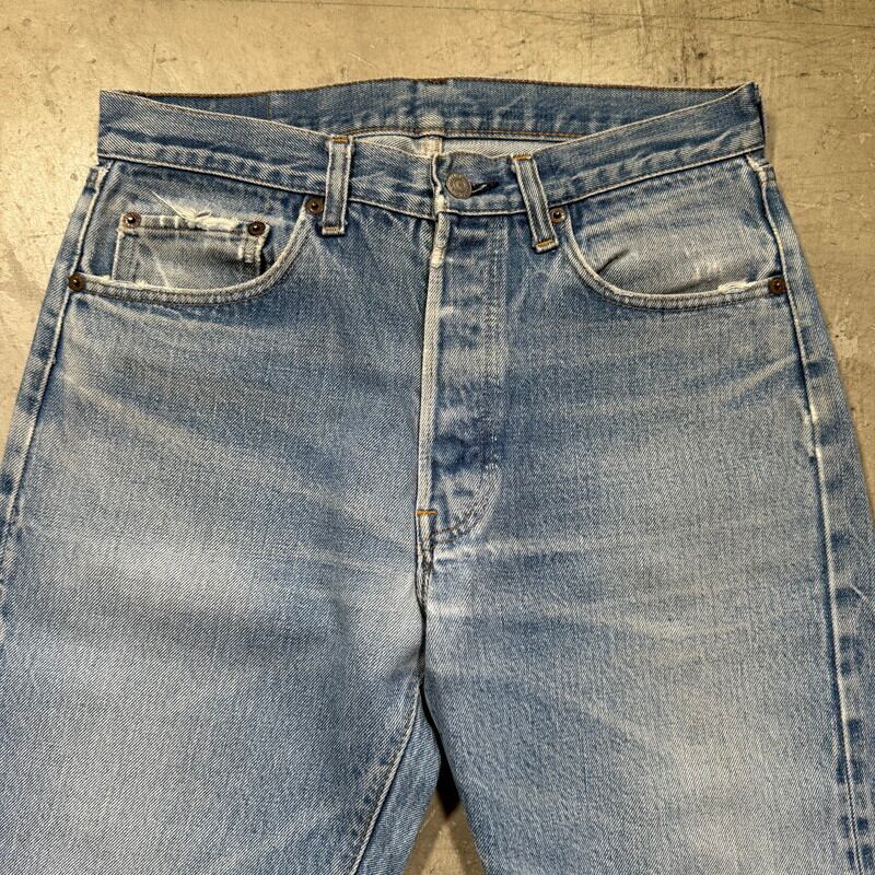 70年代のLevi's 501デニムパンツです。トップボタン裏刻印6、バックポケットチェーン、セルヴィッジ、アウトシーム裏シングル×チェーン、赤タブスモールe。所謂66後期モデルで色残りは3~4割程ですがうっすらとヒゲが入ります。紙パッチは3/4程欠損しています(店頭販売しており、試着に伴いパッチの形状が変わるかもしれませんのでご了承ください)。フライのボタンホールや左膝にリペアがございますが、とても丁寧に施されています。その他ポケットや裾等に擦れやダメージが見られます。レングスは恐らくオリジナルのチェーンステッチだと思われます。ウエストの表記はW31ですがやや縮みがあり実寸はW30インチです。大きいサイズではございませんが全体的なバランスの良い1本だと思います。夏らしい色味ですのでお探しだった方は是非この機会にいかがでしょうか。