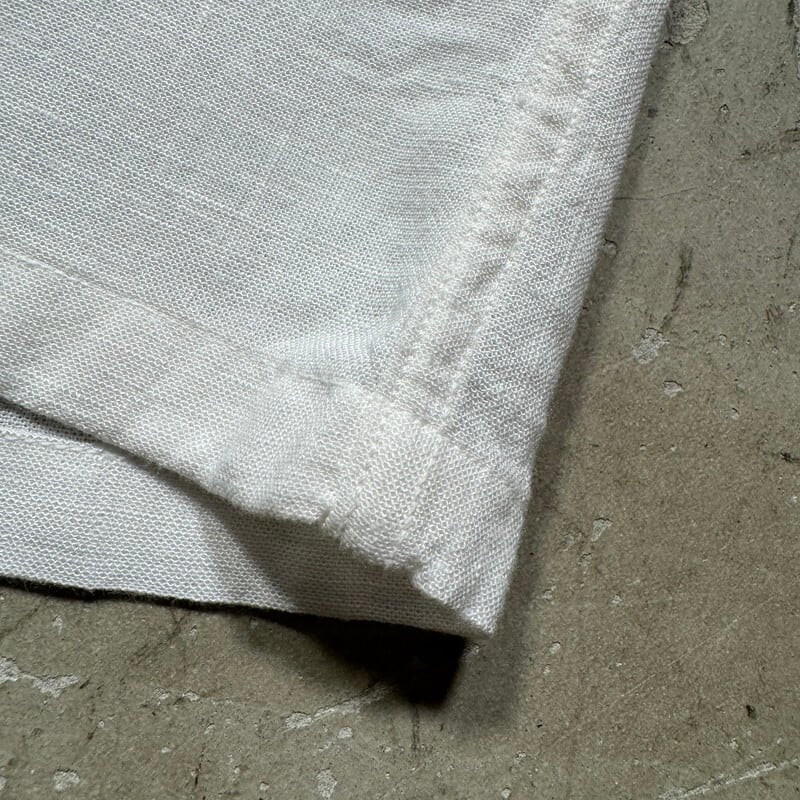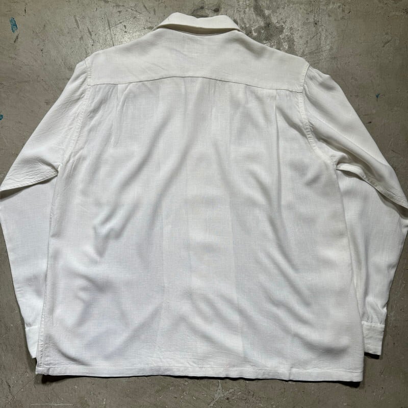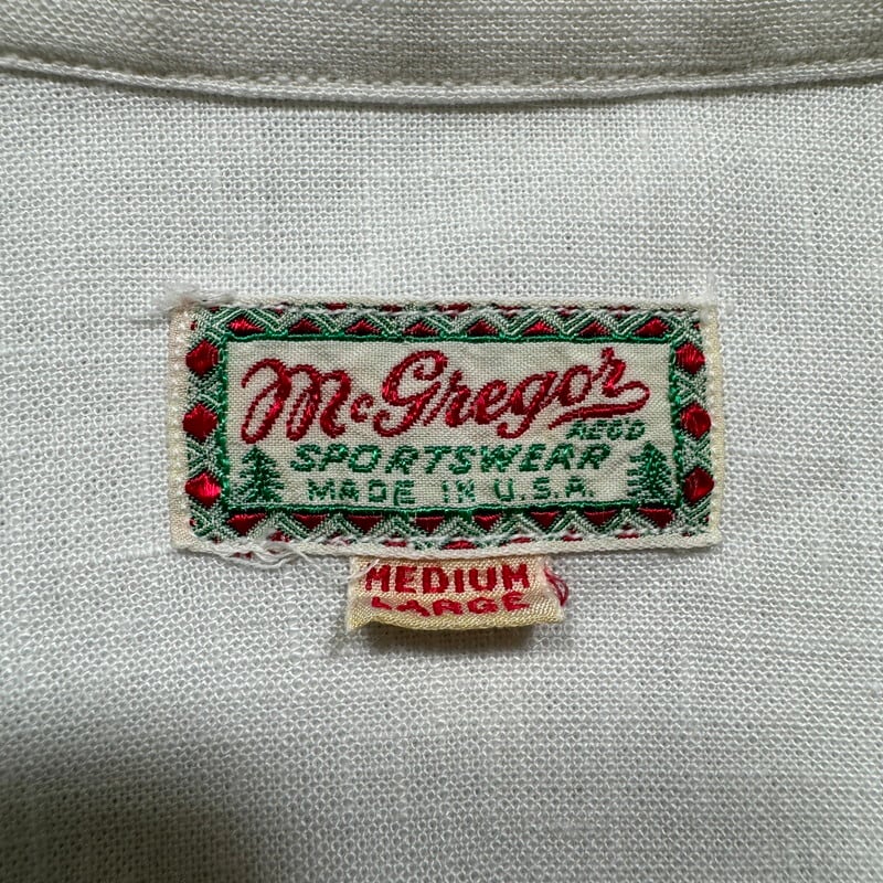 40年代頃のMcGREGORコットンオープンカラーシャツです。McGREGORは1921年に創業した、100年を越える老舗アメリカンカジュアルブランドです。ご紹介するこちらは古い年代の筆記体タグが付き、ロングポイントと呼ばれる外に長く広がった襟やループボタンの開襟仕様です。コットンガーゼのような素材で一見ただの無地の様ですが、光にかざすと絣柄が入っているのが分かります。ごく僅かな薄汚れが襟元にあり、ステッチ部分に若干の擦れがございます。左腹部に小さな引っ掛かり傷のような箇所がございます(穴は開いていません)。その他目立つ汚れやダメージはございません。MEDIUM LARGE表記で程よく身幅が有り着やすいサイズ感だと思います。オールホワイトのオープンカラーシャツは有りそうであまり見かけないかなと思いますので、白シャツをお探しだった方は是非いかがでしょうか。暑くなるこれからの季節にお勧めな1着です。